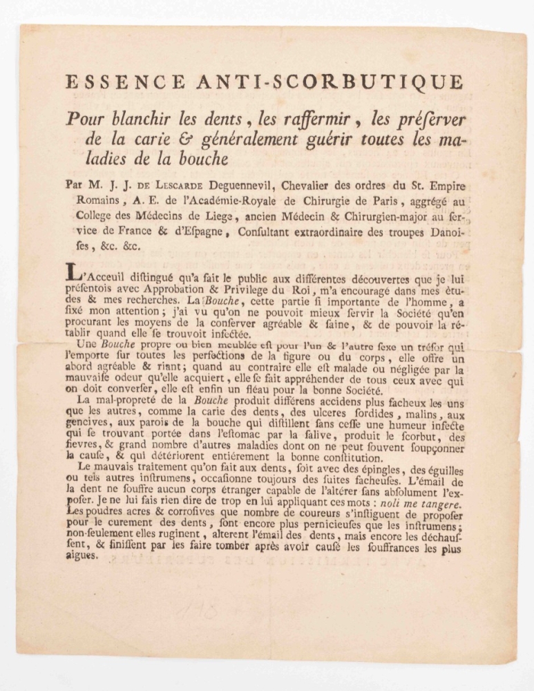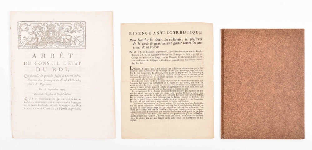 Bound w.: La Gazette de la Place Maubert ou suite de la Gazette des Halles (...). Seconde nouvelle. Ibid., idem, 1649, 12 p. Bound w.: Suite de la Gazette de la Place Maubert par l'Autheur de la Gazette des Halles (...). Ibid., idem, 1649, 14 p. 3 rare, early newspapers. (4) J.J. de Lescarde Deguennevil. Essence anti-scorbutique. Pour blanchir des dents, les raffermir, le préserver de la carie & généralement guérir toutes les maladies de la bouche. Liege, "avec permission des superieurs", n.d. (ca. 1790). Letterpress leaf printed on both sides, 23 x 18 cm. Folded twice, sm. tears along folds. Extremely rare pamphlet on newly discovered medicine for dental hygiene. (5) 1 other pamphlet, prohibiting the import of "fromages de Nord-Hollande" in France, Paris, 1779, 3 p. (total 5 titles in 3 vols.)