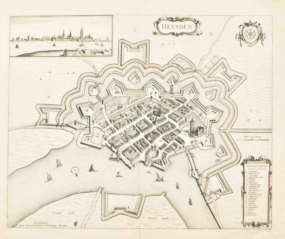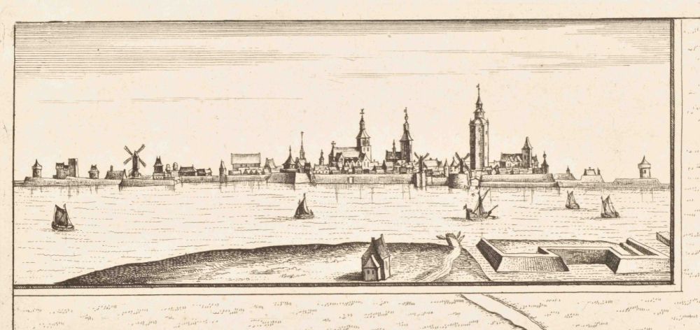 Plan in bird's eye view taken from Joan Blaeu's "Stedenboek". Amst., 1649. 42 x 53.5 cm. Cartouche w. title on plan, coats of arms and legenda, verso Dutch text.