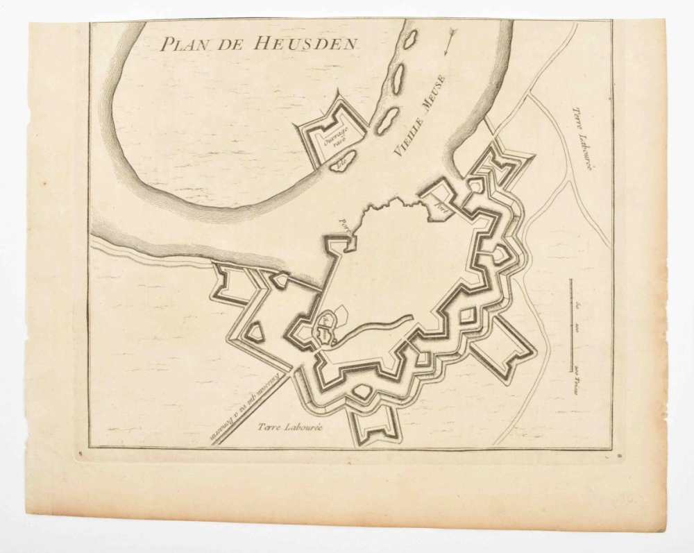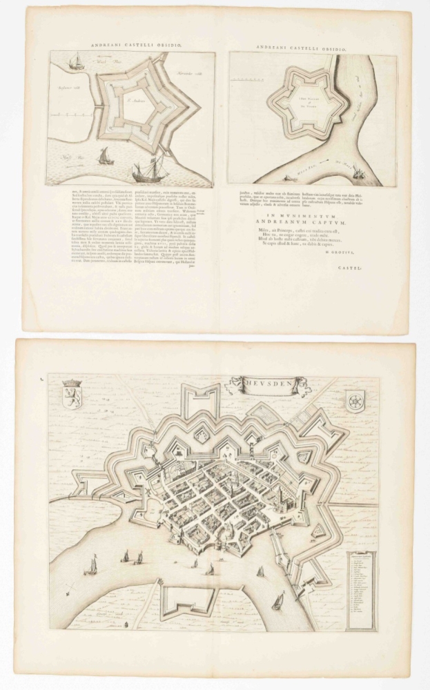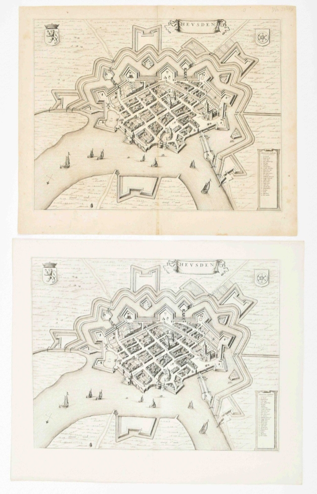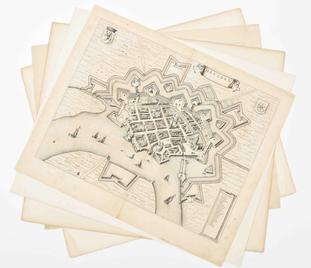 (2) and (3) 2 more of the same, 1 w. Dutch and 1 w. Latin text. (4) Heusden, bird's eye view w. inset view on Heusden seen from the river. Amst., J. Covens and C. Mortier, ca. 1700. 42 x 51 cm. Cartouche w. title, coat of arms and legenda, printer's mistake right from center fold, verso blank. Some faults but overall in good condition. -and 2 more. (total 6)