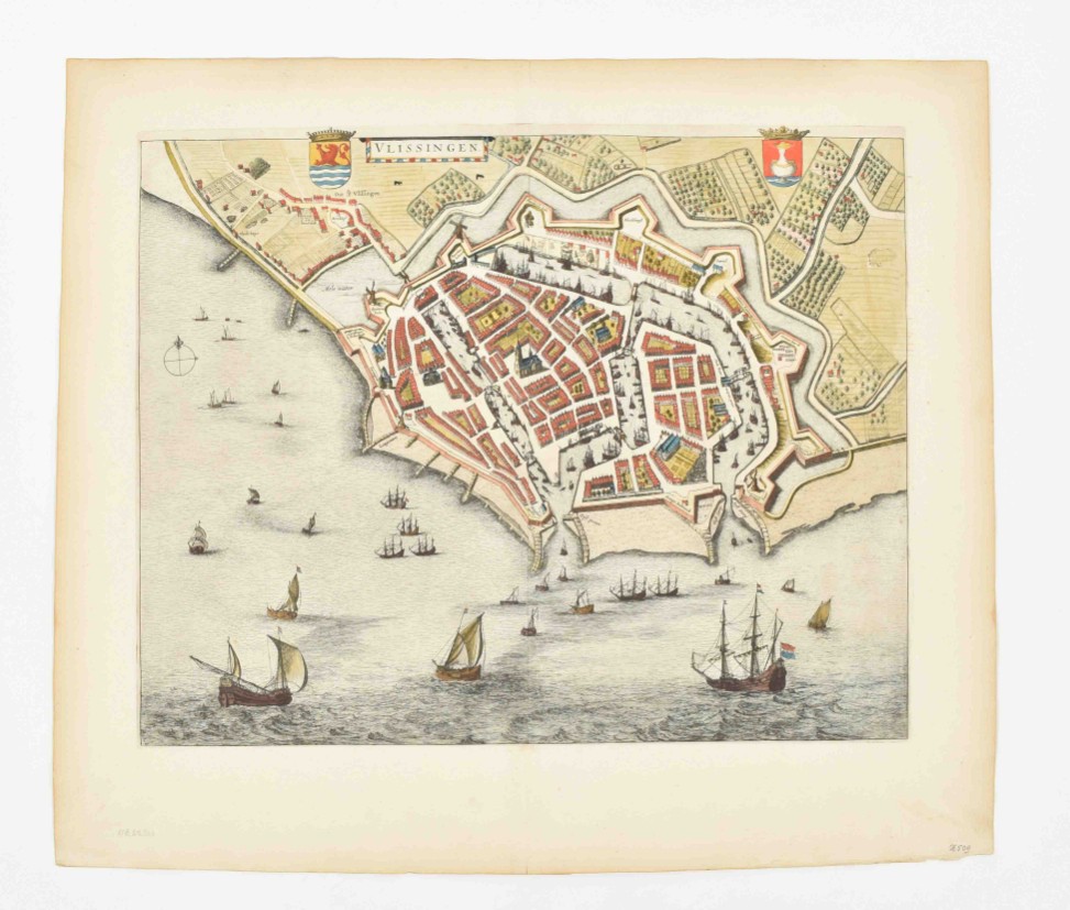 Verso Flissinga. Double folio plan from a Latin ed. of the "Stedenboek". Amsterdam, 1649. 42 x 52 cm. Col.