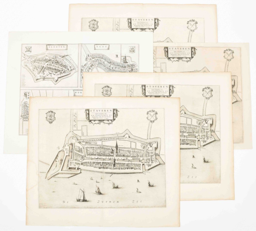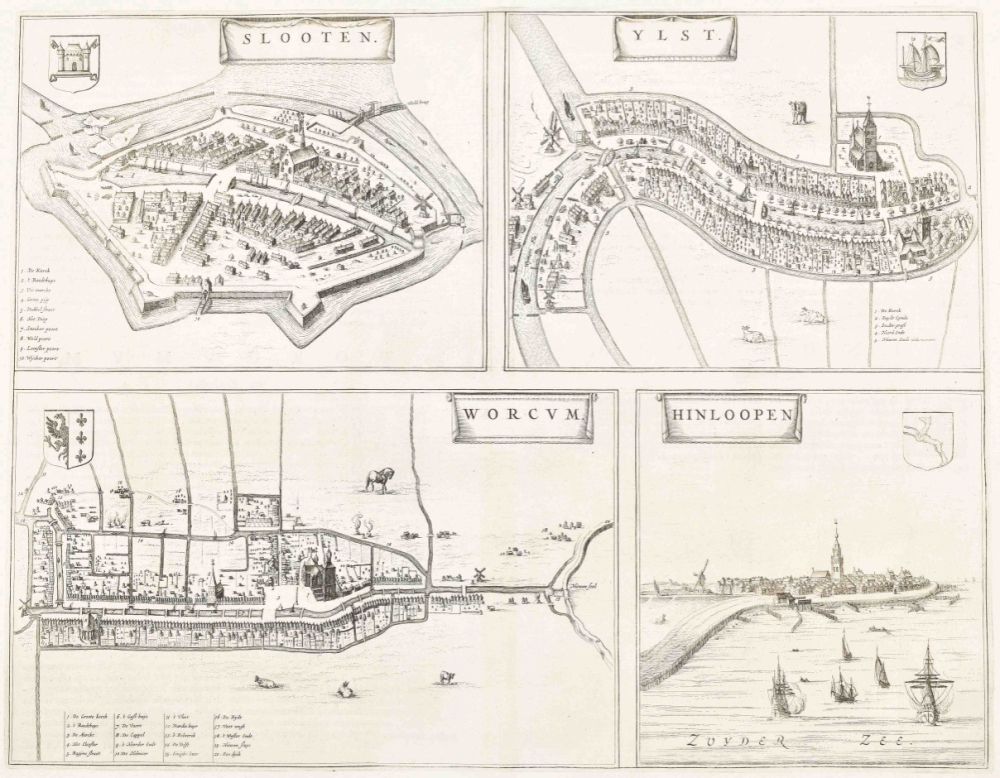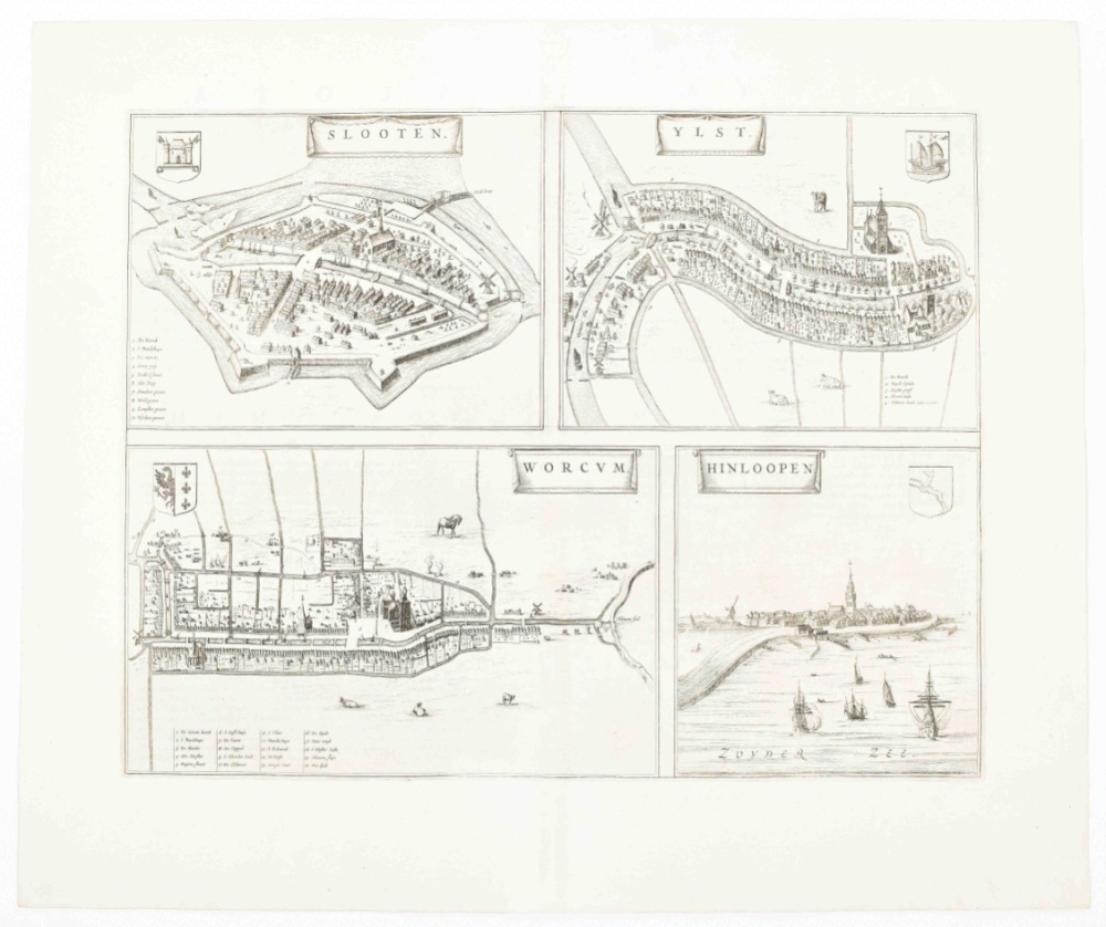 (3) and (4) The same from a Latin ed. of the "Stedenboek" or Novum ac magnum theatrum urbium, the Latin text by Ubbo Emmius. Added: A double folio leaf w. the towns of Slooten, Ylst, Worcum and Hinloopen by J. Blaeu from a Latin ed. of the same. A few minor faults and waterst. The Slooten leaf washed. (total 5)