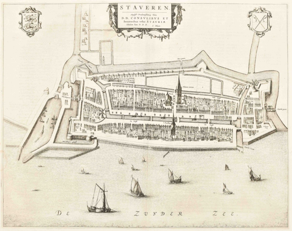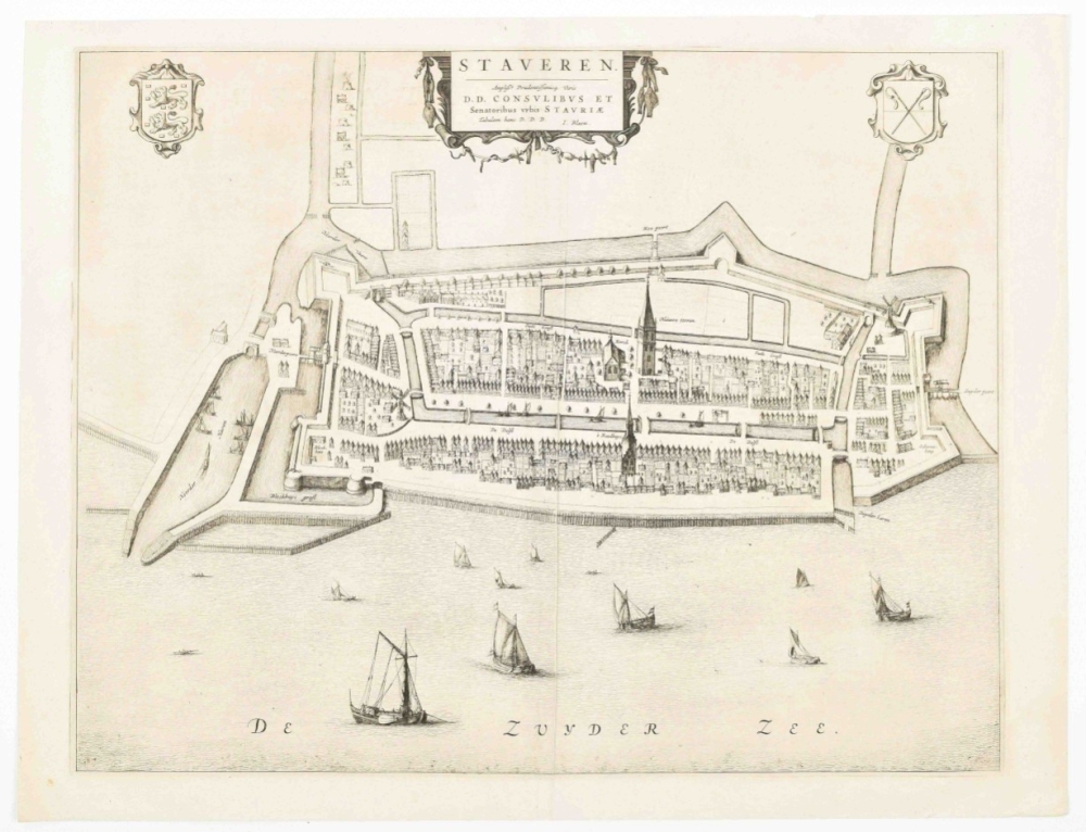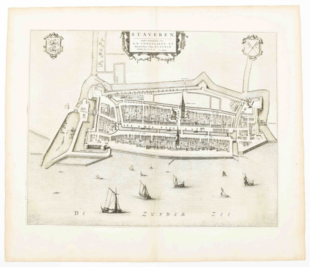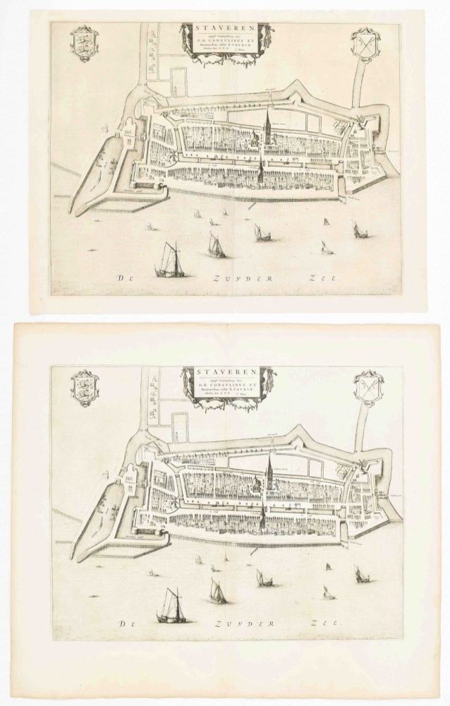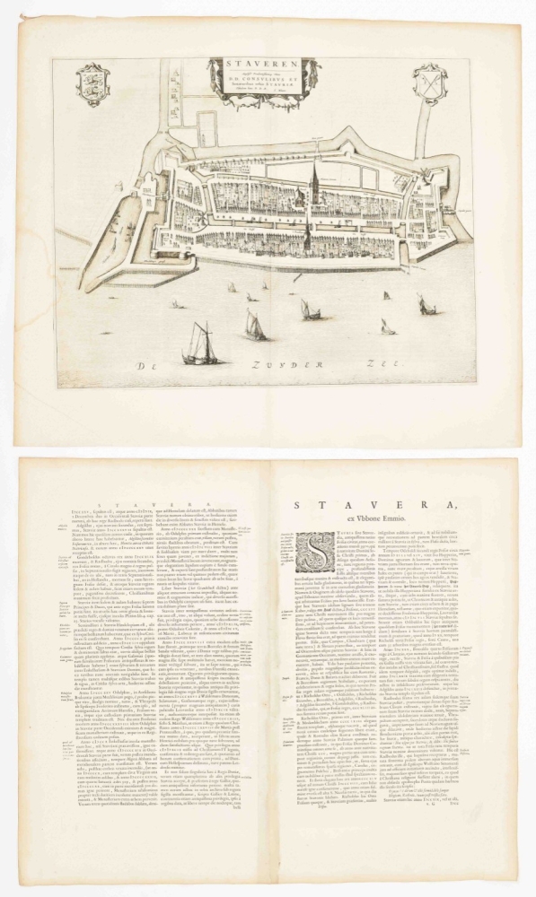 (1) and (2) 2 double folio town plans by J. Blaeu from the Dutch ed. of the "Stedenboek" or Tooneel der Steden. Amst., 1649. Cartouche w. title, coats of arms of Friesland and Stavoren.