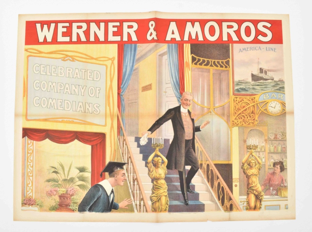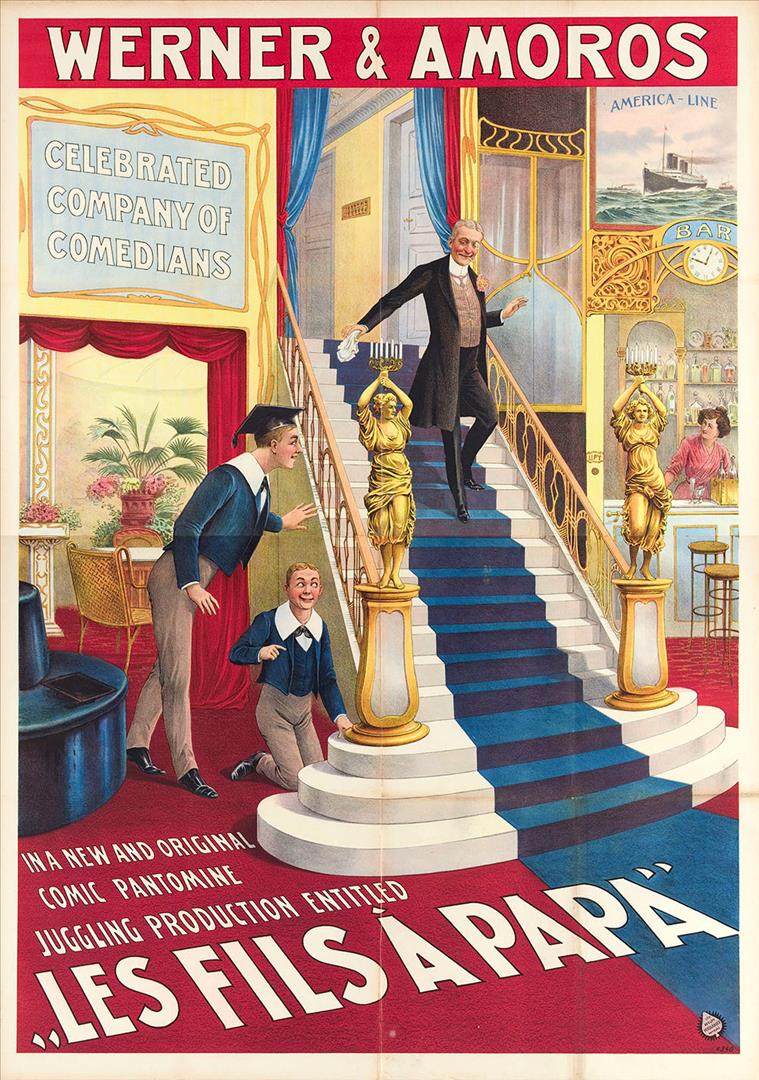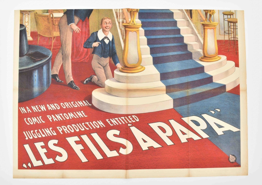 celebrated company of comedians. In a new and original comic pantomine juggling production entitles "Les fils a Papa". Friedländer, Hamburg, 1908. 2 loose parts, each ca. 96 x 71 cm. Lith. no. 4340.