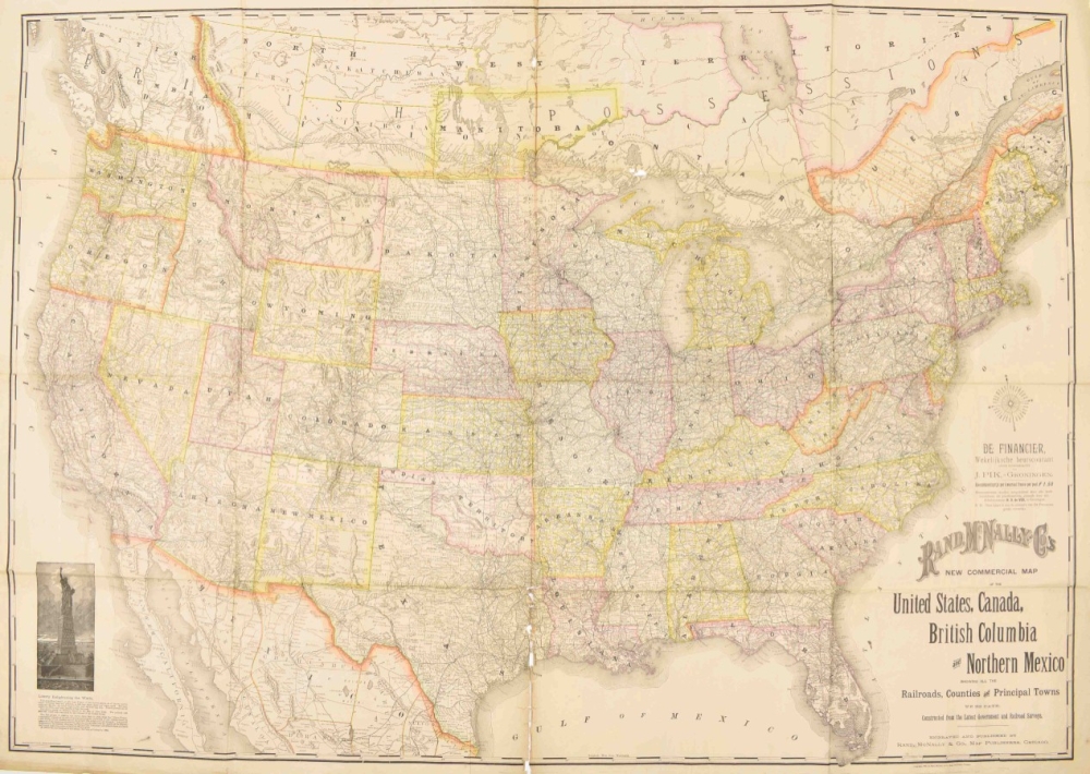 Map image 96 x 136 cm. Col. steel engr. w. Statue of Liberty and title in left and right below, respectively. Folded, thin paper, some paper loss along the folds; shabby copy.