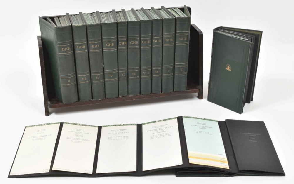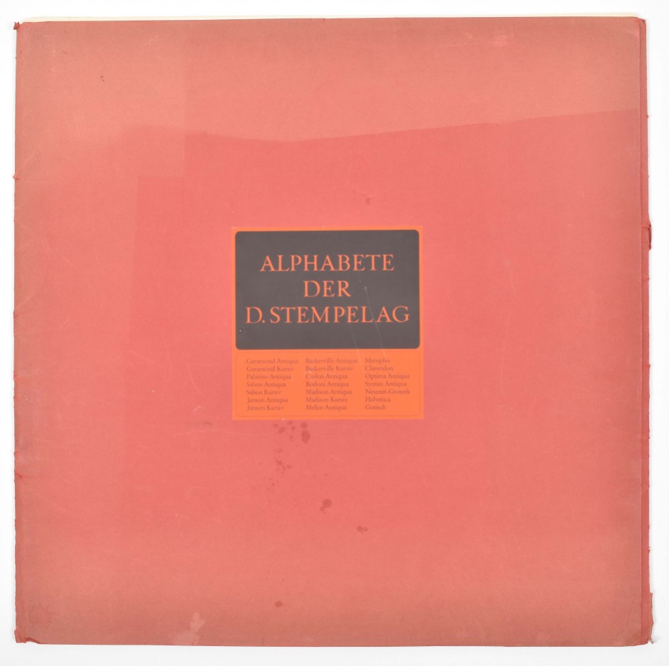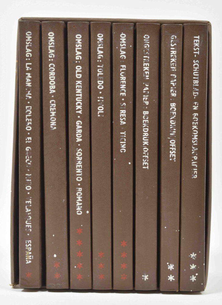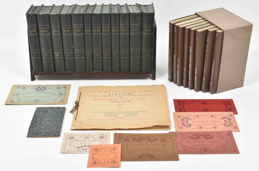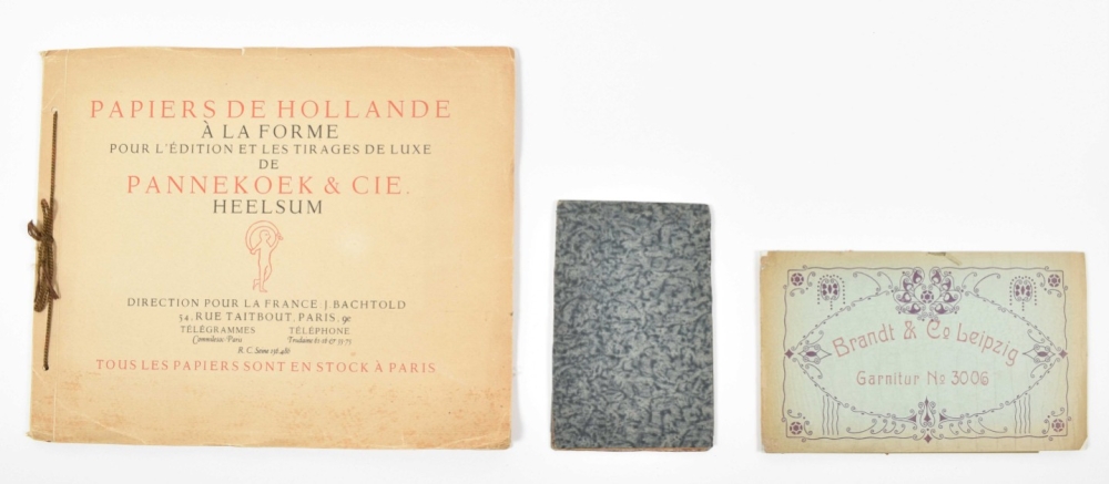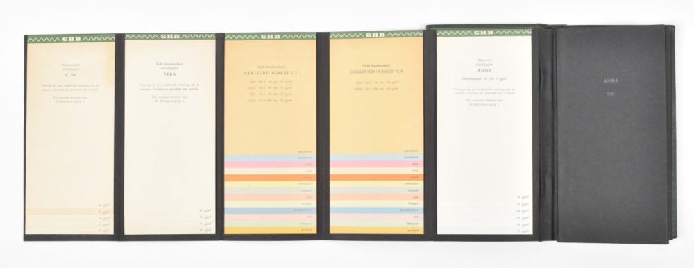 With: (2) Lutkie & Smit Papiergroothandel nv, Amst. Papieren met een eigen signatuur Monster set. 8 faux leather booklets in (dam.) cassette. Added: (3) Alphabete der D. Stempelag. Folio (55 x 55 cm) folder w. 20 plates, D. Stempel AG, Frankfurt am Main, ca. 1970. (4) Brandt & Co, Leipzig Garnitur No. 3006. Sm. sample folder (dam. and restored) incl. 13 Art Deco paper samples. (5) Papiers de Hollande à la Forme pour l'édition et les tirages de luxe de Pannekoek & Cie, Heelsum. Cord-bound ca. 1948. -and 1 more untitled sample booklet. (total 6)