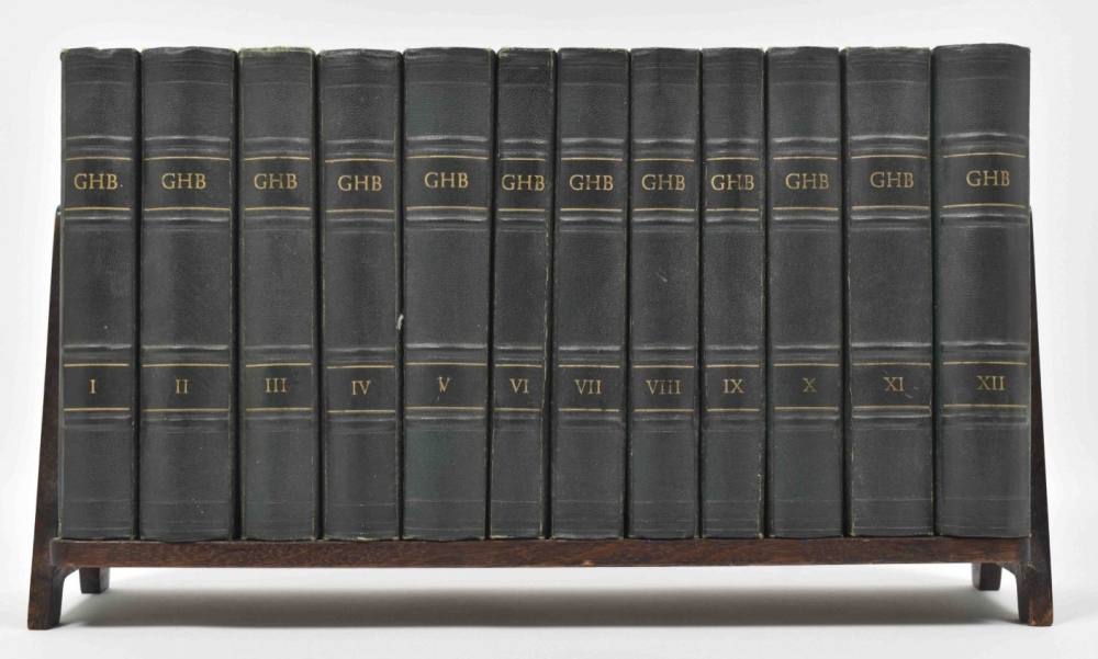 Complete set of XII paper sample faux leather folders in wooden case, ca. 1955.