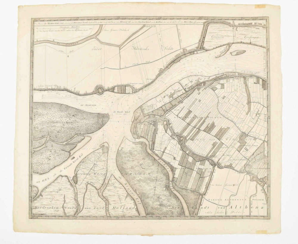 The first 2 maps w. tape stains in blank margins and generally sl. stained, all w. vertical folds as publ. Rare complete set of 3 maps, of which the first 2 can be joined together to form one large map. This map set a standard for Dutch river mapping to help find a solution to the frequent flooding of a vast low-lying area along the south river bank called the Biesboch.