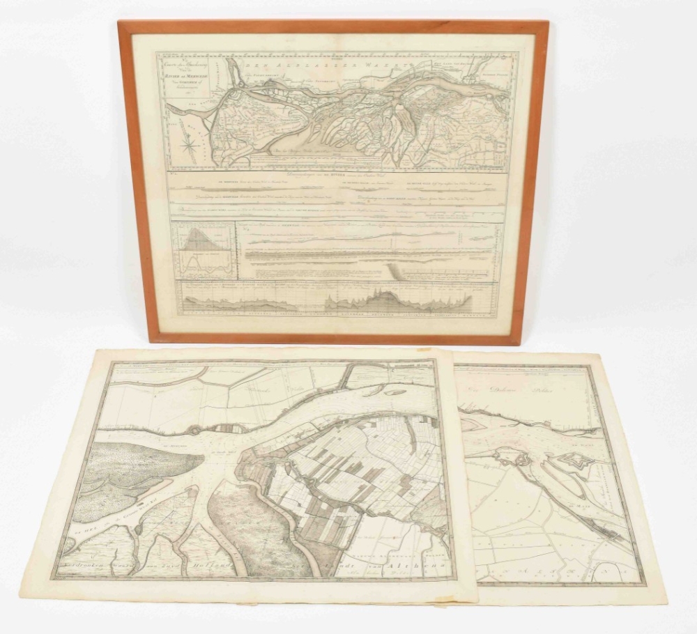 (1) De rivier de Merwede van (omtrent) de Steenen-Hoek, oostwaards-op, tot verby het dorp van Sleeuwyck (...). (2) De rivier de Merwede, van even boven het dorp Steenwyk (...) en Loevesteyn, etc. (3) Caarte ofte afteeckening van de rivier de Merwede van Gorinchem af benedenwaarts, etc. N.pl., ca. 1730. 53.5 x 64 cm (2) and 53 x 63 cm. Final map framed.