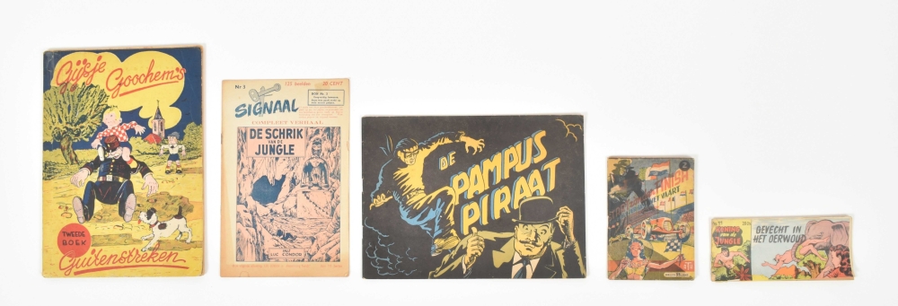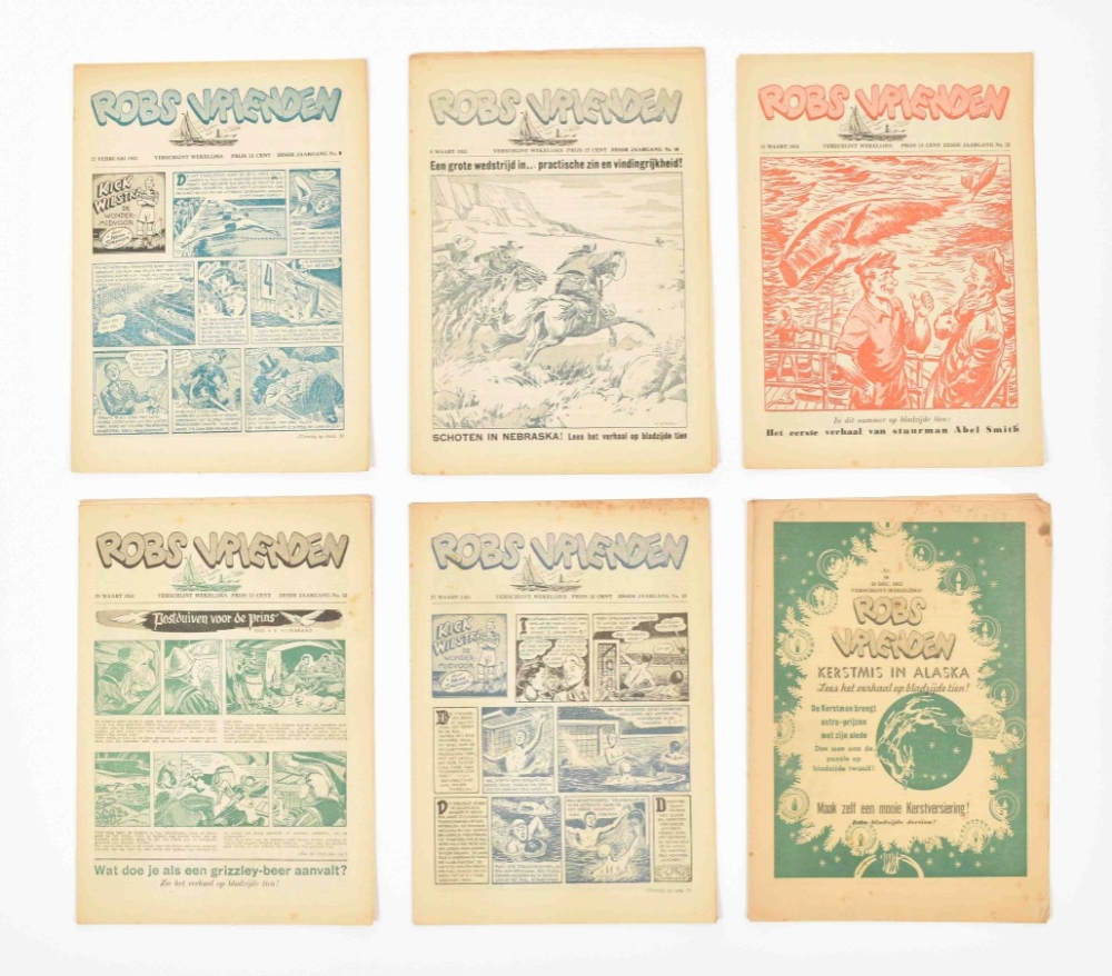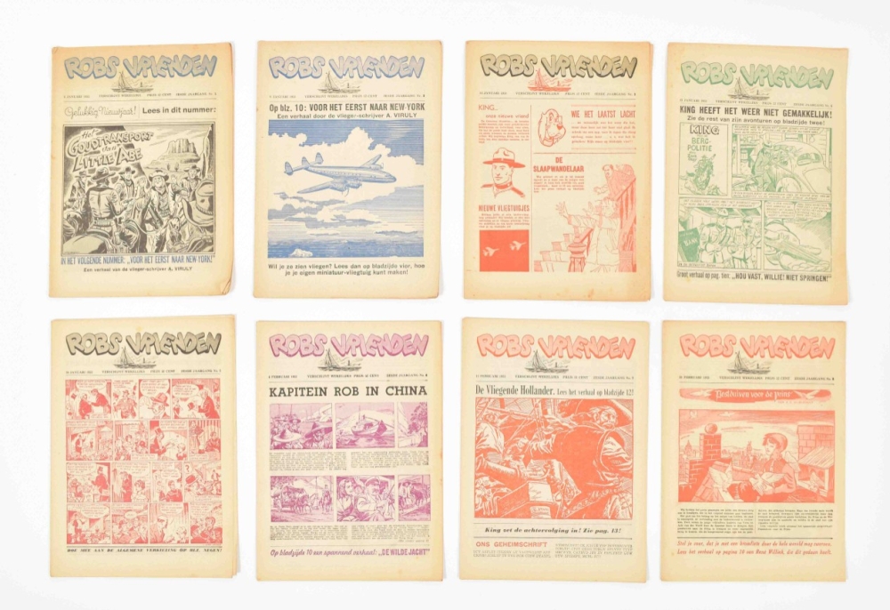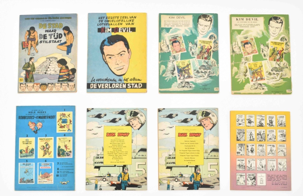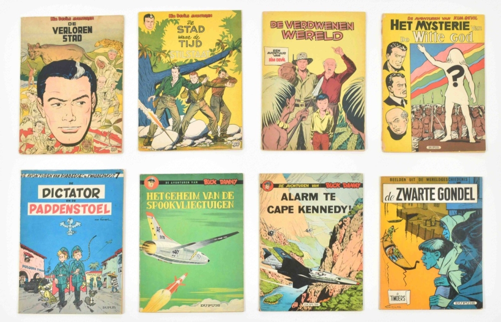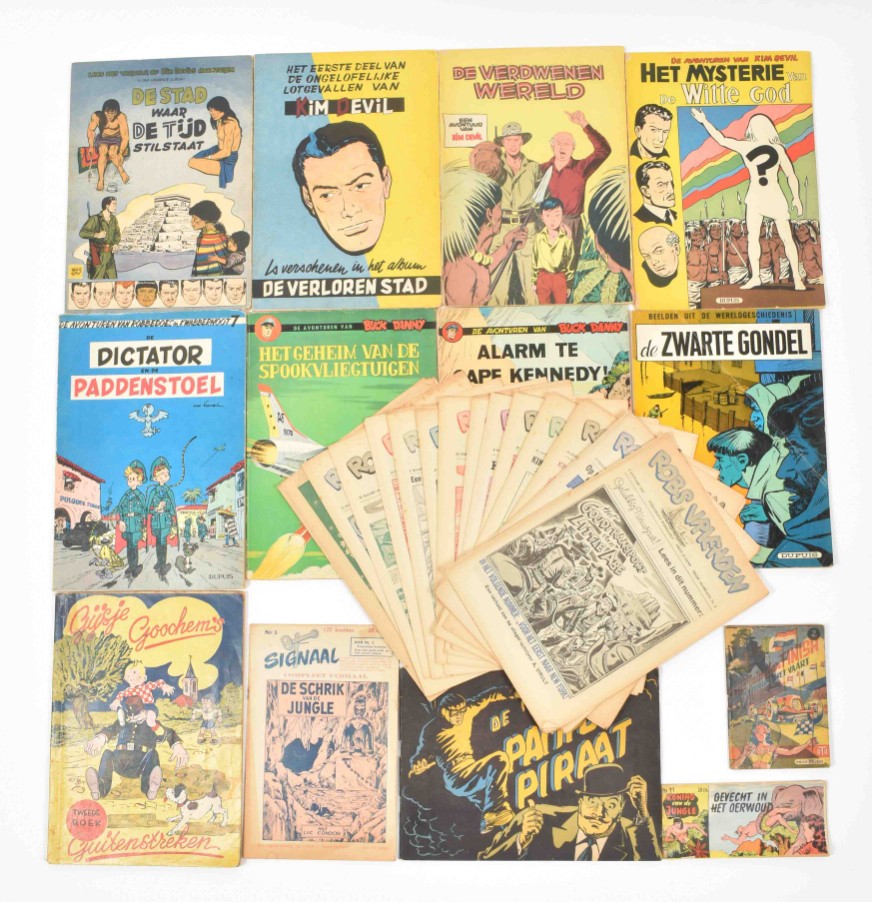 Lot including (1-4) Charlier/Forton. Kim Devils avonturen vol. 1-4, Dupuis, 1955-57. Some traces of use. (5) Franquin. De avonturen van Robbedoes en Kwabbernoot 7. Dupuis, 1956. -and 3 more. With: (6) J.D. van Exter. Rikki Visser. De Pampuspiraat, Groninger Dagblad, 1947. (7) Jac Grosman Gijsje Goochem's Guitenstreken. Tweede Boek, 1937. (8) 14 vols. Robs Vrienden, 1952/53 -and 3 more.