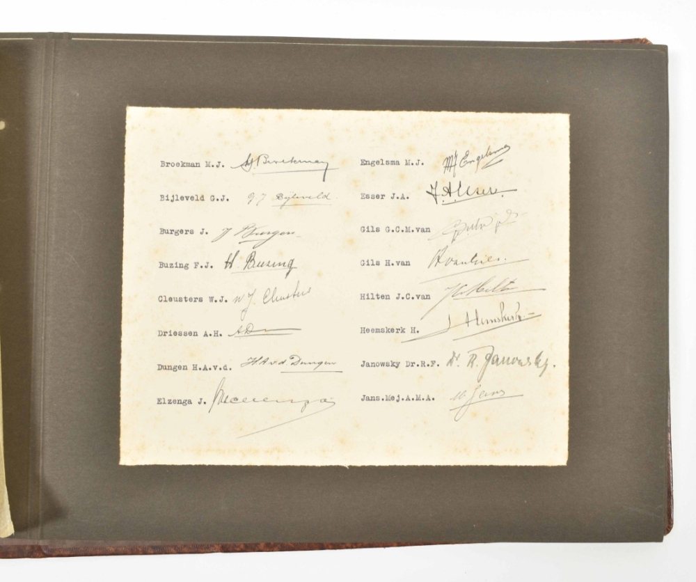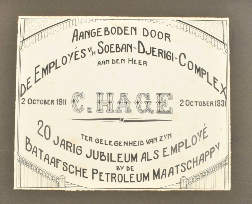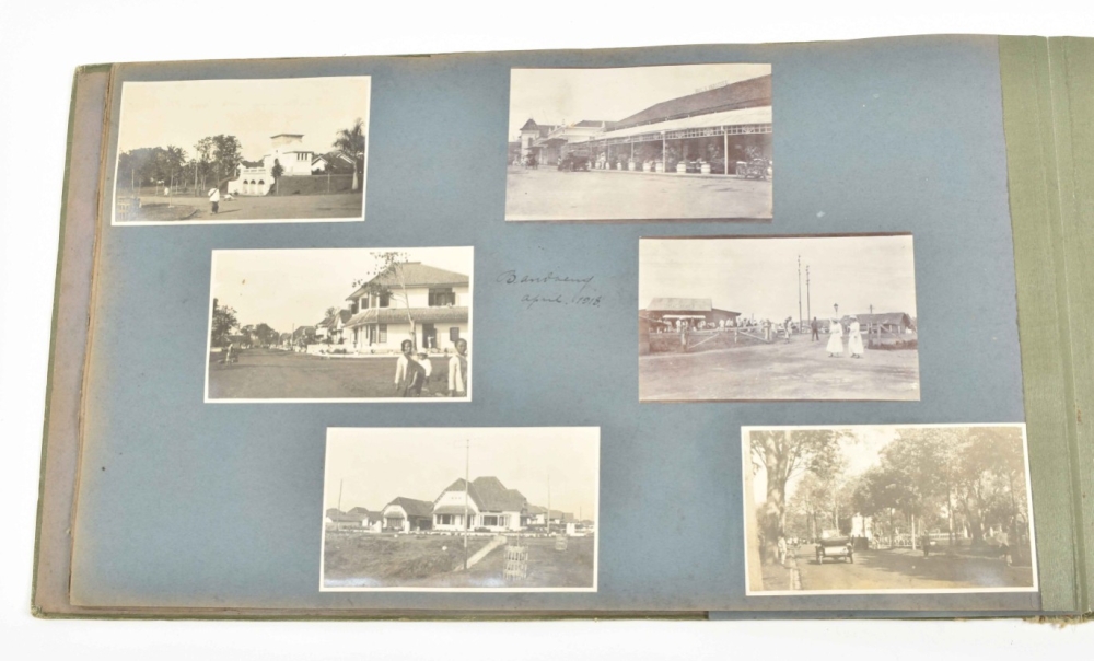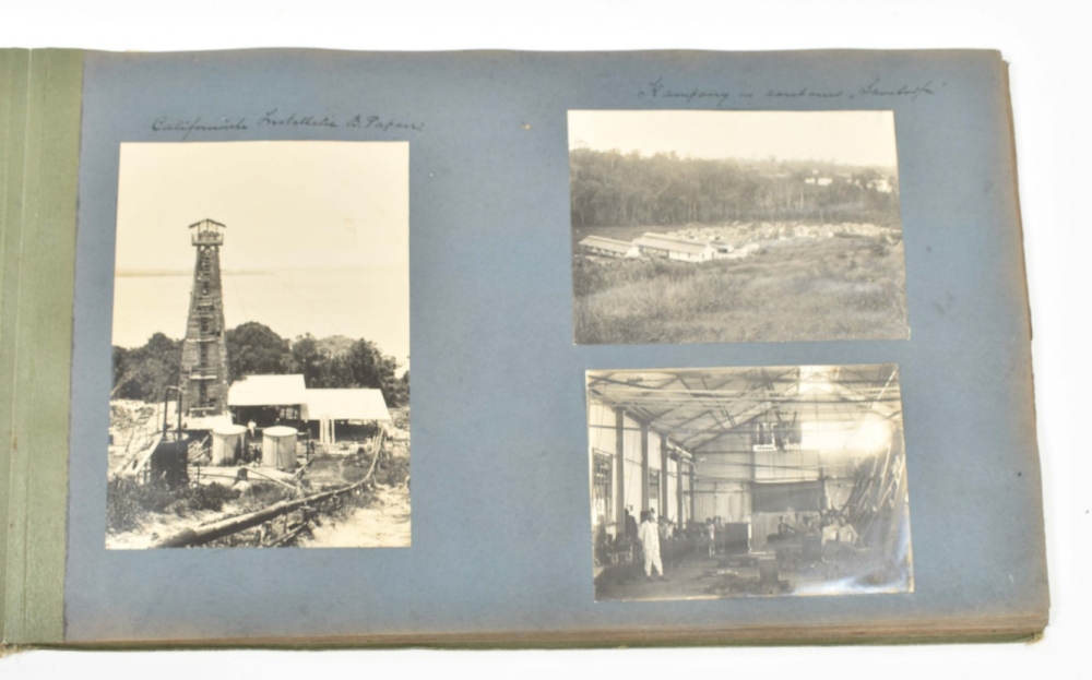 A few lvs. w. cut out sections affecting photogr., a few photogr. lacking, binding w. some dam. and stains. Varied series of photogr., apparently assembled by a high-ranking employee of an oil company, showing: oil-installations; settlements; houses; (group)portraits; family-pictures; ships; and some holiday pictures taken outside Indonesia. Some captions: "Balik-Papan Baai Borneo"; "Sanga-Sanga Moana 1913 Hosptaal Saengai Mariam"; "Boorterrein "Louise"; "Sanga-Sanga Dalem 1913"; "Meer van Bagindit Maart 1918"; "Papandajaän Maart 1918"; "Boorterrein"; "Sambodsa April 1918"; "Californische Installatie B. Papan"; "Aan het meer van Tandano"; "Opruimingswerkzaamheden Kaliminkoet"; "Exploratie werk op het eiland"; "Poelae Mandael n.o. Borneo 1919"; and "Main Camp Tarahan Borneo". -and 2 other, smaller-sized albums, with num. later photogr. concerning Dutch oil extraction in Indonesia. 1 w. modern attribution "Shell-Pladjoe Palembang Sumatra dhr van Dorp", the other a memorial picture book of the Soeban-Djerigi-Complex, honouring 20 years of service of an employee (loose). (total 3)