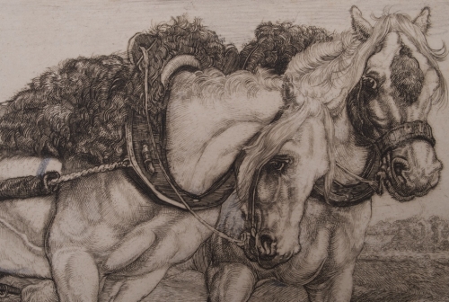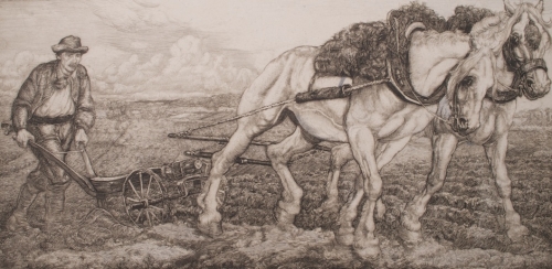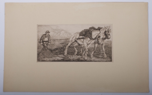 Ca. 1900. Exquisitely finished etch of a picturesque scene with a farmer and his horses working in the fields. Signed. 27,5x13,5 cm. In passe-partout.