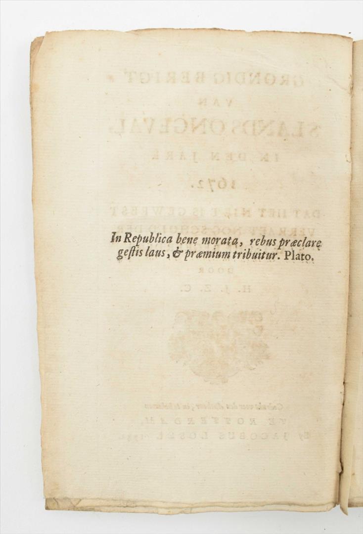 Printed as a continuation on an earlier book: Nasporing van Hollands heil en rampen, of schets van 't beloop dezes lands, sedert het begin der Spaensche troubelen, tot op het jaer 1672 door H.J.Z.C. Losel. Rotterdam.