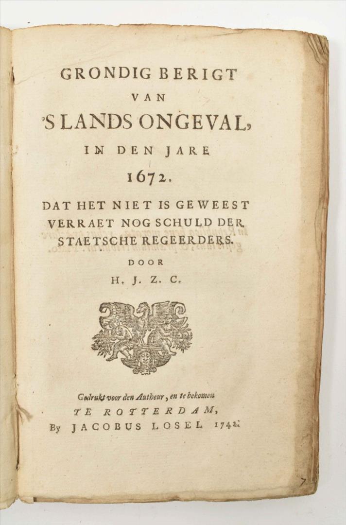 in den jare 1672. Dat het niet is geweest verraet nog schuld der Staetsche Regeerders. door H.J.Z.C. [=Huich Janszoon Coornhert]. Gedrukt voor den autheur en te bekomen te Rotterdam. Jacobus Losel. 1742. Paper-bound, title w. vignette, (2),172 p. Lacking paper spine.