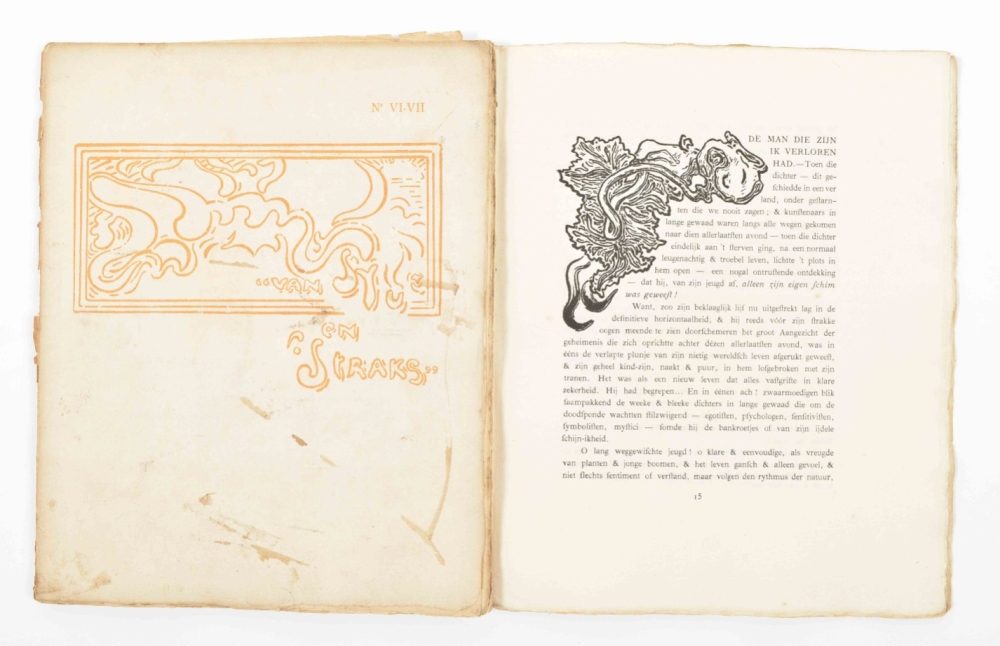 Nos.: I (2 copies); IV; VI-VII; and VIII-X. 1893 to 1901. 4to. W. orig. covers des. Henry van de Velde, ills. by a.o. X. Mellery and James Ensor, and contributions by a.o. Gust Vermeylen, Alfred Hegenscheidt, Albert Verwey, and Prosper van Langendonck.