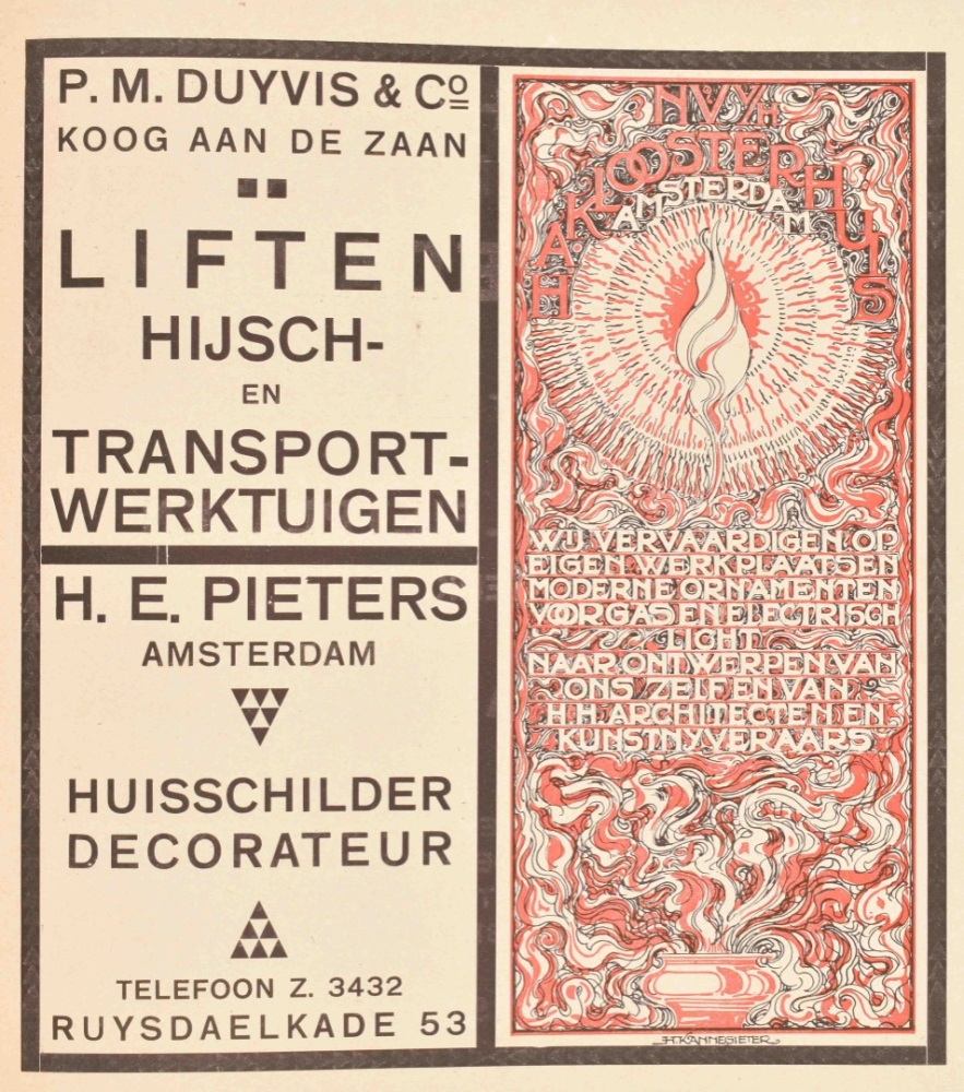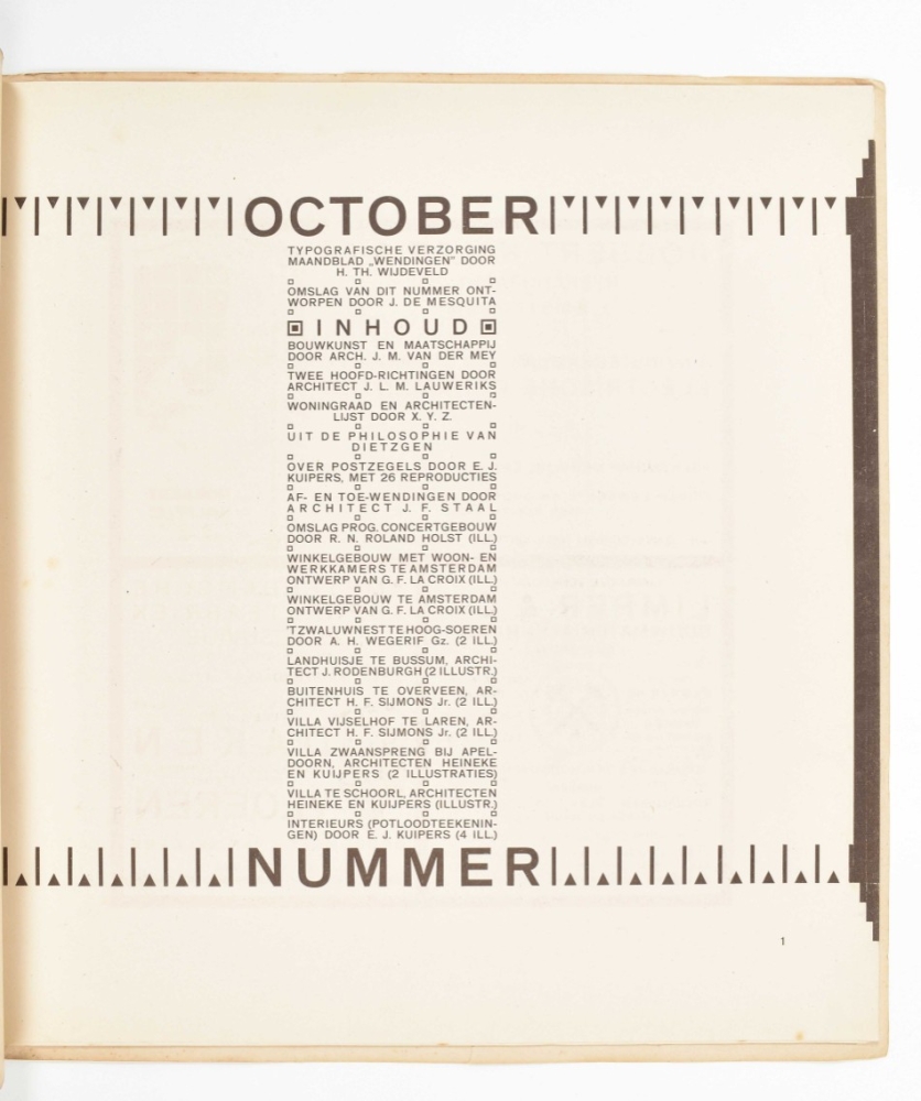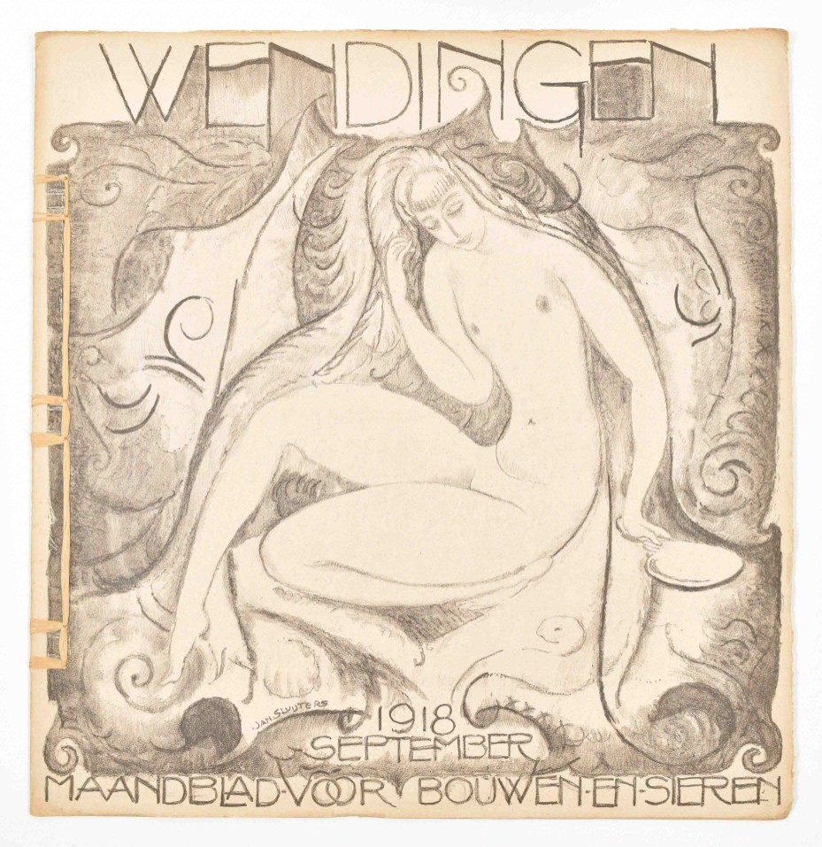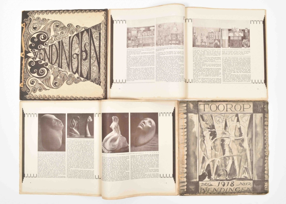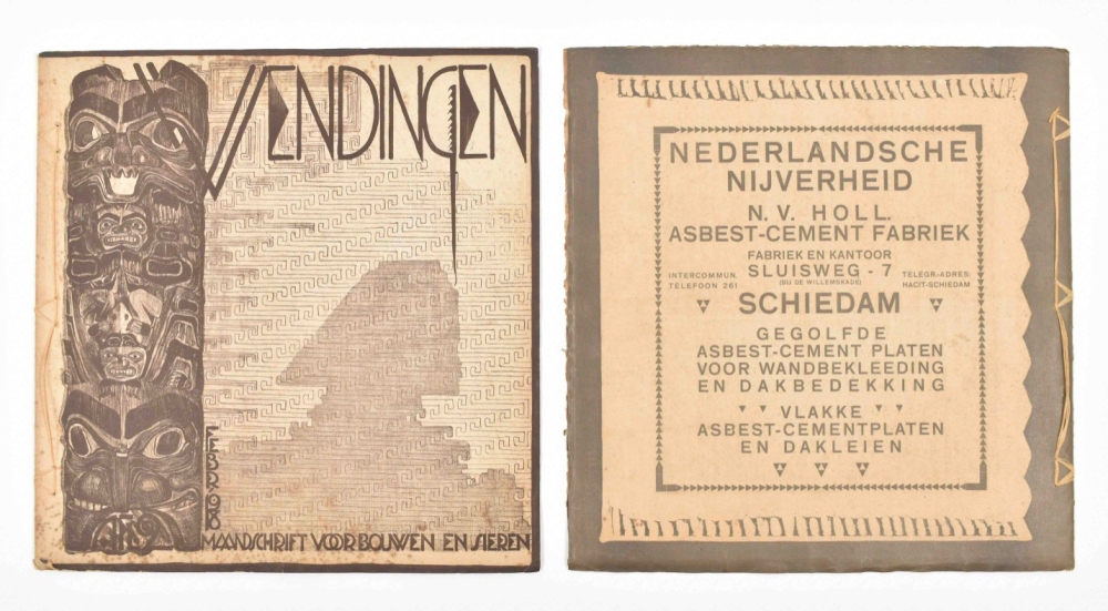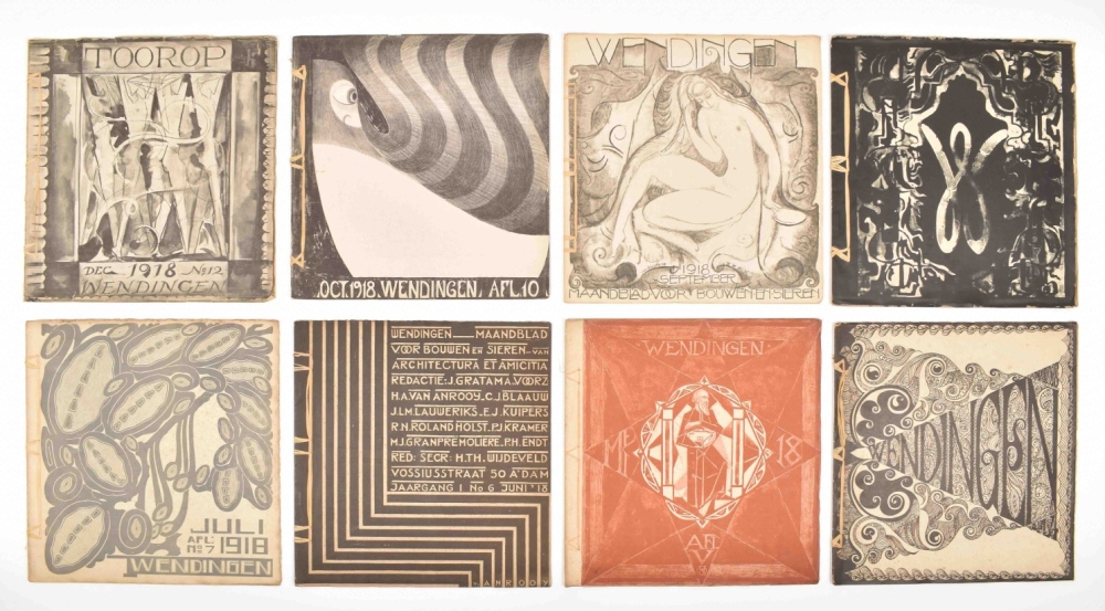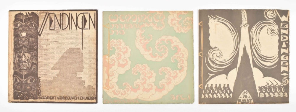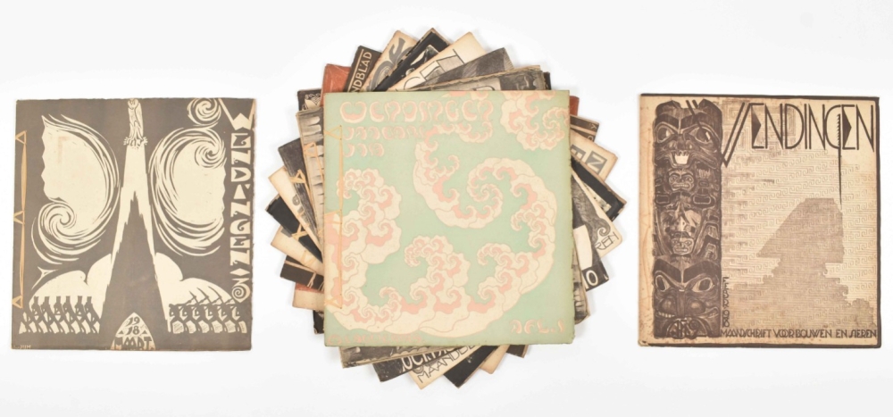 Year 1, complete in 11 vols. (monthly and Nov.-Dec. double issue). Amst., De Hooghe Brug, Jan. 1918-Dec. 1918. Large 4to. Raffia-bound, orig. covers, extensively ill. (1st issue w. pasted plates). Cover des. by a.o.: J.L.M. Lauweriks; M. de Klerk; H. Krop; C.J. Blaauw; R.N. Roland Holst; H.A. van Anrooy; E.J. Kuipers; C.A. Lion Cachet; J. Sluijters; S. Jessurun de Mesquita; and W. van Konijnenburg. Inserts in nos. 2; 4; 5; 7; 8; and 11/12.