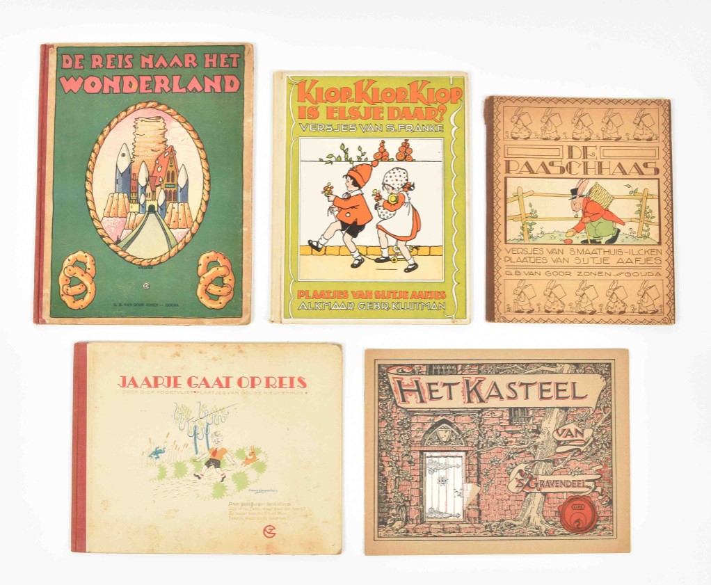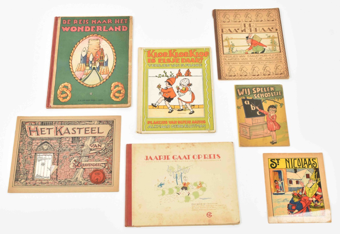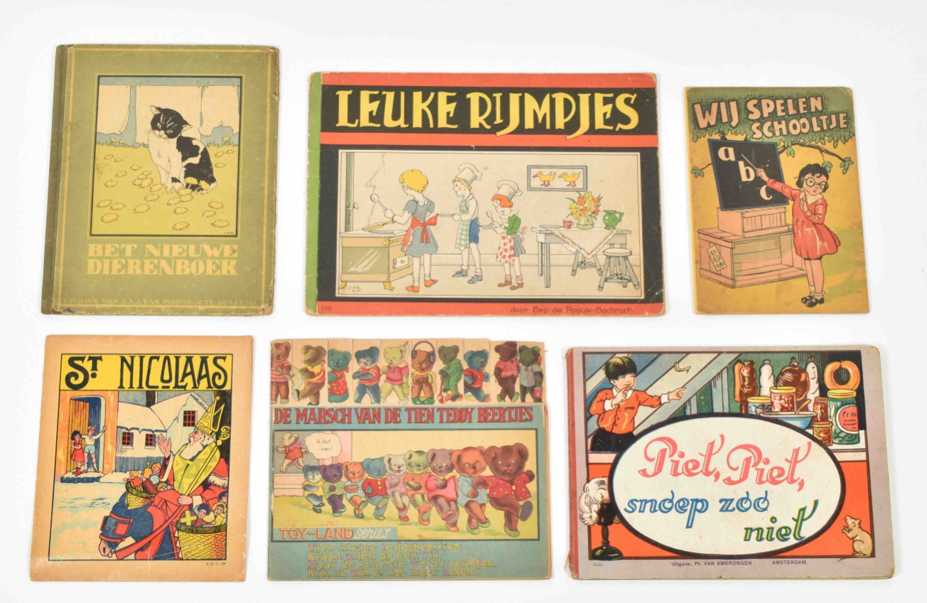 Amsterdam, Holkema & Warendorf, n.d. (1905). Folio. Hcl. Num. col. ills. by Gertrud Caspari. Cover and spine sl. worn, foxing, some p. creased, one backed w. paper, some sm. tears repaired w. sellotape. (2) M. de Lannoy. Jantjes ABC. Antwerp, A. Bossaerts, n.d. (ca. 1930). (26 p.). Hcl. Each leaf w. tinted ills. by J. Waterschoot. (3) An unused children's drawing book w. ills. that could be copied on facing grid paper -and 11 (rare) others, incl. St Nicolaas, Piet, Piet, snoep zoo niet (not in NCC) and De Marsch van de tien teddy beertjes.