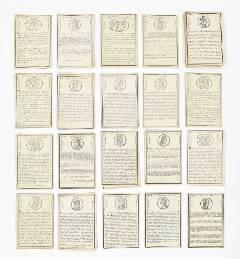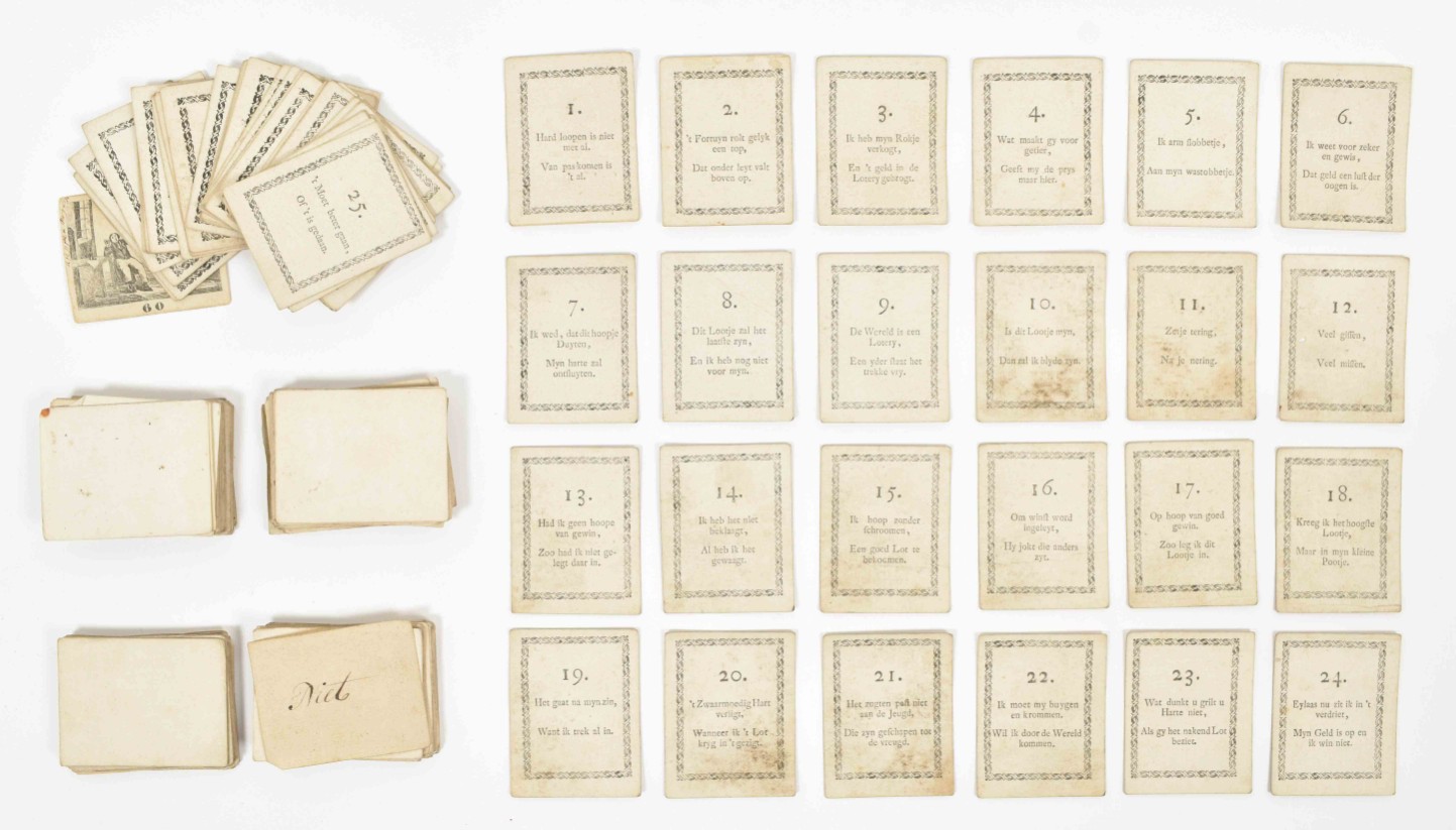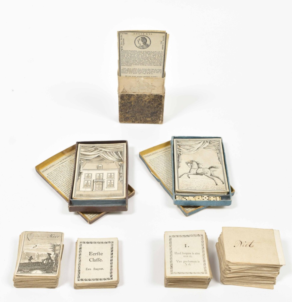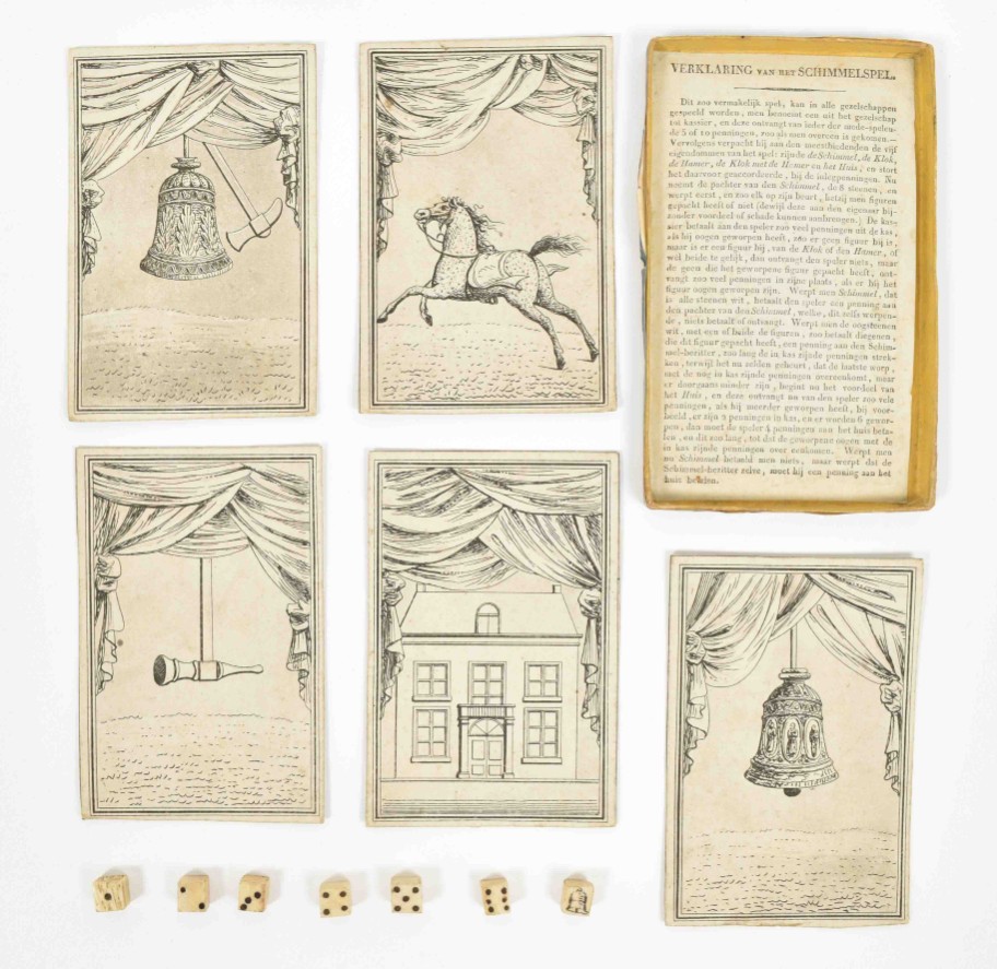 (1) Two copies of Schimmelspel. Ca. 1840. 1 in contemp. box w. 5 engr. cards and 7 bone dice. Box approx. 14 x 8 x 1 cm. The second box comprises 5 engr. cards in contemp. box, but lacks dice. (2) Two 19th cent. Dutch lottery card games. Added: An incomplete set of the cards from the French game Jeu des rois de France.