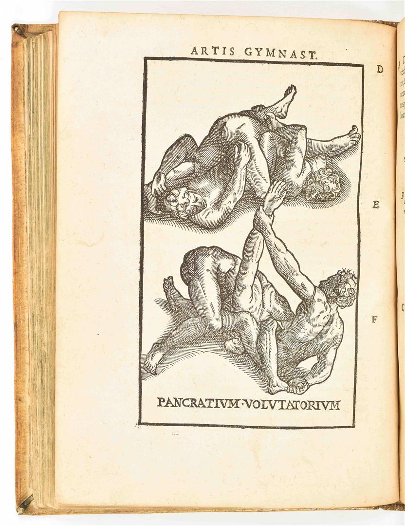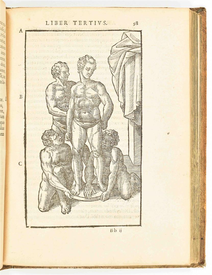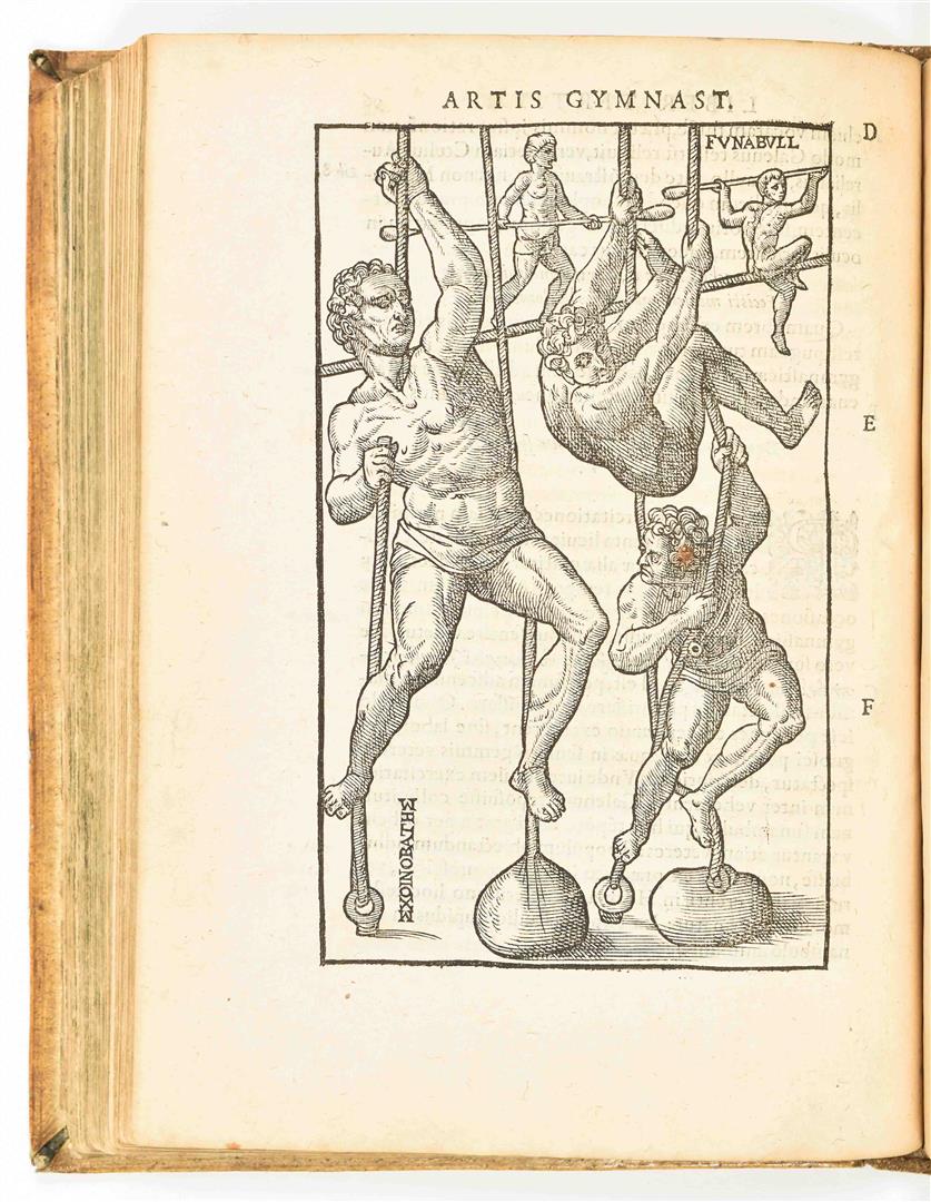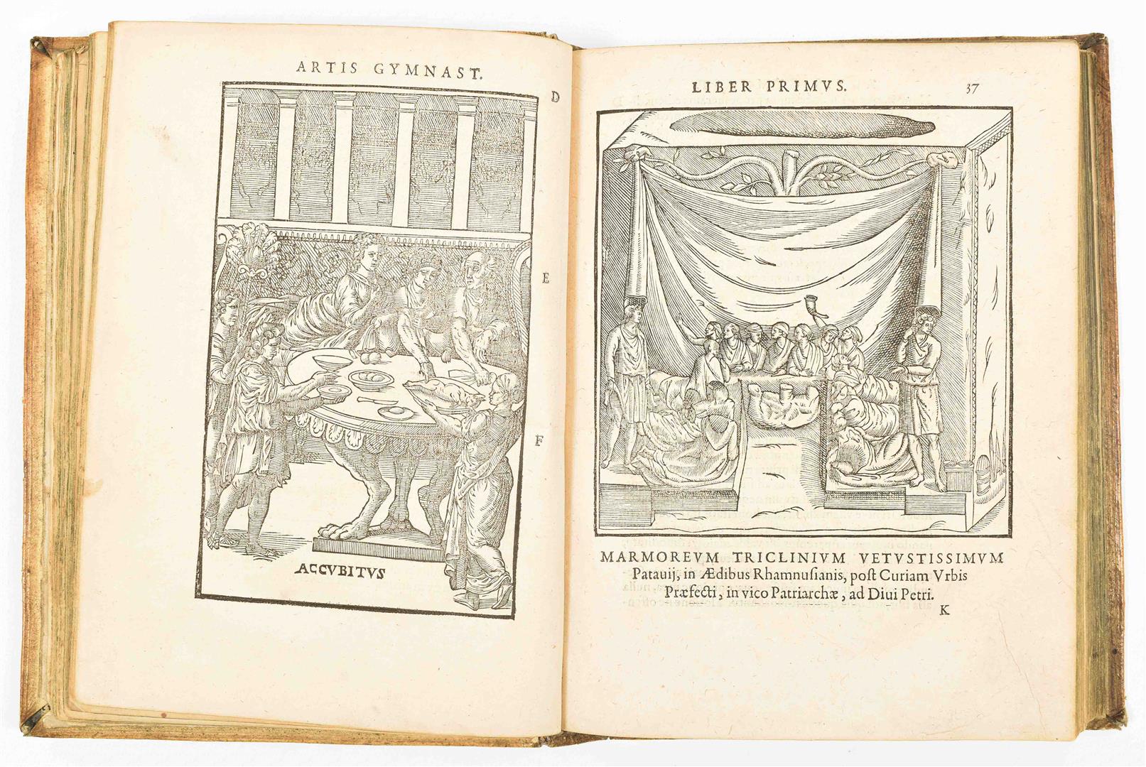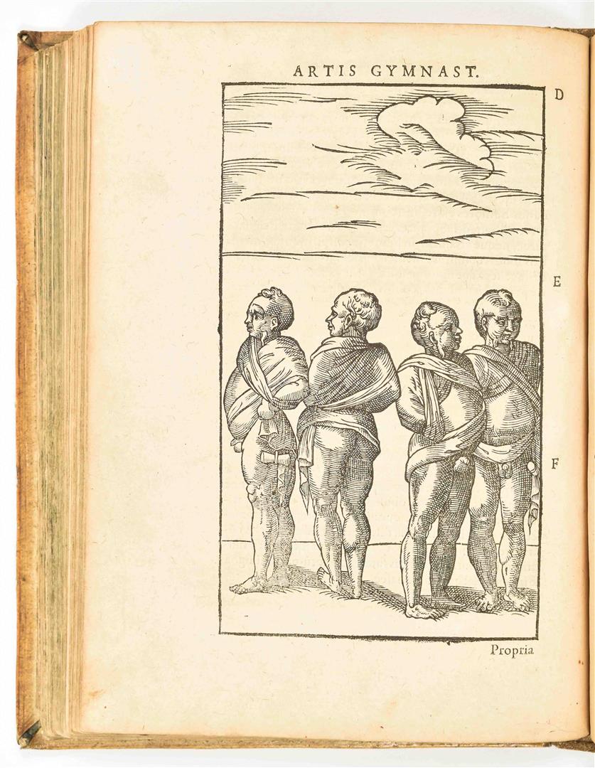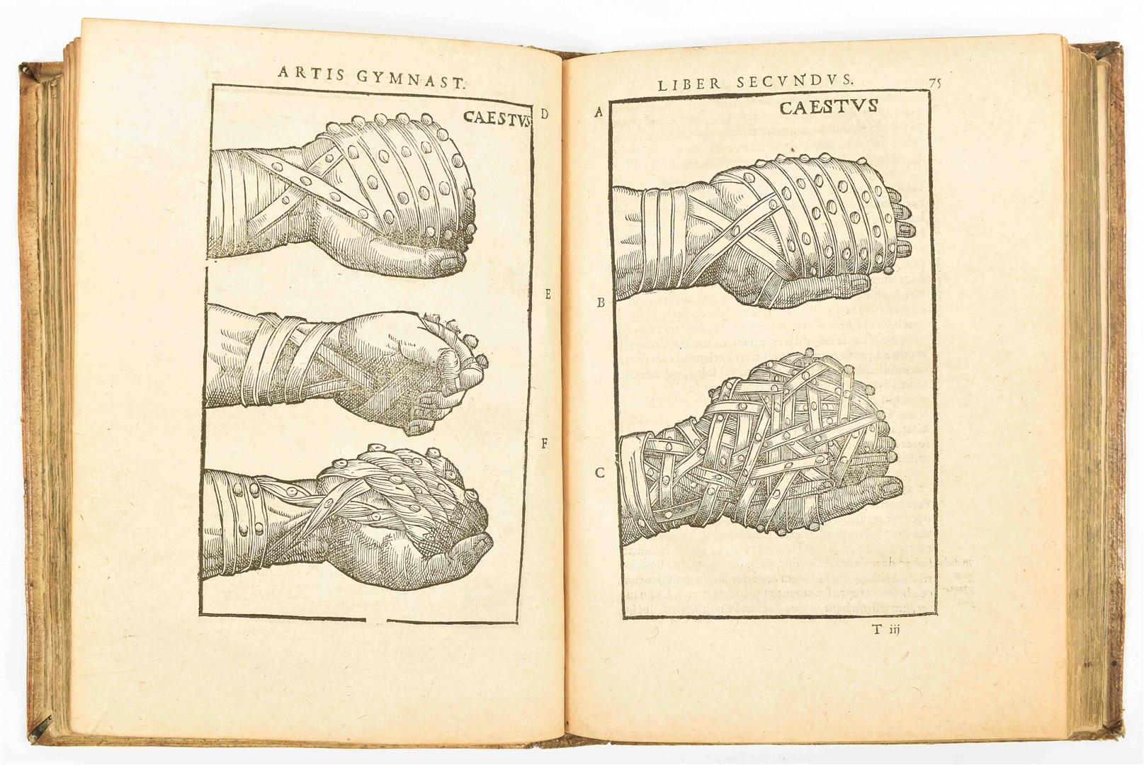 Text block slightly browned throughout, lacks first free endpaper, occas. minor other internal defects. Binding lacks ties, is sl. stained and the upper joint is splitting in lower compartment of spine. A good copy in a very fine, strictly contemporary Renaissance binding. Garrison & Morton, 1986.1; Wellcome, I, 4225. The best-known work of Italian physician and philologist Girolamo Mercuriale (1530-1606), here in third edition. First published in 1569 without ills., the 2nd edition by Giunta in 1573 was the first illustrated one and with that the first illustrated book on gymnastics. "One of the earliest books to discuss the therapeutic value of gymnastics and sports generally for the cure of disease and disability, and an important study of gymnastic in the ancient world." (Garrison & Morton). It is also a history of the attitudes and practices of the Greeks and Romans in regard to diet, hygiene, bathing, and exercise, and their effects on health and disease.