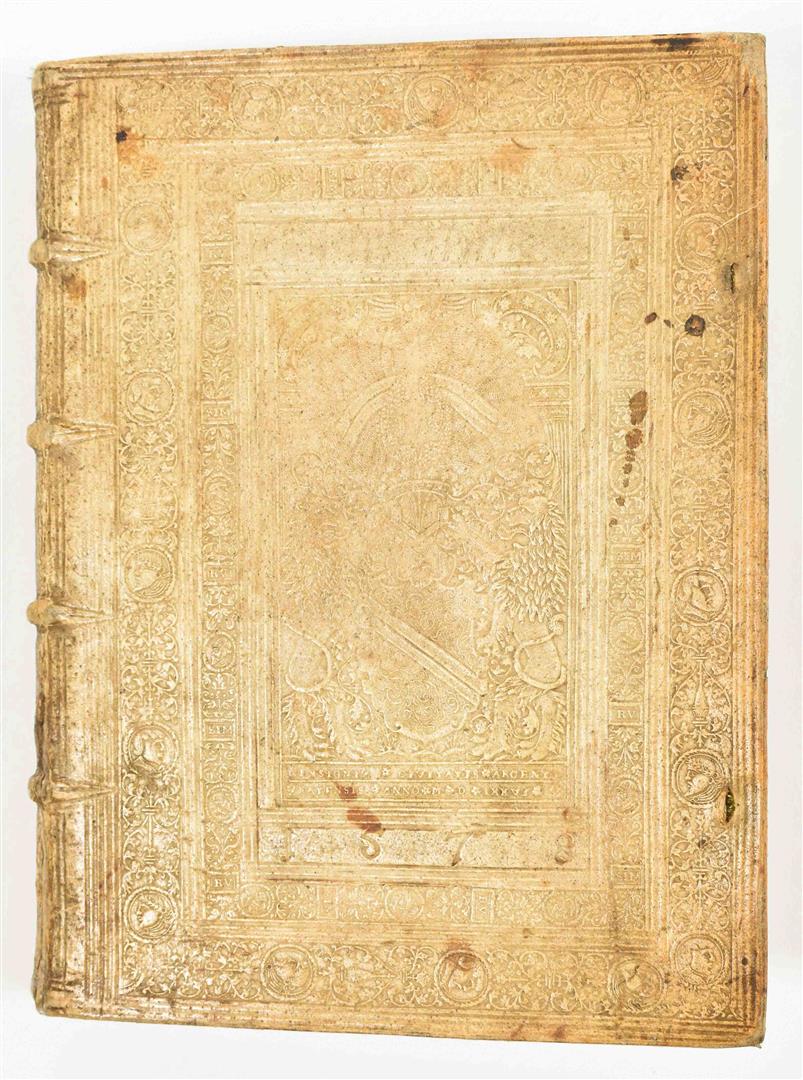 in quibus exercitationum omnium vetustarum genera, loca, modi, facultates, & quidquid denique ad corporis humani exercitationes pertinent, diligenter explicatur. Secunda editione aucti, & multis figuris ornati. Opus non modo medicis, verumetiam omnibus antiquarum rerum cognoscendarum, & valetudinis conseruandae studiosis admodum utile. Paris, Jacques Du Puys, 1577, (4),201[=200],(13) lvs., 2 fold. floorplans on both sides of leaf 14, 21 full-p. woodcut ills. after Pirro Logorio and 1 smaller woodcut, strictly contemporary richly blindstamped pigskin, frontcover with the central coat-of-arms of Strasbourg (the panel monogrammed "IH") above the date 1578, backcover with a fine large portrait of Christoph, Duke of Württemberg. Both these large panels within double rolled borders incorporating portraits (the inner border monogrammed "SIM" and "RV"), ribbed spine, 4to.