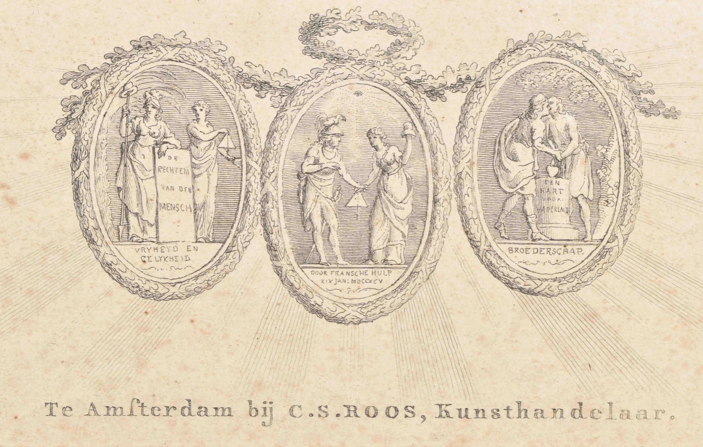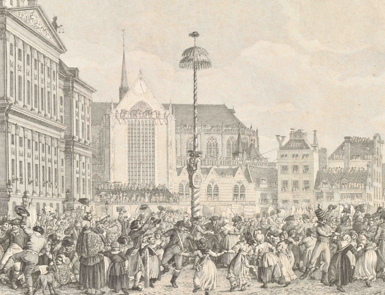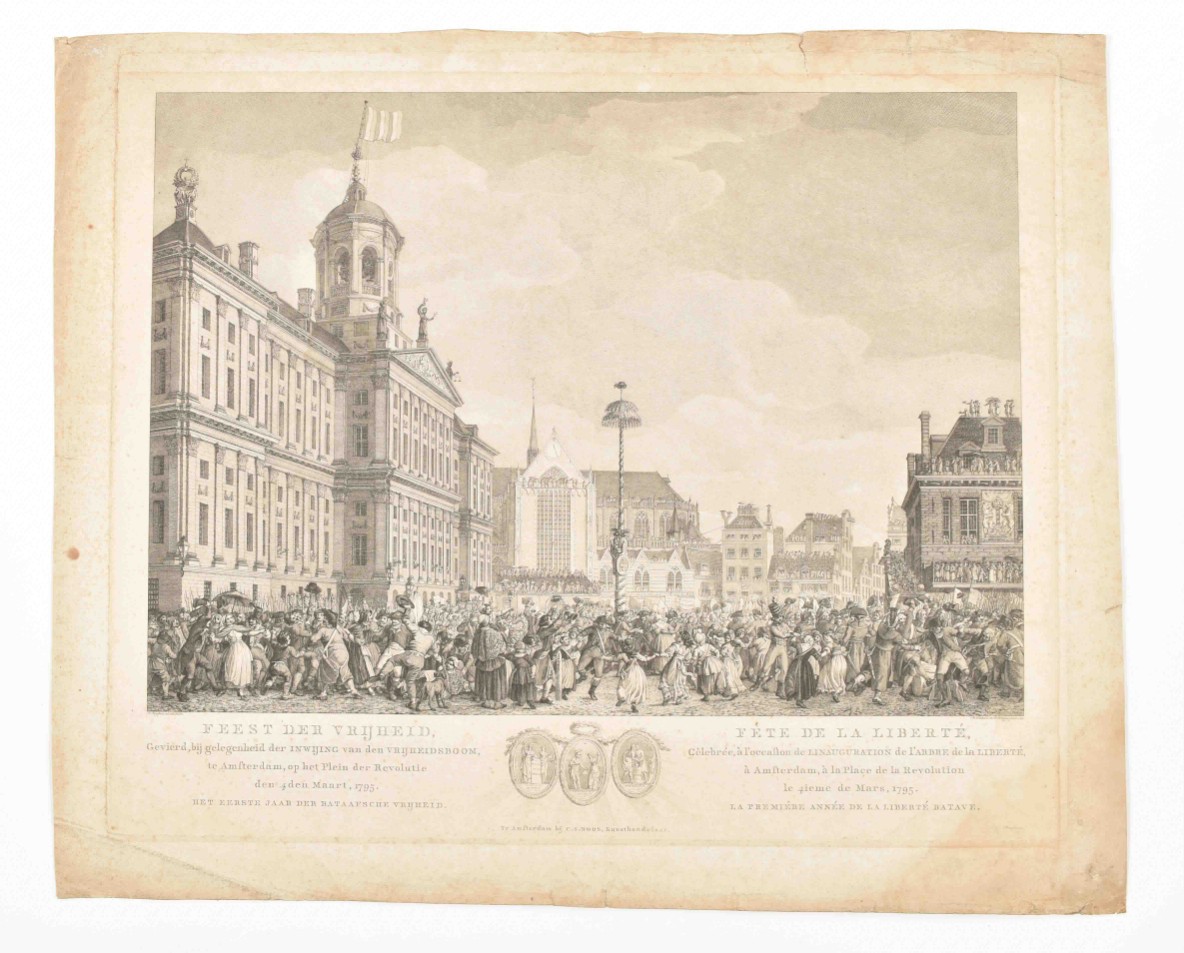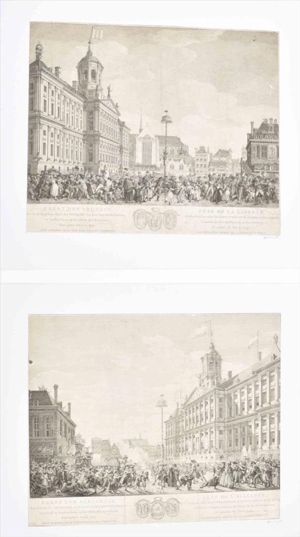 gevierd, bij gelegenheid der inwijding van den Vrijheidsboom, te Amsterdam, op het Plein der Revolutie, den 4den Maart, 1795". 2 copies. (2) "Feest der Alliantie, tusschen de Fransche en Bataafsche Republieken, gevierd te Amsterdam, op het Plein der Revolutie den 19den Junij, 1795". 2 lively engr. by R. Vinkeles and D. Vrydag after J. Kuyper, showing Dam Square facing the Nieuwe Kerk and facing Kalverstraat. Both approx. 39.5 x 46 cm w. engr. captions in Dutch and French, publ. in Amst. by C.S. Roos, 1795-96.