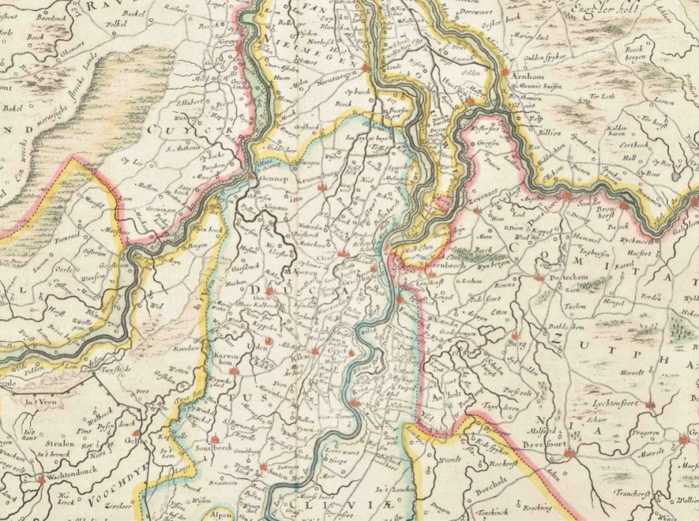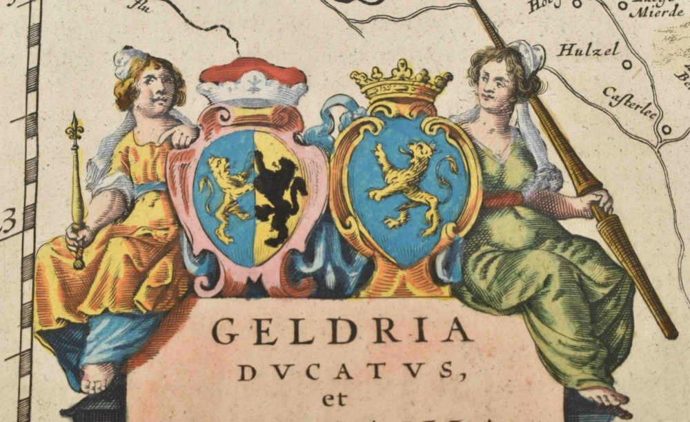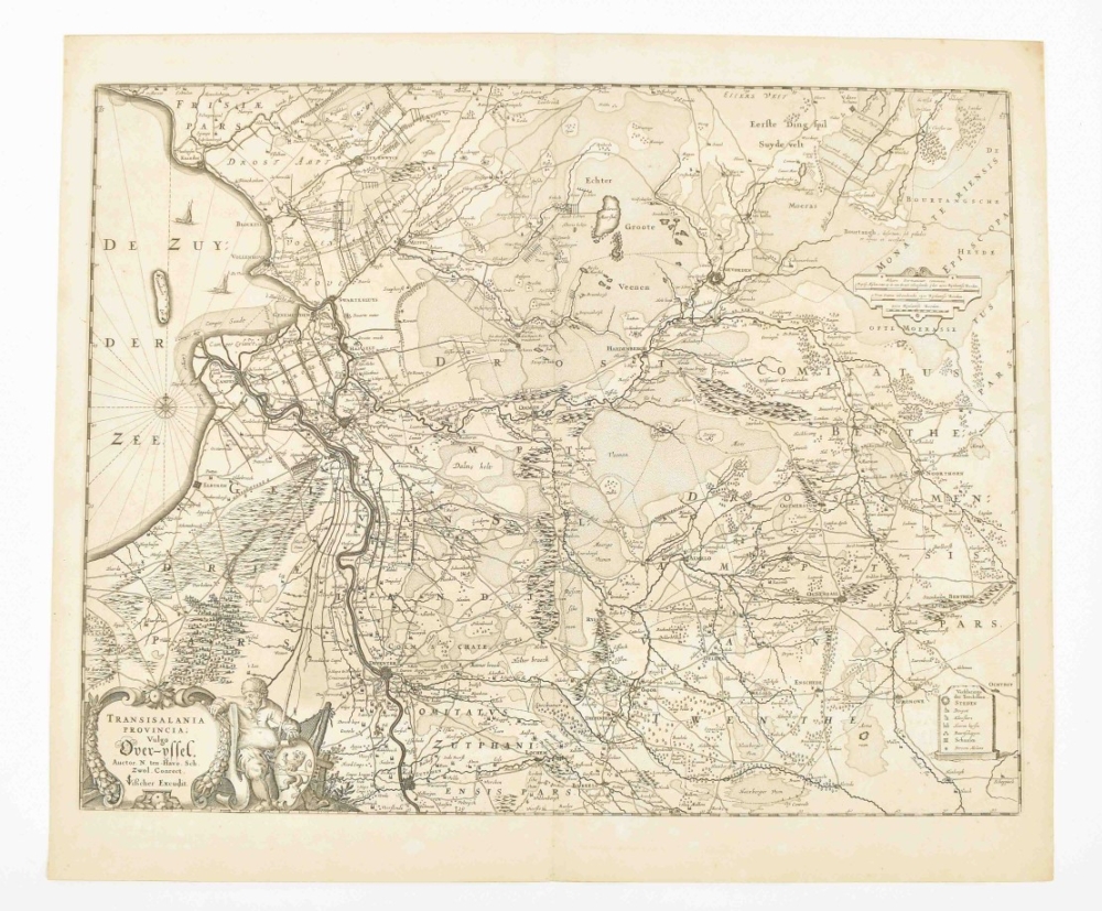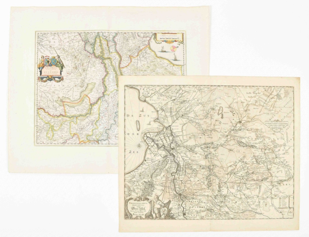 (1) Geldria Ducatus et Zutfania Comitatus. Guilj. Blaeuw (signed in the plate). Amst., ca. 1650. 39 x 50.5 cm. Col., wide margins, verso Dutch text. (2) Transisalania Provincia, vulgo Over-Yssel, text by N. ten Have. Amst., C.J. Visscher, ca. 1660. Large cartouche w. title and coat of arms, scales and legenda, verso blank.