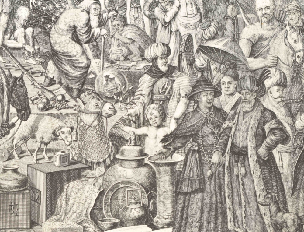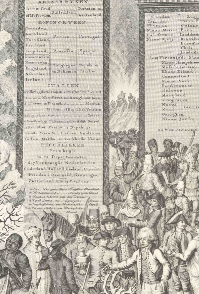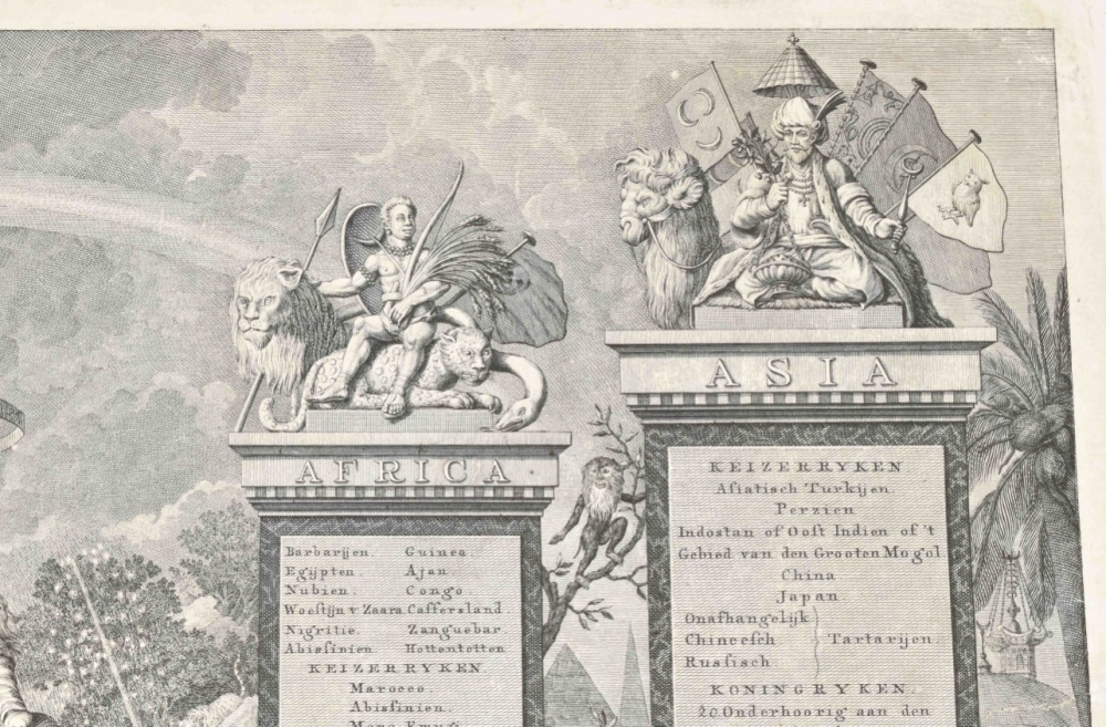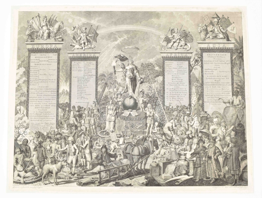 Professionally (almost invisibly) restored copy, fully backed, closed tears, marg. defects etc. Very fine and rare print, showing an allegorical figure of the World in the centre and columns topped by allegorical figures for the 4 continents at its left and right, w. indication of the countries for each continent. In front of the columns are human figures from var. countries. Added: "Verklaaring van het konststuk genaamd De Waereld" in modern photocopy. (total 2)