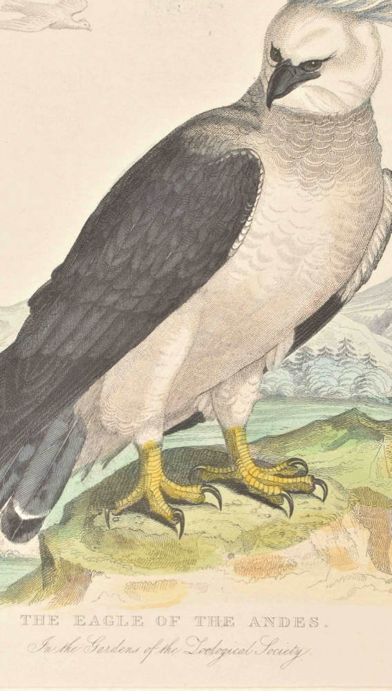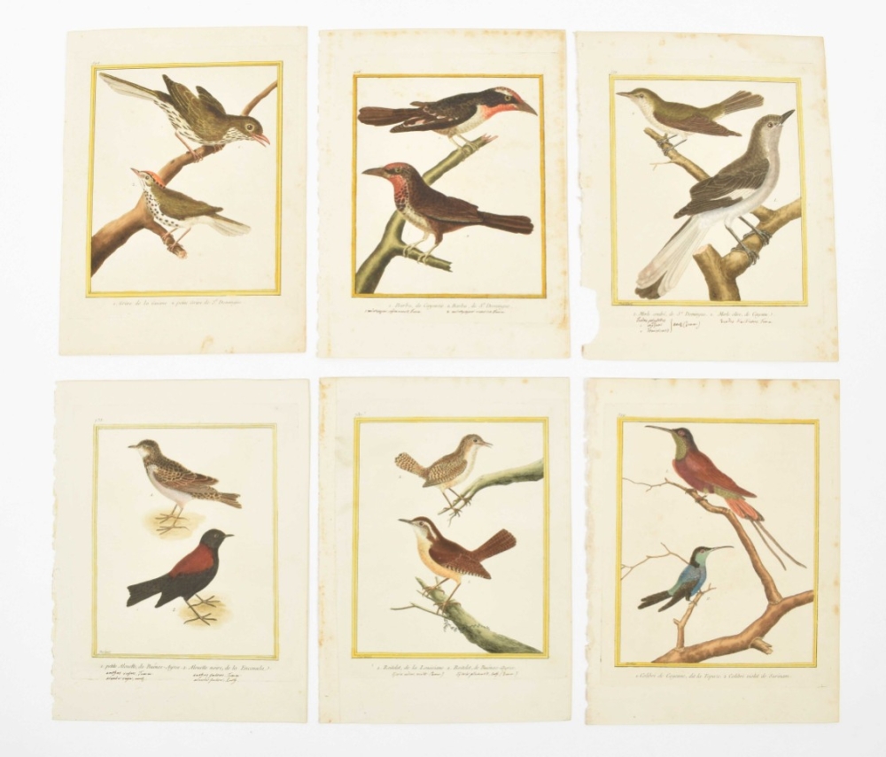 Col. gouache, sheet size 29.5 x 23 cm. Manuscript caption in Latin below, 2nd half 19th cent., under passepartout. (2) "Il pellicano d'America". Etching, 25 x 18 cm, signed "V. Vanni sc." in the plate, publ. in 1763. (3-11) François Nicolas Martinet (1730-ca. 1790). 9 lvs. w. handcol. etched birds. From Buffon, Histoire naturelle des oiseaux and Les planches enluminées, London, 1786. Sheet sizes 31 x 23.5 cm, lvs. 125, 206, 398, 487, 558, 599, 730, 738 (2x). 6x signed "Martinet" in the plate. Frayed in blank left margins. -and 14 others.