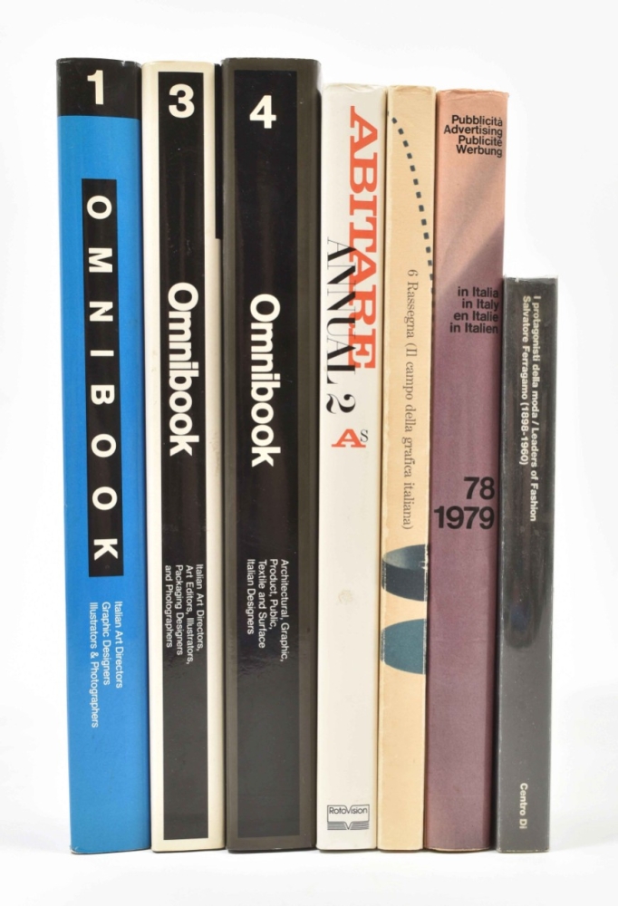 (1) Omnibook. Architectural, Graphic, Product, Public, Textile and Surface Italian Designers. Udine, Magnus Edizioni, 1984-88. Nos. 1, 3 and 4. All hc w. ill. dust-j. (2) Il campo della grafica italiana. (Bologna, C.I.P.I.A., 1981). Sc w. ill. dust-j. -and 3 others.