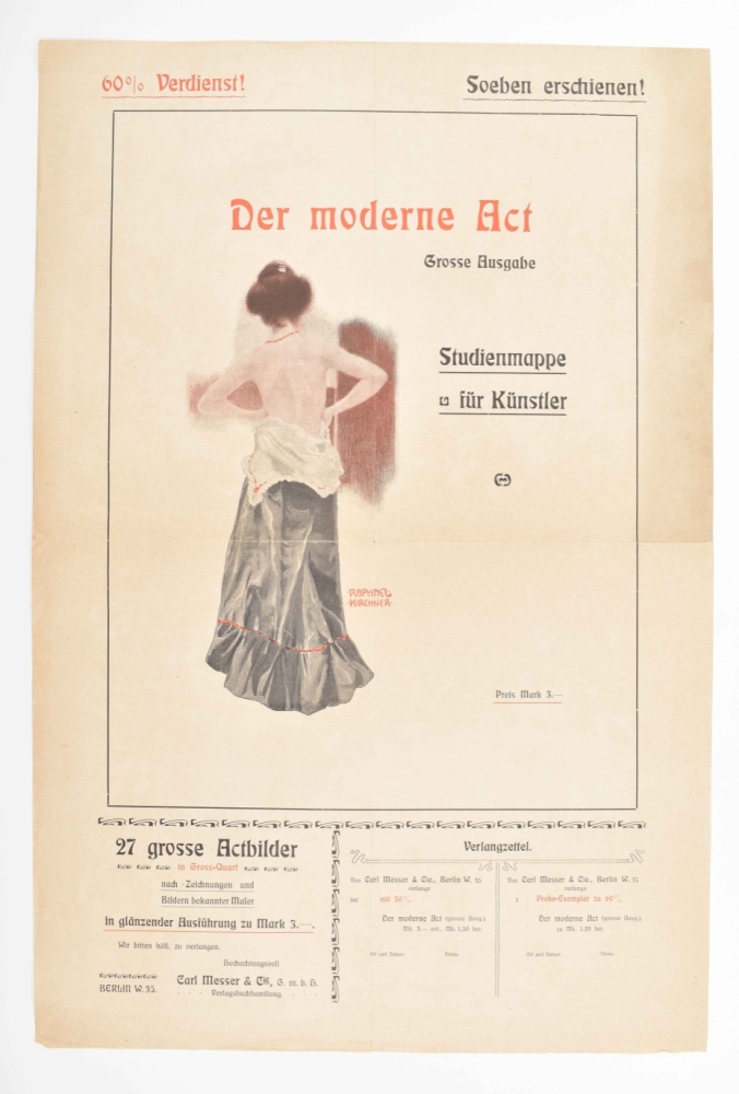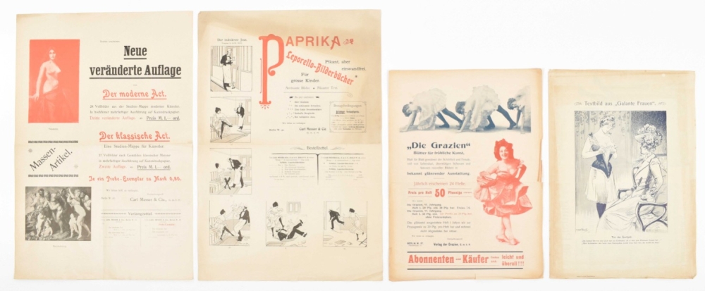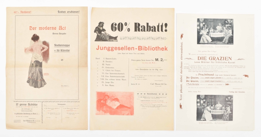 (12-24) Thirteen similar prospectuses for various publications such as the Junggesellen-Bibliothek, Der moderne Act and Hopplah! Vater sieht's ja nicht, all published in Berlin by Carl Messer & Cie, mostly undated (ca. 1900), 2-4 p., ills. after Knut Hansen, Raphael Kirchner a.o., various sizes. All w. folds and letterpress ticket of P. Out, occas. other imperfections. (total 24)