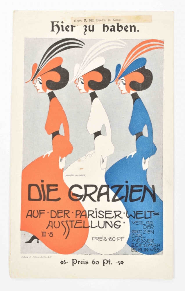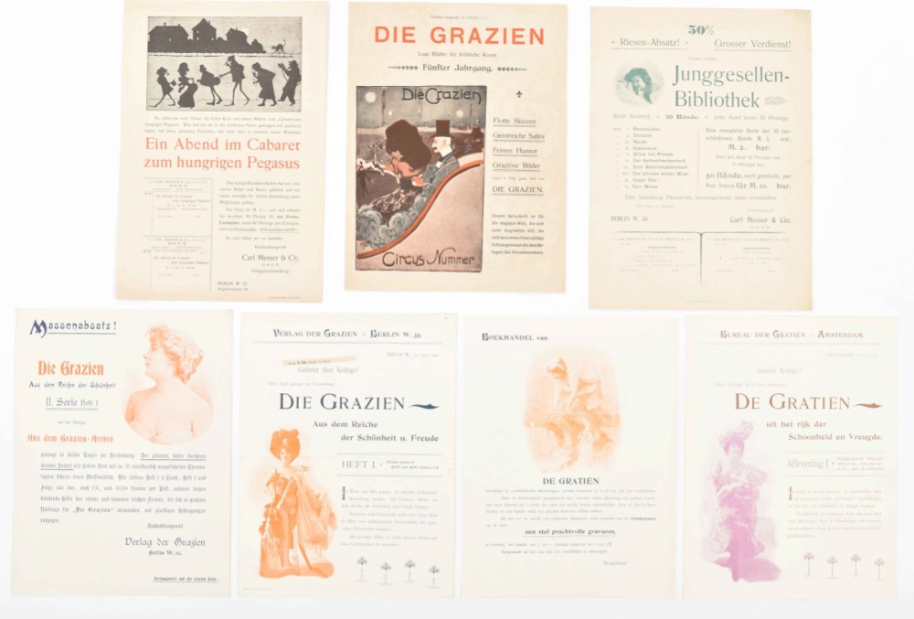 Berlin, Verlag der Grazien/ Carl Messer & Cie (2x Bureau der Grazien, Amsterdam), mostly undated (ca. 1900), 2-4 p., ills. after Julian Klinger, Knut Hansen, E.M. Lilien a.o. and photogr. ills., var. sizes. All w. folds.