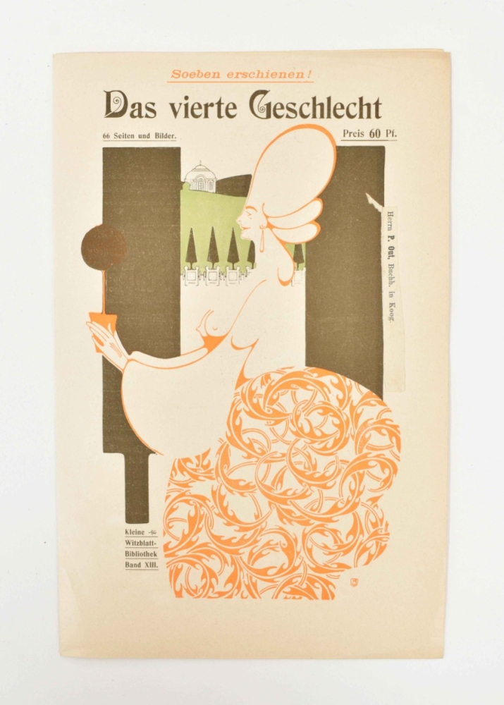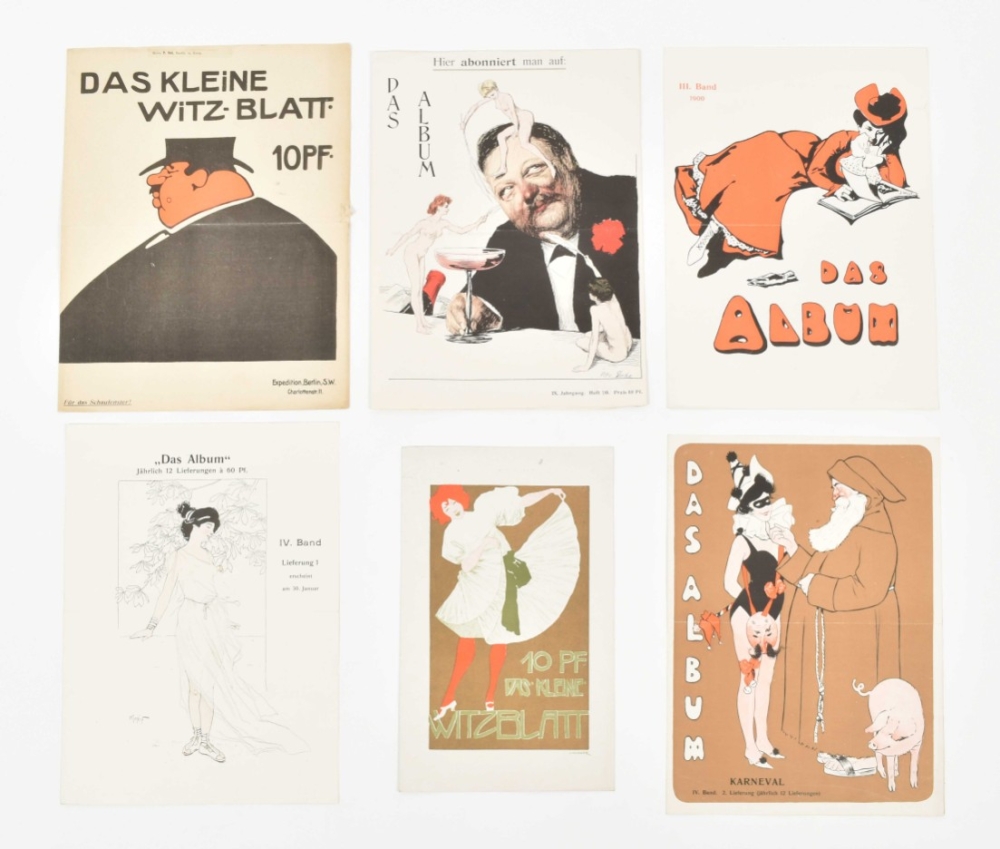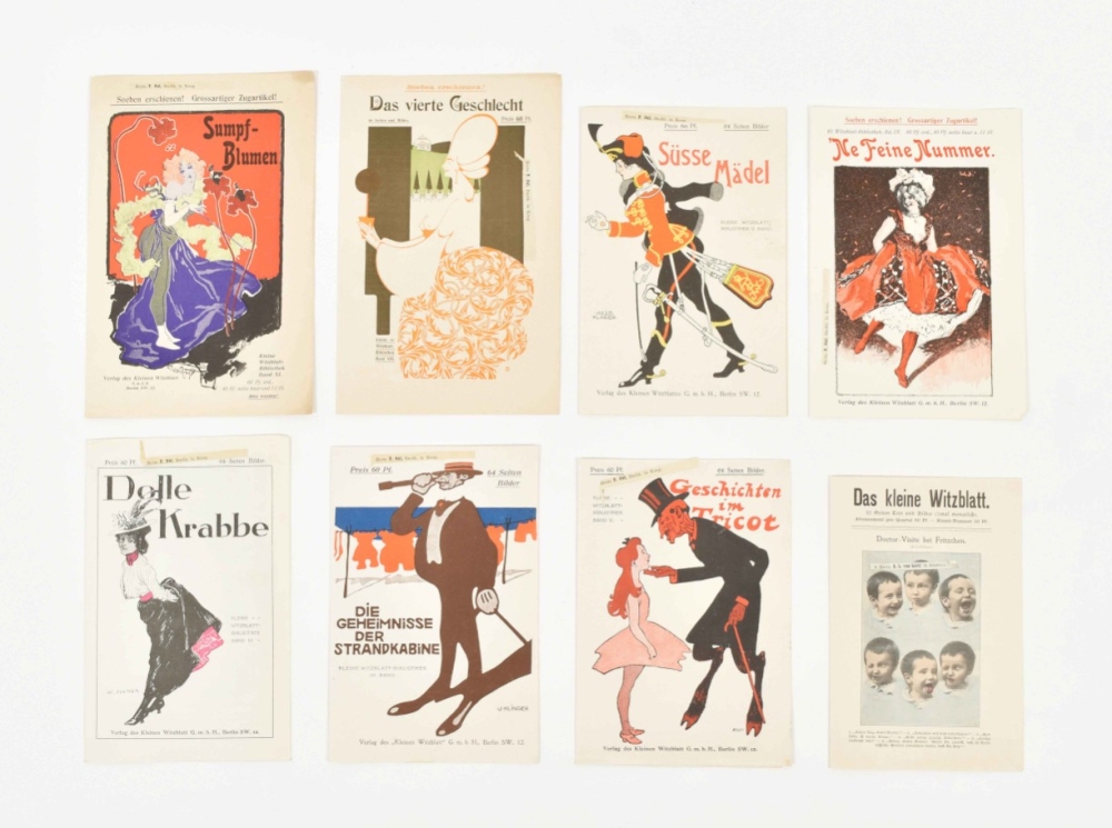 These extremely rare prospectuses were only sent to book traders, this set to P. Out, Koog aan de Zaan (all w. letterpress ticket). (13-22) Ten similar prospectuses for Kleine Witzblatt-Bibliothek. Berlin, Verlag des Kleinen Witzblattes, undated (ca. 1900), all but two 4 p. and 8vo/ 4to sized, ills. by W. Illner, Julius Klinger. Mostly w. letterpress ticket of P. Out. (total 22)