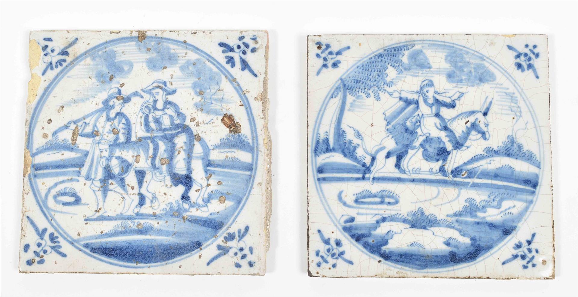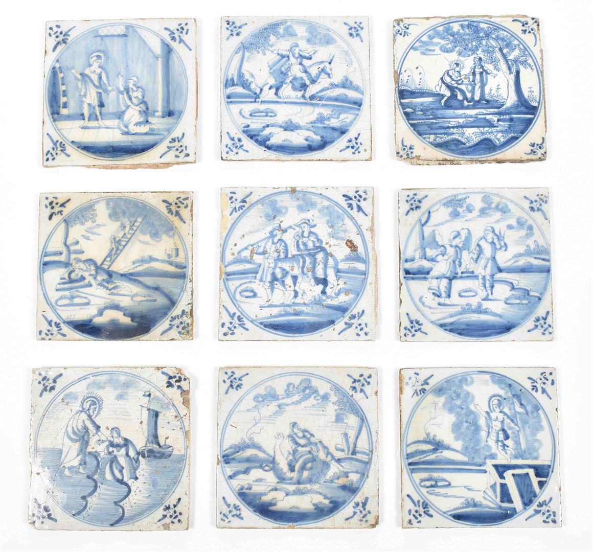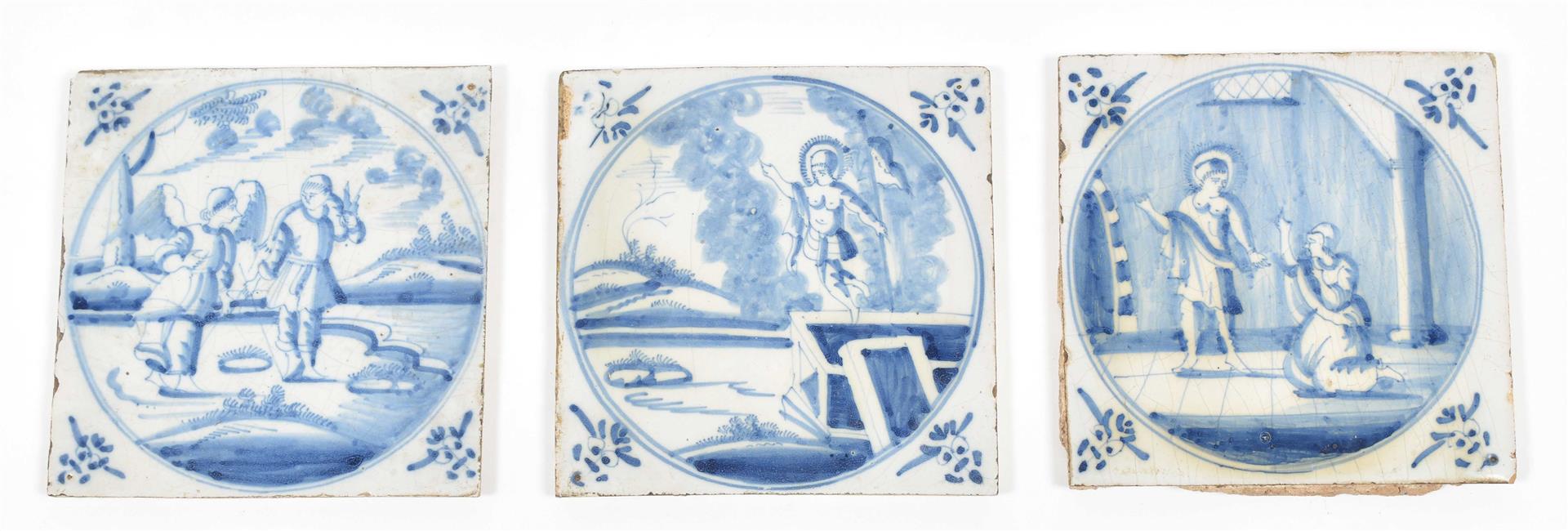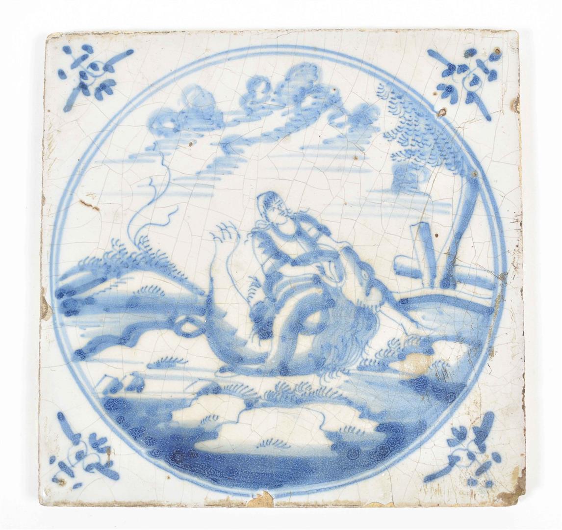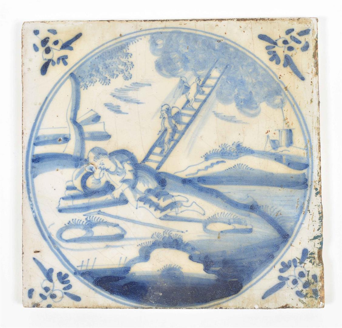 18th cent. 13 x 13 cm. Ceramic with blue and white tin glaze. Depictions of a.o. Jesus helping Peter out of the water, Daniel in the lion's den, Jesus' resurrection, Jacob's ladder, and Joseph and Mary's flight to Egypt. Corner oxbow motif.