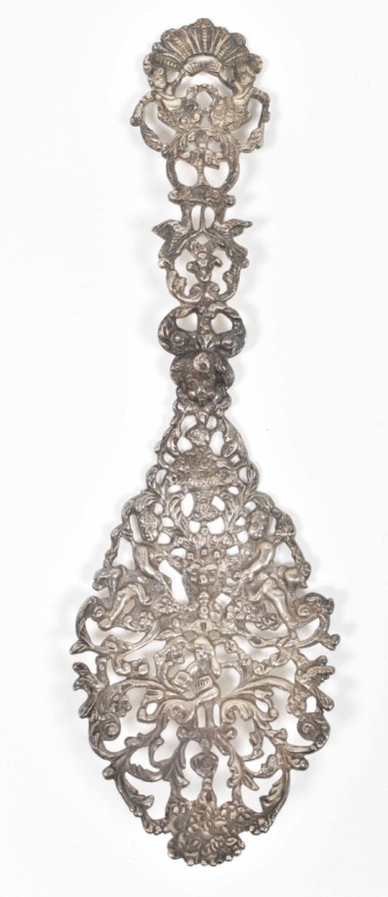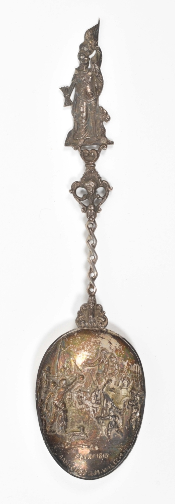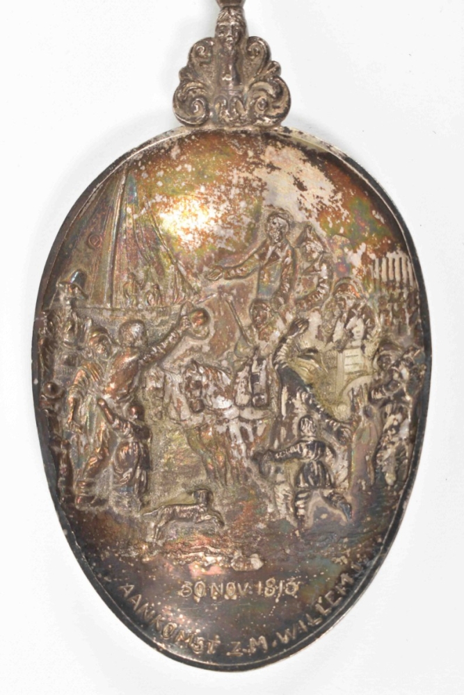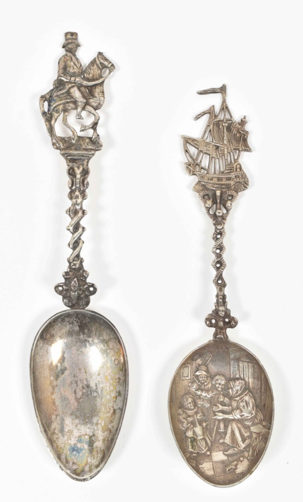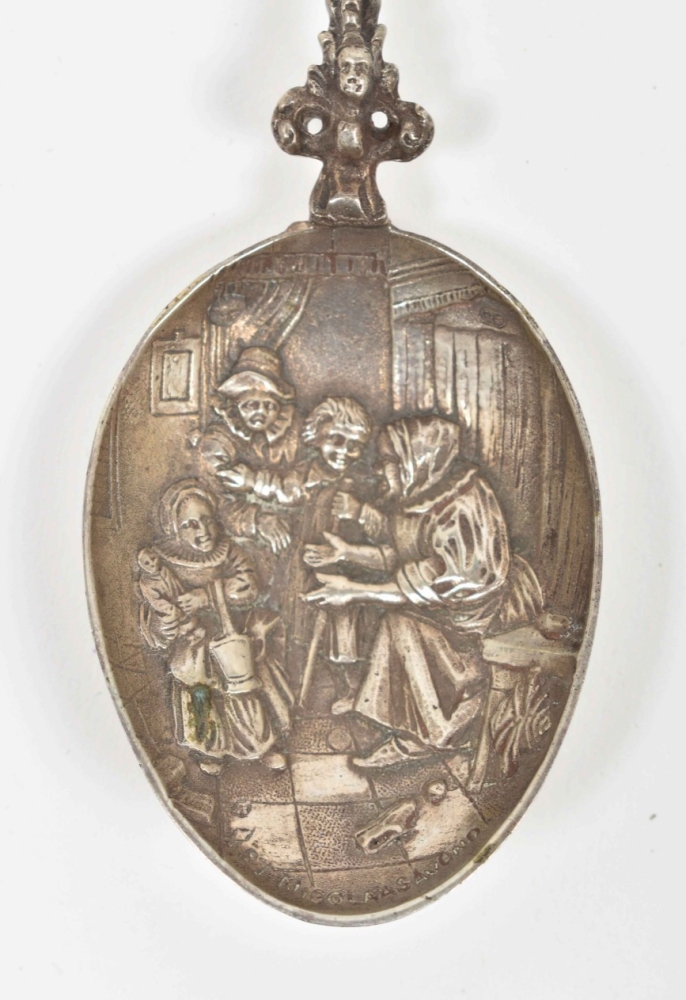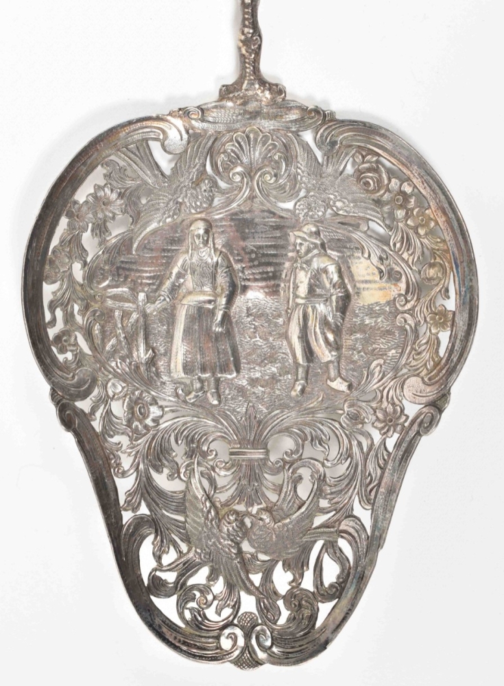 5 intricately dec. spoons of 2nd grade silver, 1 w. inscription dated 1887.