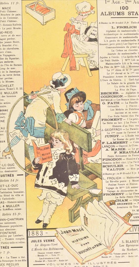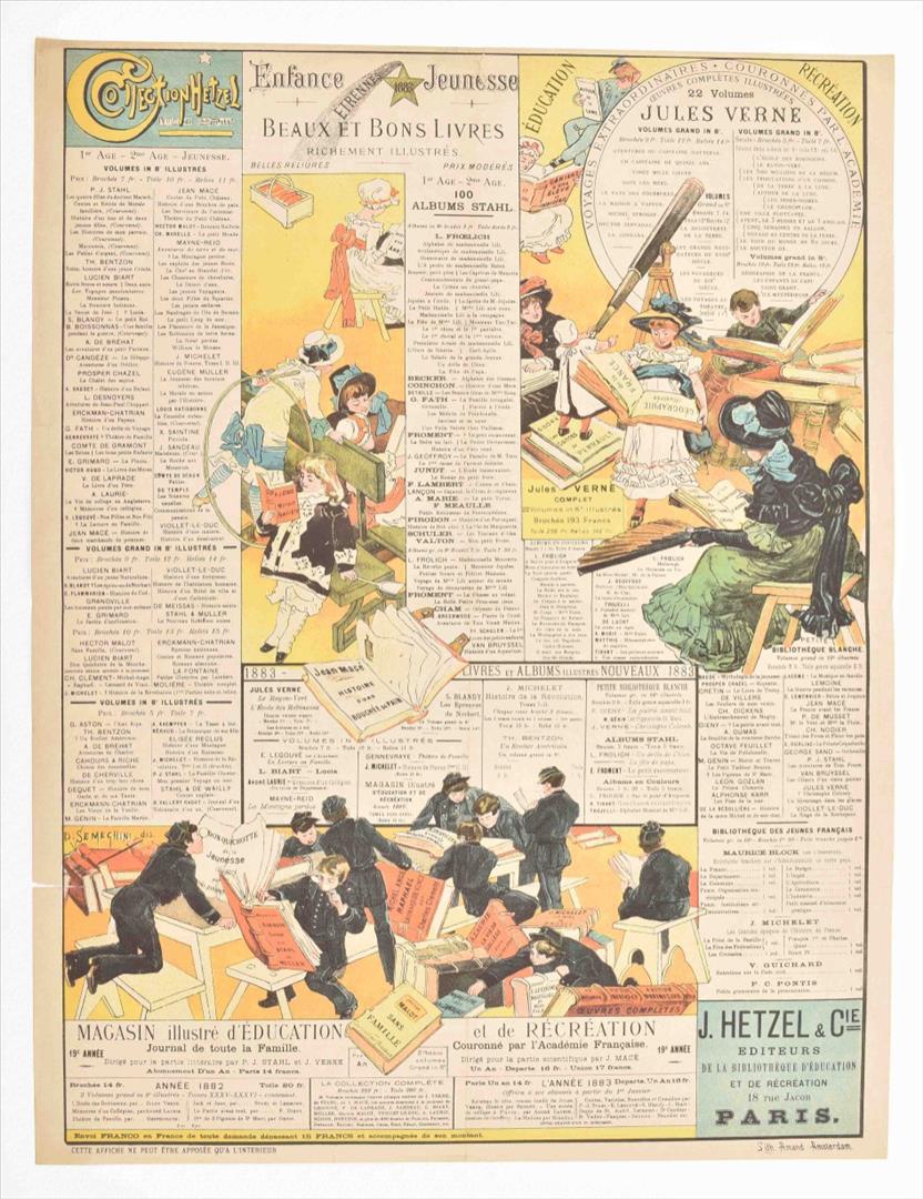 Folded, some marginal tears (mainly along folds). Beautifully designed, very rare poster, incorporating num. titles publ. by Hetzel in 1882 and 1883, incl. 22 vols. of the Voyages Extraordinaires by Jules Verne.