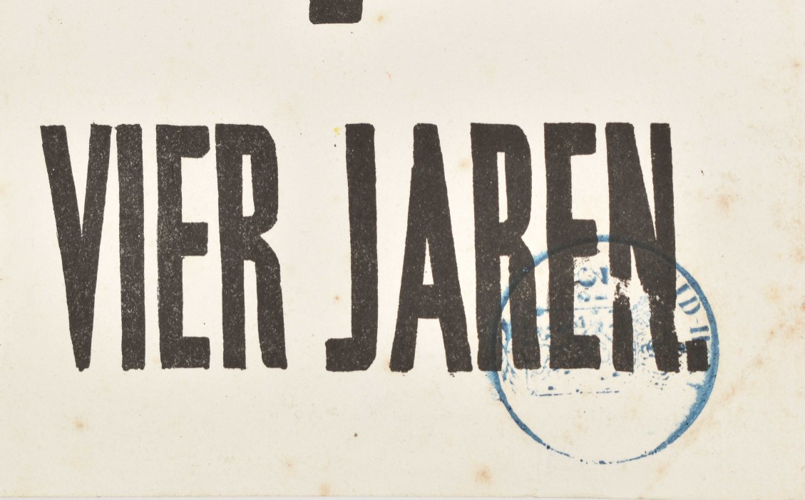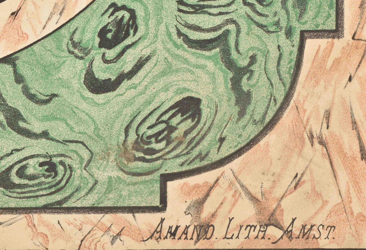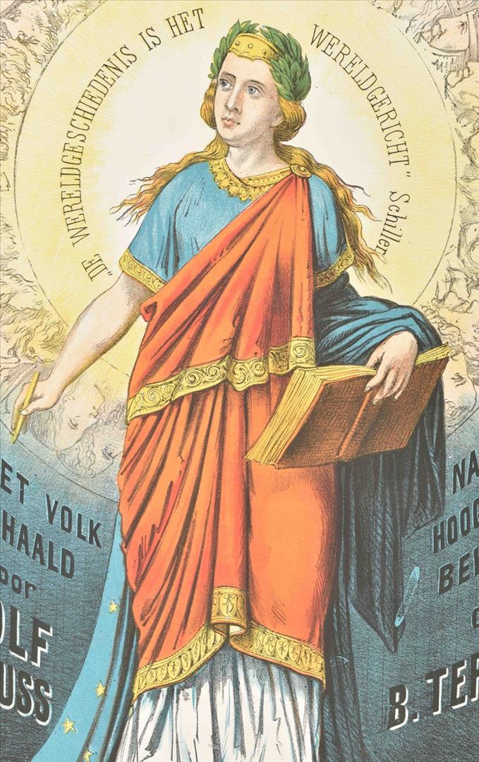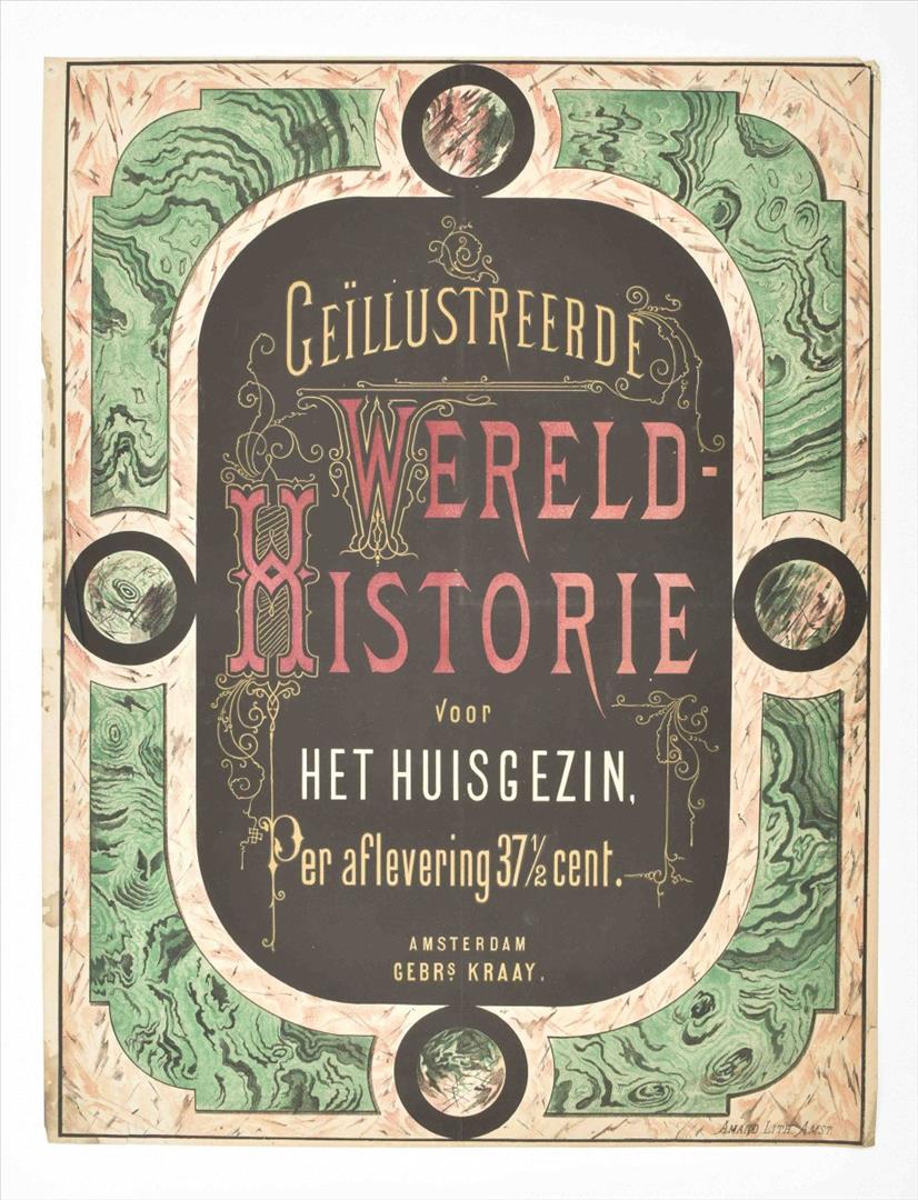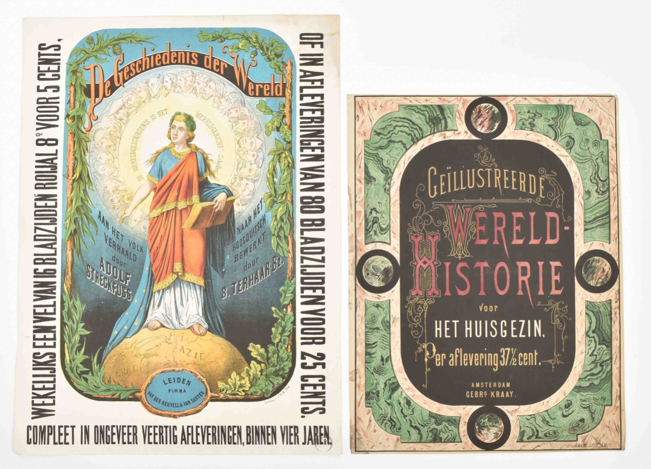 Waterst. in right margin, vaguely visible recto, tax stamp in lower right corner, a few other imperfections. The series was publ. by Van den Heuvell en Van Santen in 10 vols., from 1866 to 1877. This poster is executed in a splendidly col. printing-technique, and tax stamps were abolished shortly after this poster was produced. (2) "Geïllustreerde wereld-historie voor het huisgezin. Per aflevering 37 1/2 cent. Amst., printed by Amand for Gebrs. Kraay, n.d. (ca. 1870). Col. lithogr. poster, 60 x 46 cm. Folded, left margin stained, pinholes in upper corners and a few other imperfections. No copies of the advertised book in the NCC. (total 2)