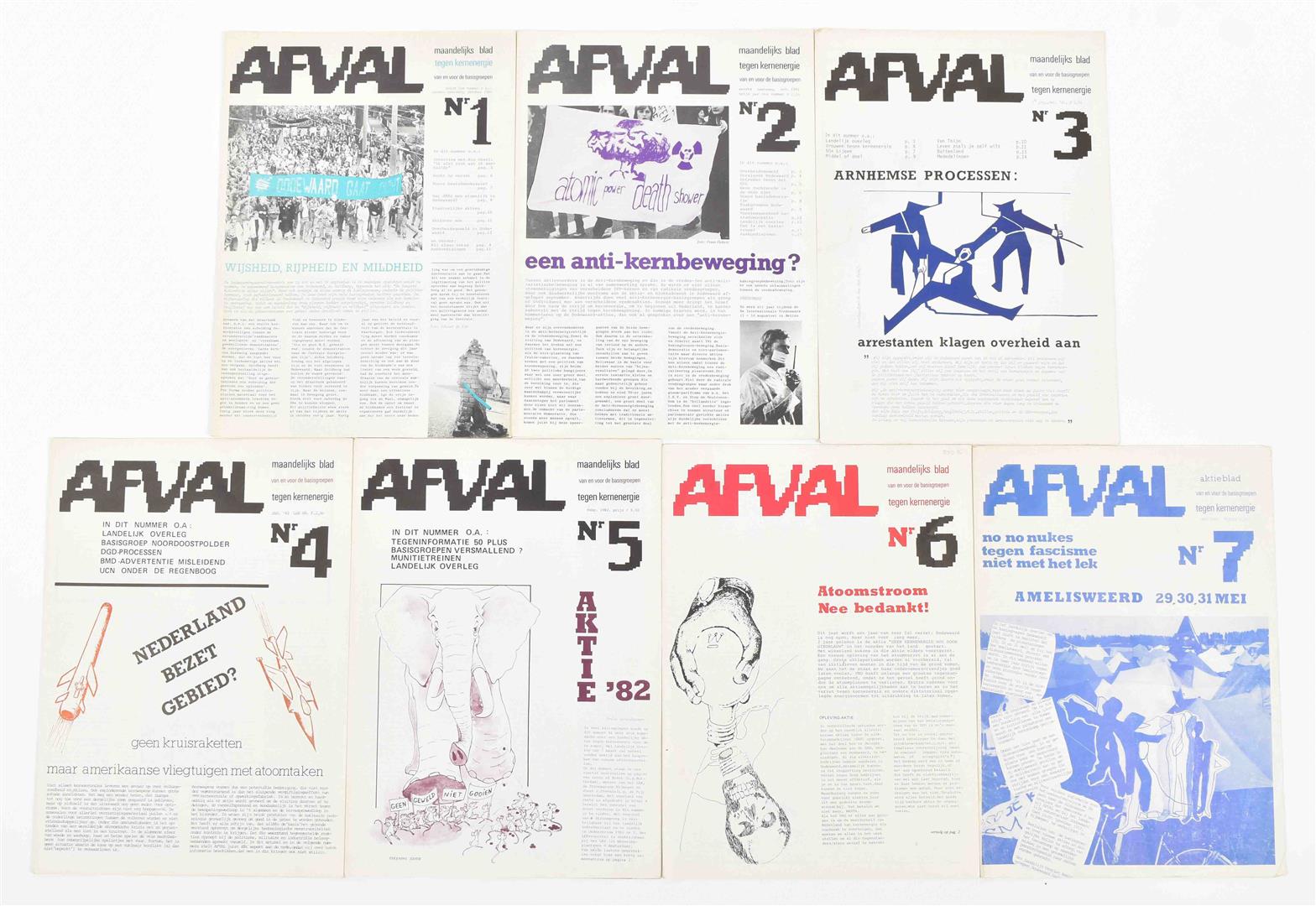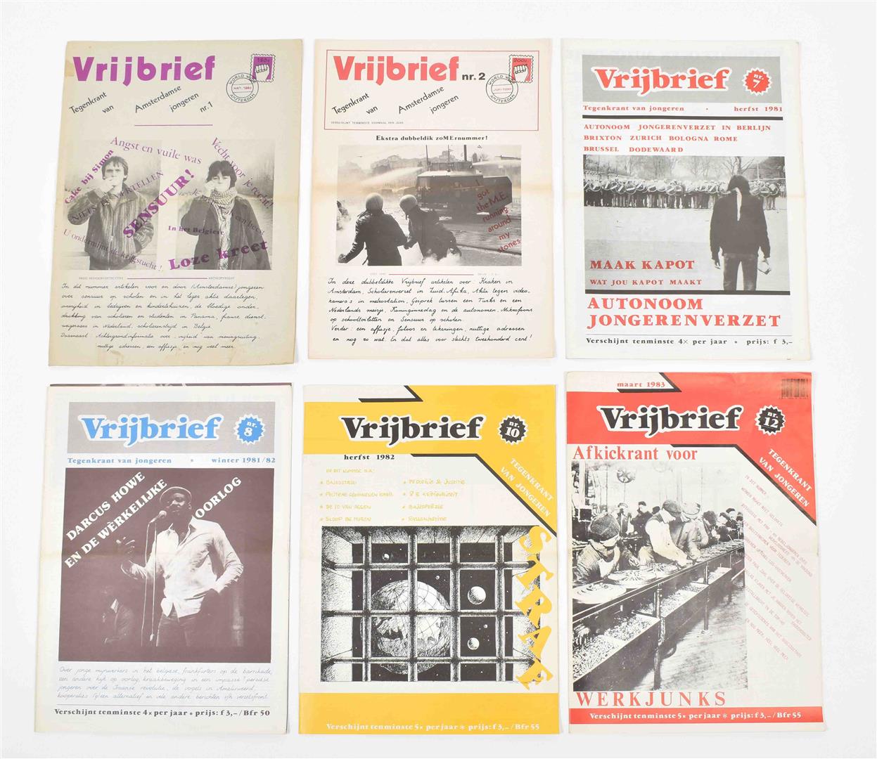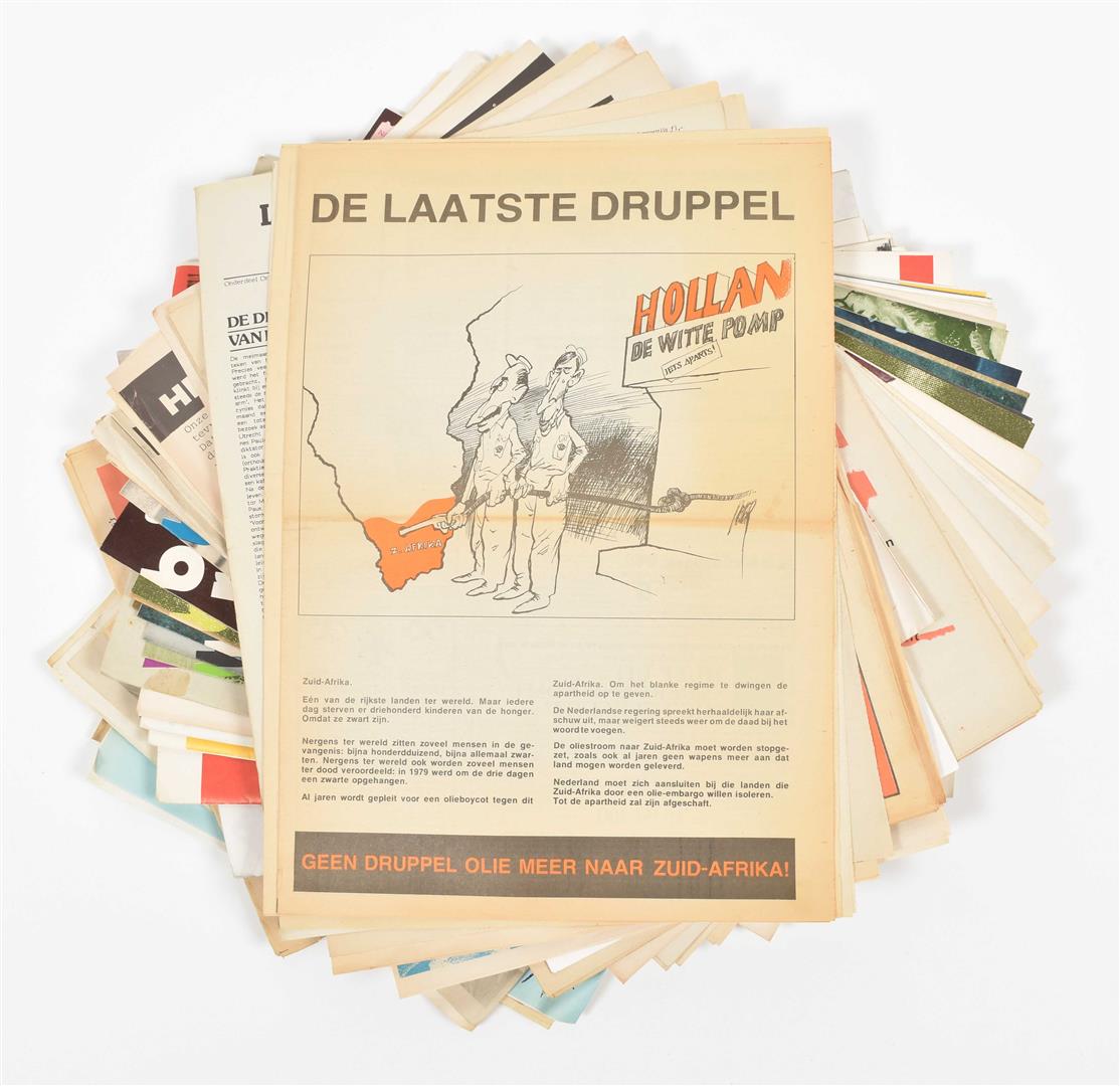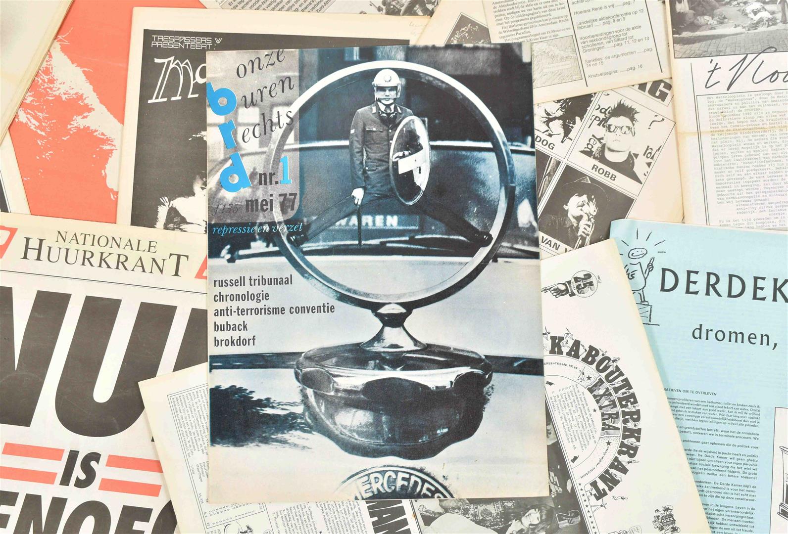 (1) Onze buren rechts. 8 issues, May 1977- Nov. 1978. (2) Vrijbrief. Tegenkrant van Amsterdamse jongeren. 6 issues, March 1981 - March 1983. (3) Afval. Maandelijks blad van en voor de anti kern energiebeweging. 8 issues, Sept. 1981 - May 1982. (4) Laagste Inkomens Krant. 4 issues, Oct. 1984 - Dec. 1985. -and 42 other similar magazines, periodicals and booklets, incl. a.o.: Mondain Den Haag, De deining, Witheek, Kabouterkrant, De krisis krant, De klerenkrant and Sub. Most 1980s.