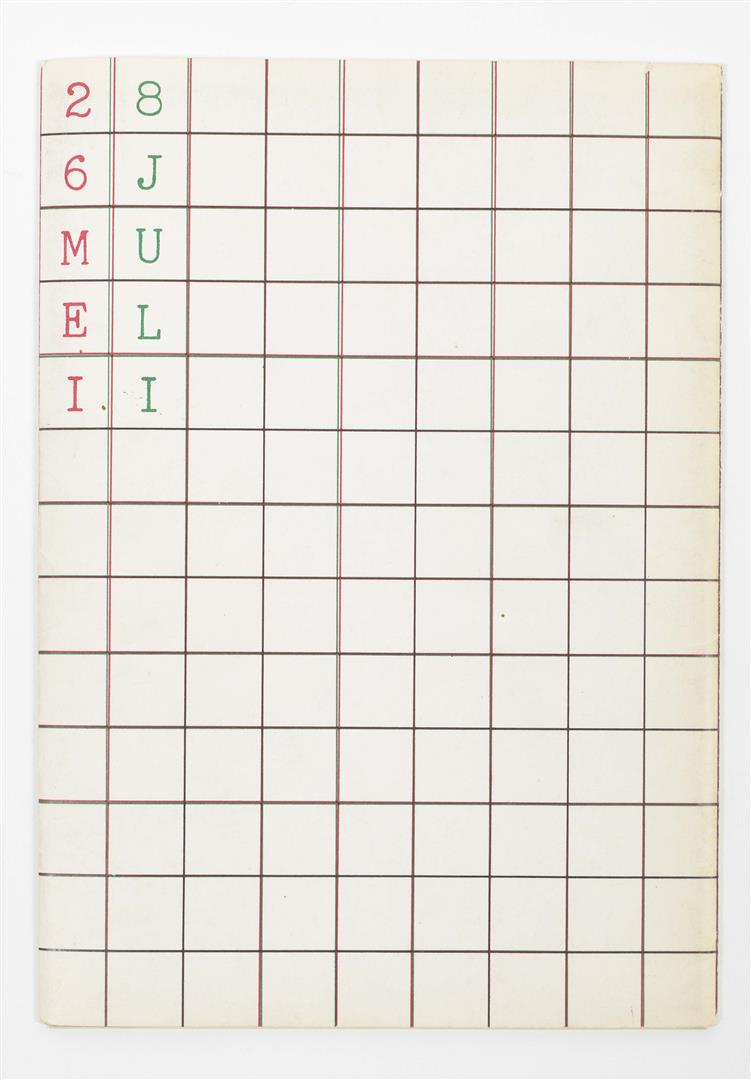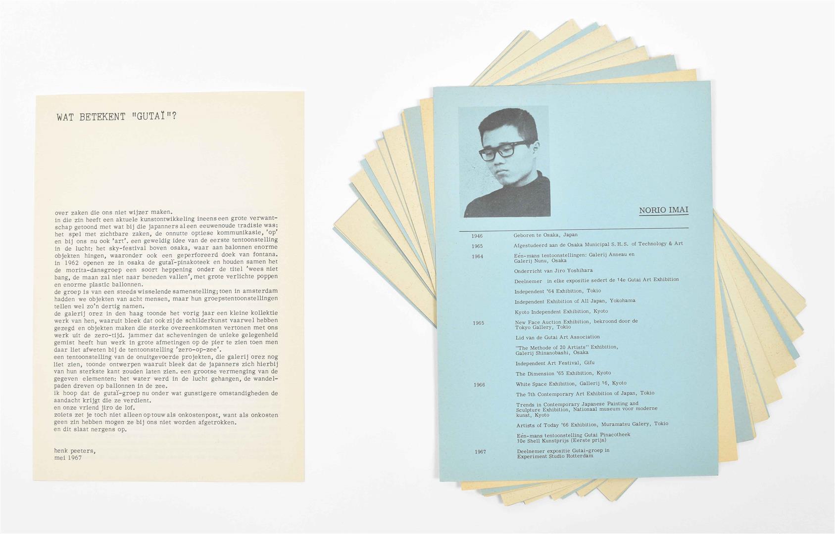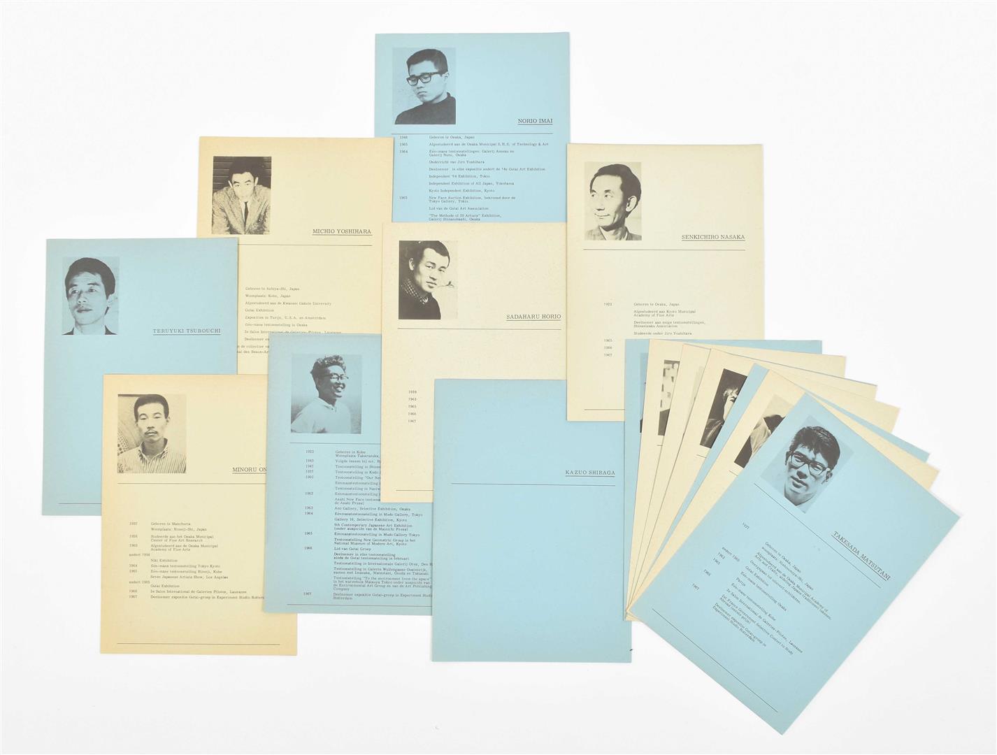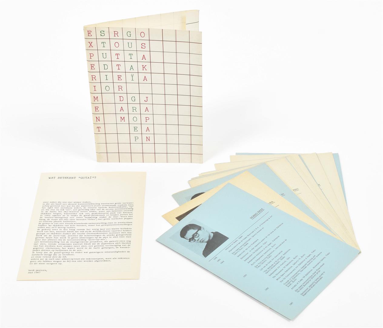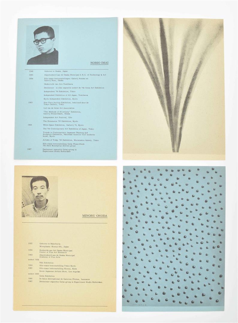 Rotterdam, Experiment Studio Rotterdam, 1967. Catalogue for a Gutai Group show, curated by Orez Gallery, with an introduction by Henk Peeters in Dutch. Comprises a printed folder, 21.5 x 15 cm, containing 17 loose inserts, printed on blue and yellow paper.