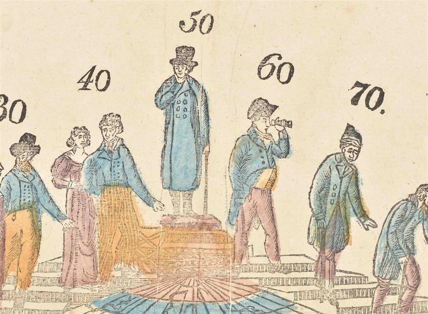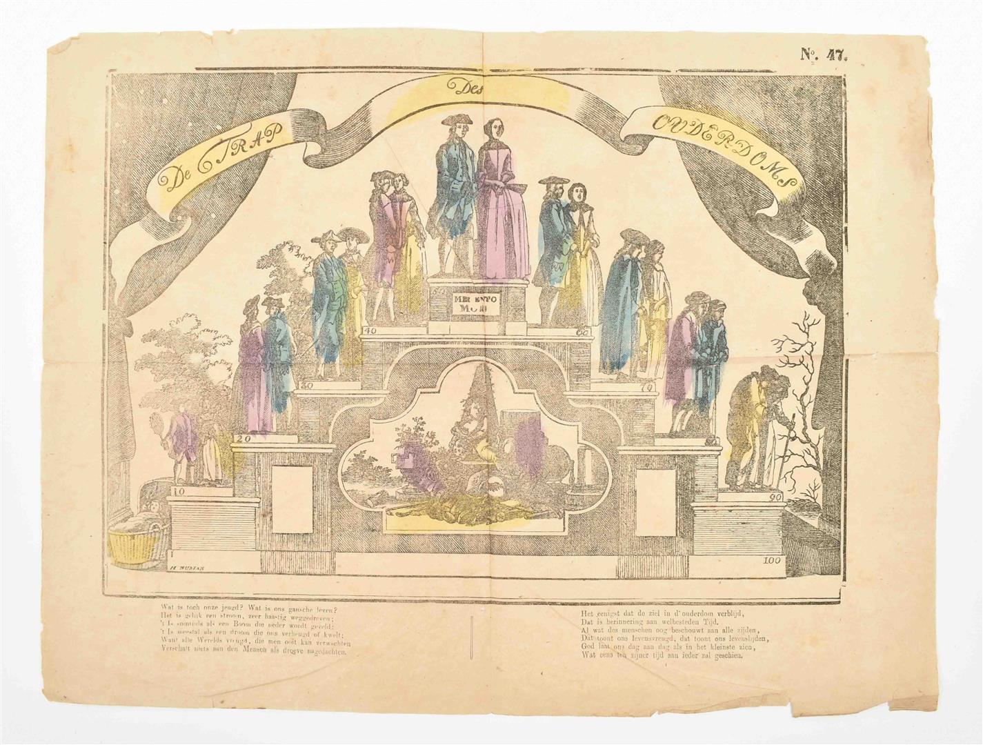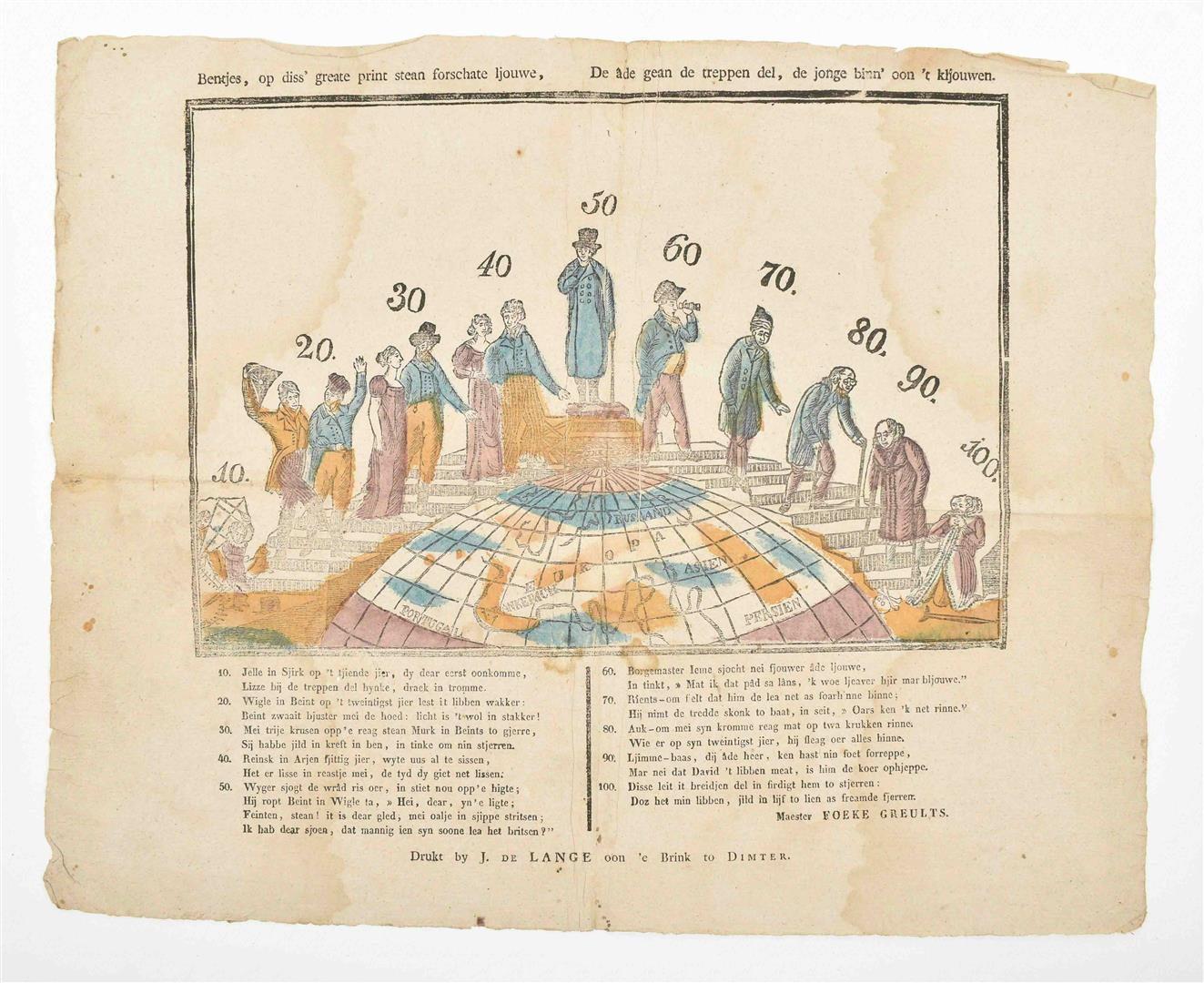 On the steps of the stairs, walking across the globe (the northern hemisphere), are figures between the ages of 10 and 100. Below the image a verse in 2 columns in Frisian. (2) H. Numan. "De Trap des Ouderdoms", no. 47. Handcol. woodcut engr. 30 x 40 cm. Between cradle and grave, a man and a woman climb the stairs of old age. Two 6 line verses in Dutch as captions. Orig. printed and publ. by Numan himself in the 18th century. This is most likely a reprint publ. by P.C.L. van Staden in Amst. between 1850 and 1870. Both prints mildly creased and worn, sm. tears/ holes. Very rare. (total 2)
