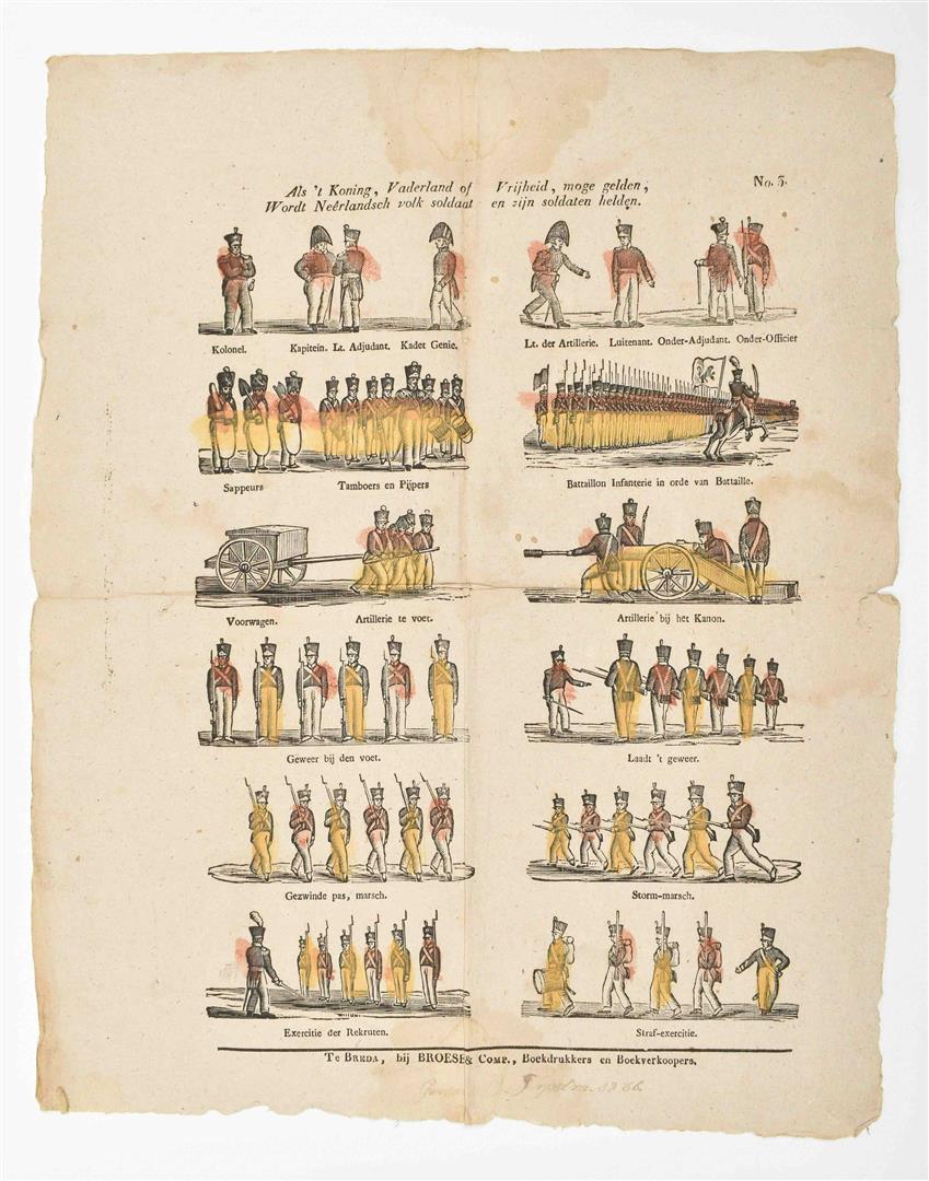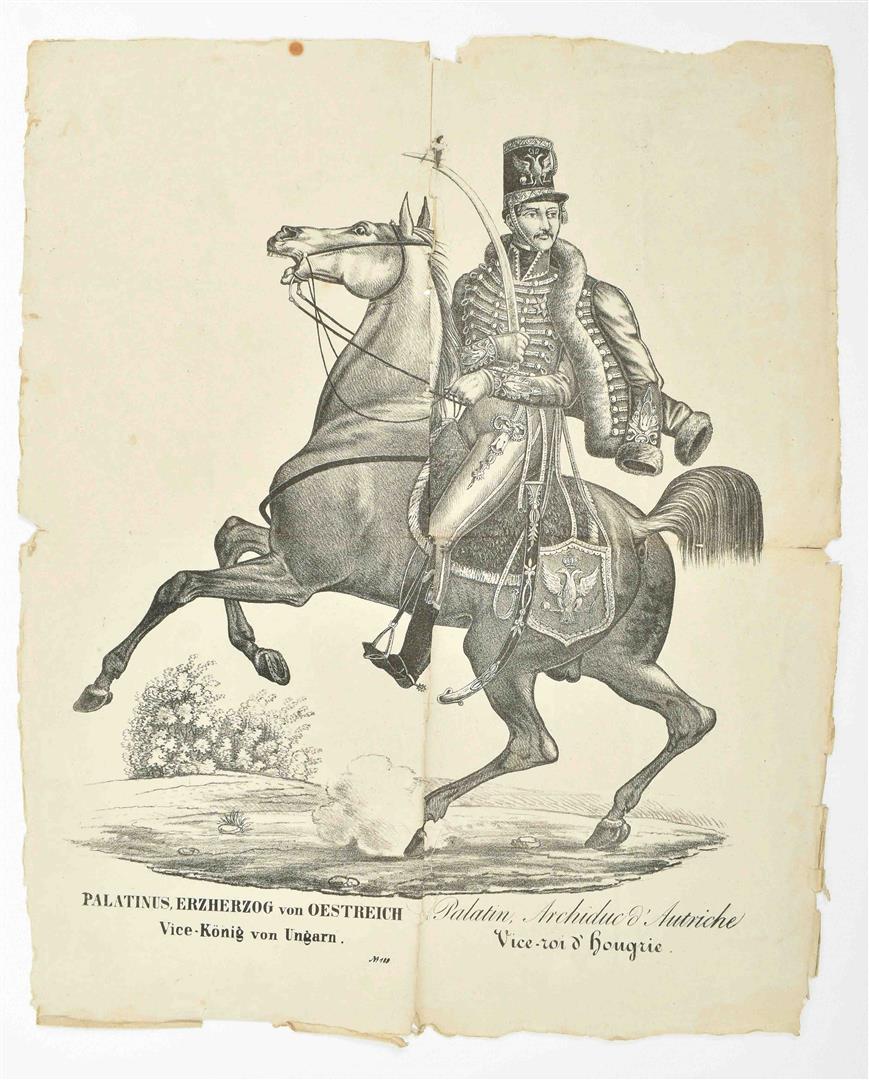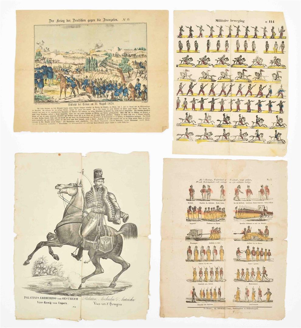 (2) "Militaire beweging". (Turnhout, Glenisson & Zonen, ca. 1856-1900). Handcol. woodcut engr. 40 x 30.5 cm. Depicts 8 horizontal rows of soldiers w. a total of 71 representations, for example soldiers on horseback and foot soldiers. No. 114 top right. (3) "Als 't koning, vaderland of vrijheid, moge gelden, / Wordt Neêrlandsch volk soldaat en zijn soldaten helden". Breda, Broese & Comp., n.d. (1828-53). Handcol. woodcut engr. 42 x 33 cm. 6 rows of 2 images each. Depicts var. ranks in the army in the top row; 2nd row sappers, drums, pipers and a battalion of infantry; 3rd row artillery w. front carriage and cannon; bottom 3 rows of exercises for foot soldiers. Each row w. short captions. No. 3 upper right. Ca. 1836. (4) Print of "Palatinus, Erzherzog von Oesterich". Title in German and French. No. 189 on bottom. All prints folded, some w. sm. (repaired) tears and waterst., edges worn. All very rare. (total 4)