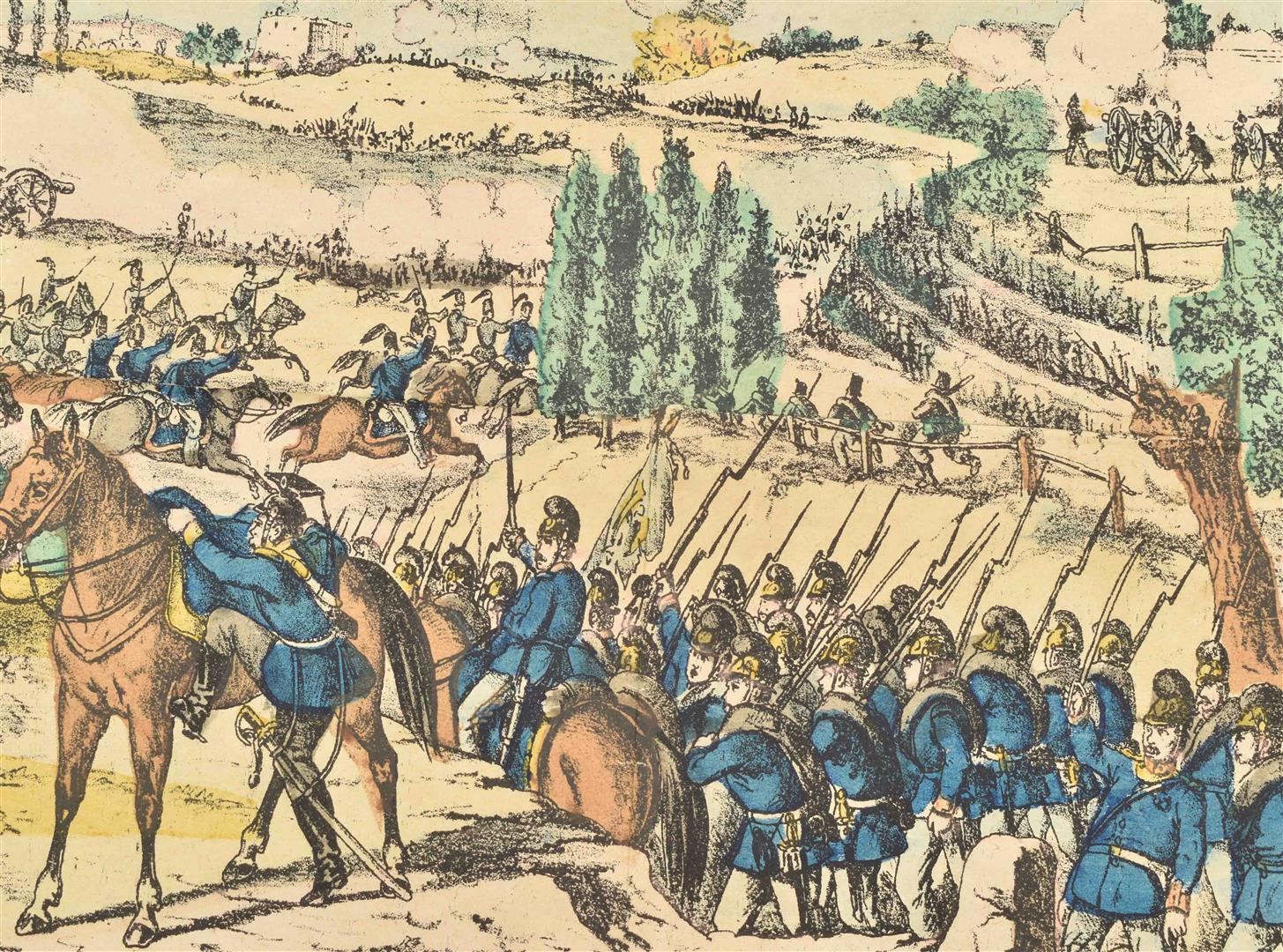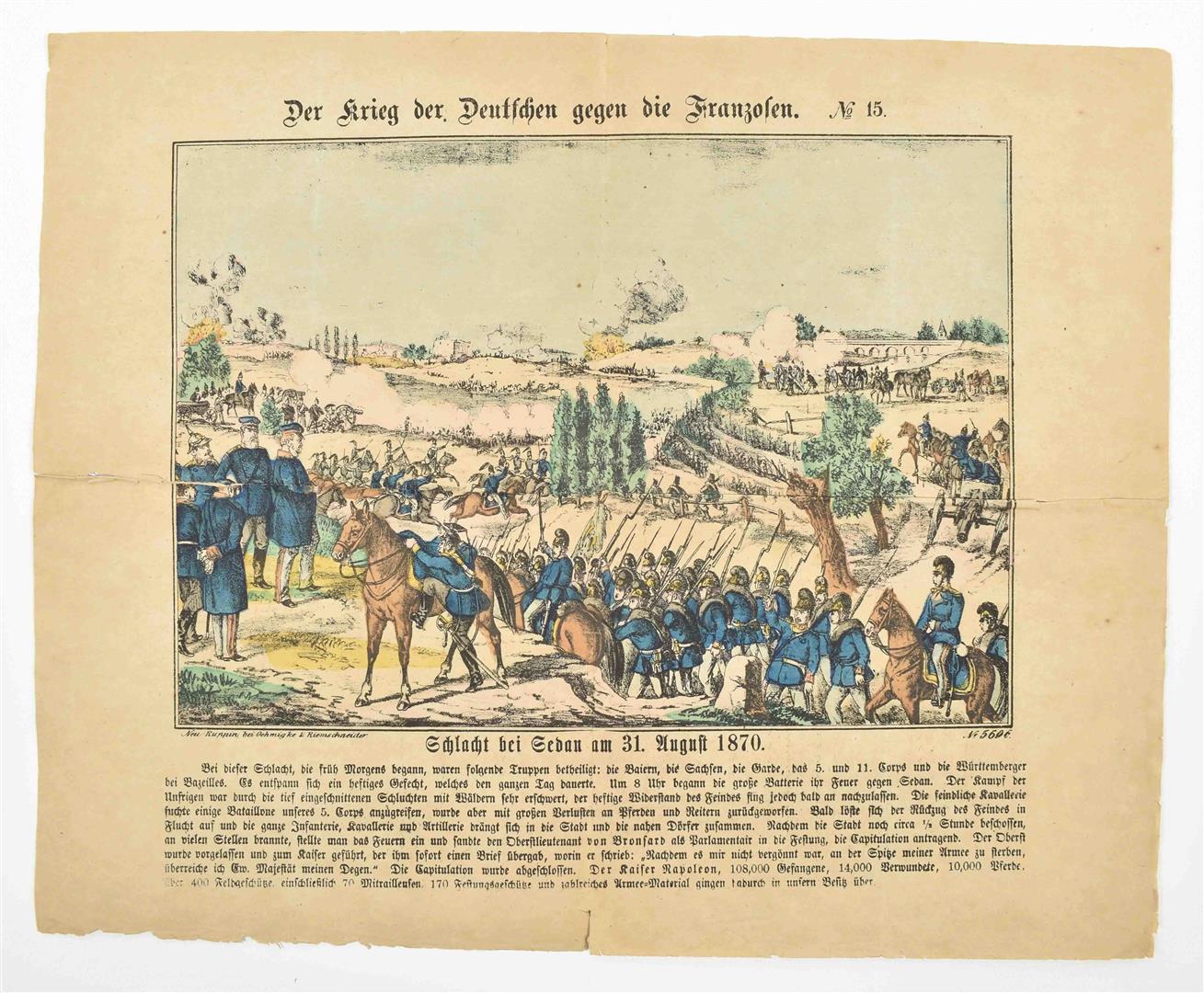 No. 15. Schlacht bei Sedan am 31 August 1870". Oehmigke & Riemschneider, ca. 1870. Handcol. lithogr. 33.5 x 41.5 cm. Image of the Battle at Sedan during the Franco-Prussian War w. 9 line caption. Oehmigke & Riemschneider, located in Neuruppin, was one of the best-known producers of picture sheets in Germany in the 19th cent.