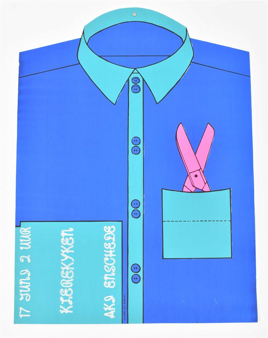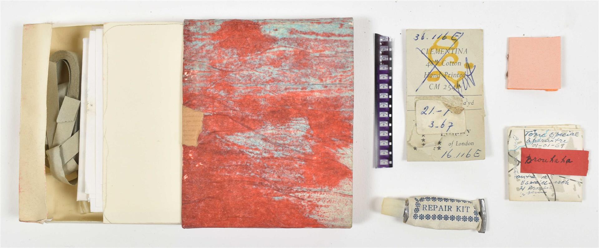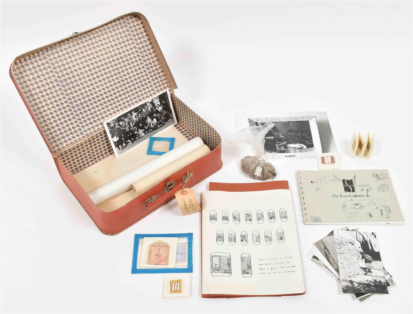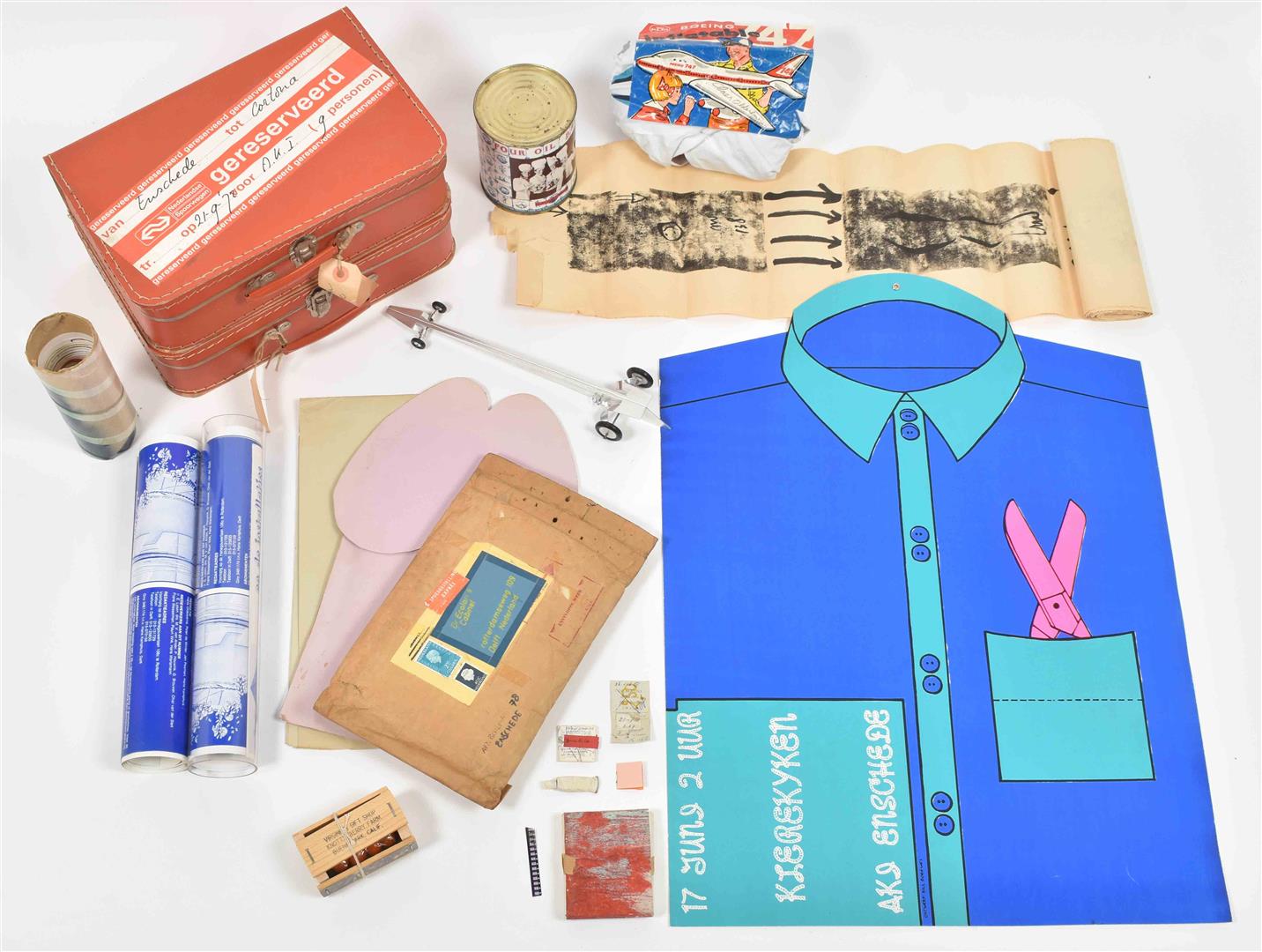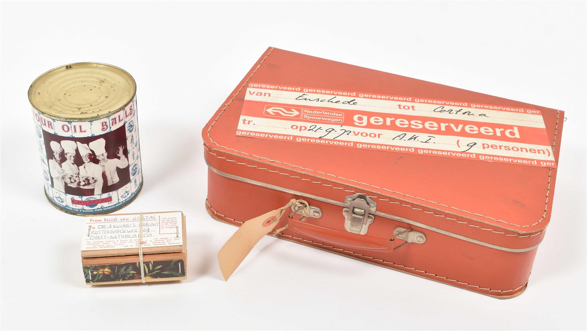 Incl. a.o.: (1) A sm. box of "California Oranges". 9 x 5 x 5 cm. (2) A can of "Four Oil Balls. Another Fine Product from the 'E' School". 12 cm tall. (3) A "Tiet boekje". (4) A toy vehicle. (5) 2 sm. suitcases. 33 x 21 x 10 cm. (6) A poster shaped like a shirt.