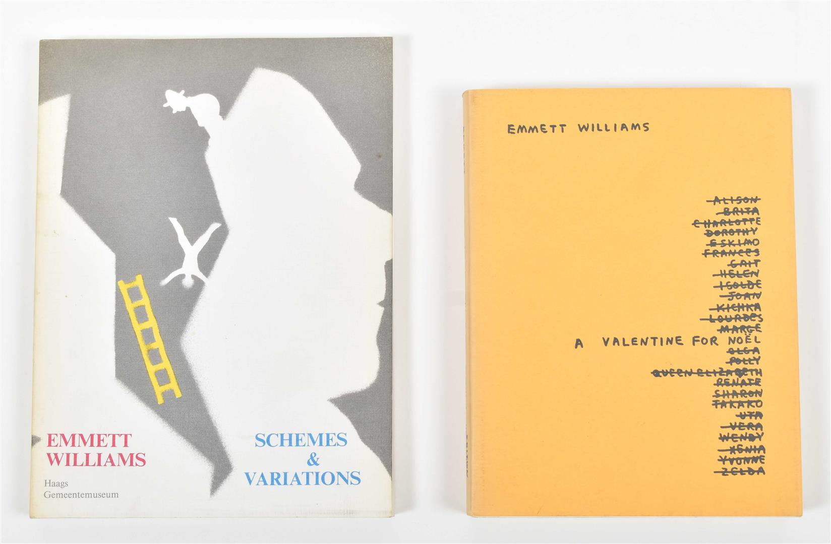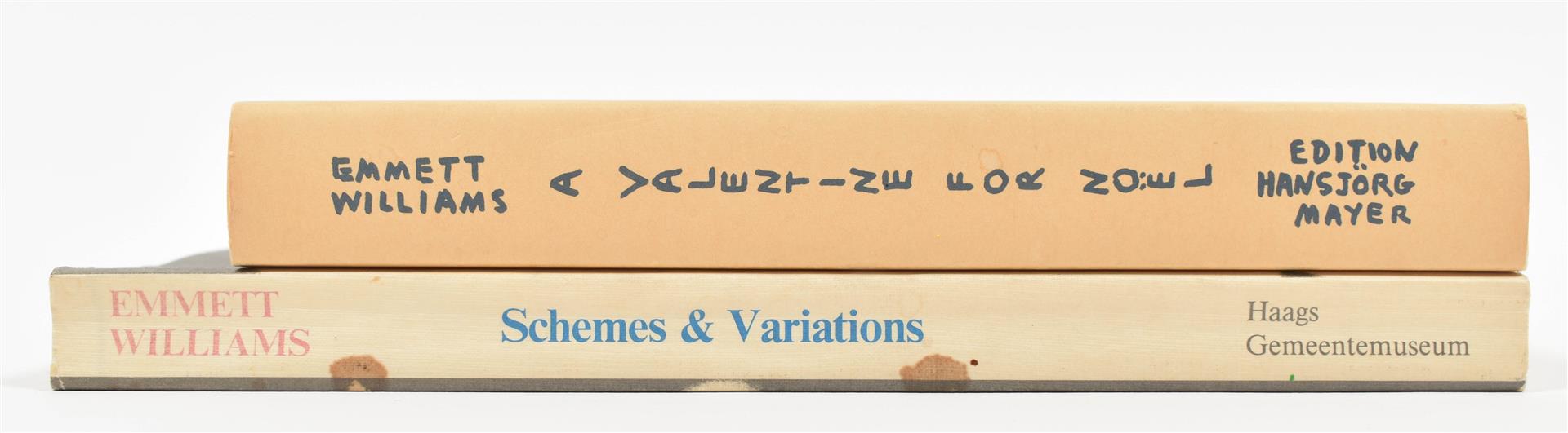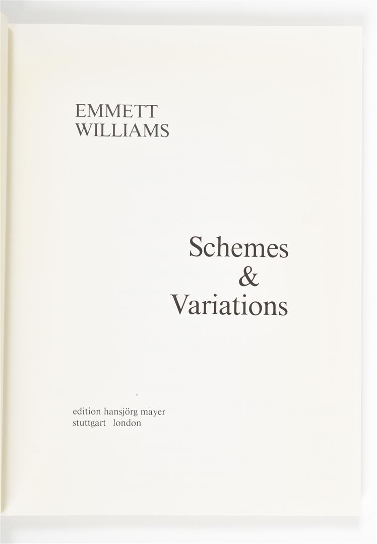 (2) Emmett Williams, Schemes & Variations. Stuttgart/London, Edition Hansjörg Mayer, 1981. Softcover, 23 x 17 cm, 254 pp., prof. ills. in b/w and colour. Published in conjunction with the show at the Haags Gemeentemuseum, The Hague. Text in English and German. Includes inlaid Dutch text leaflet. Small stains to spine, interior very good. (total 2)