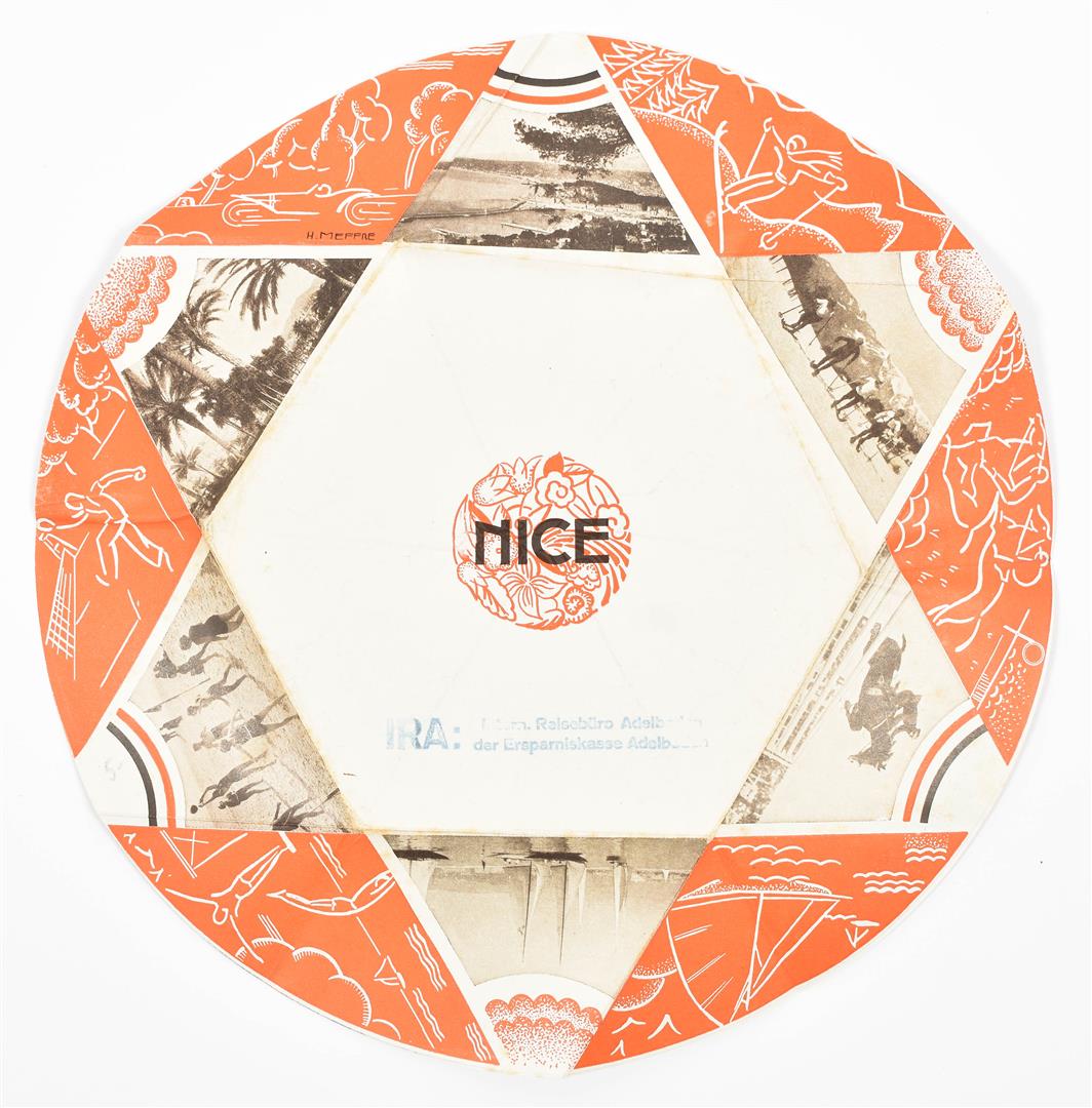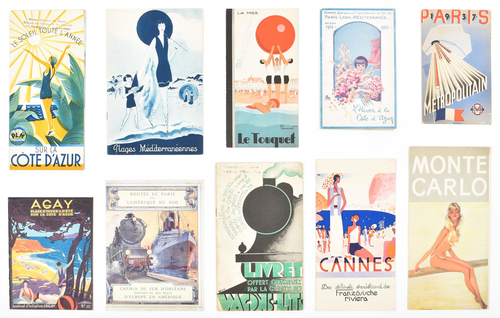 Early to mid 20th cent. Incl. a.o.: (1) A brochure for the Côte d'Azur w. a cover after Roger Broders (stamp on front cover). (2) A brochure for Touquet w. covers des. by F. Commarmond (stamp on front cover). (3) A brochure for French beaches along the Mediterranean w. cover des. by Naurac. (4) A 1937 metro map of Paris. (5) Les Cinq Capitales, publ. by Société Kléos in 1929. (6) A brochure advertising different routes from Paris to South America.