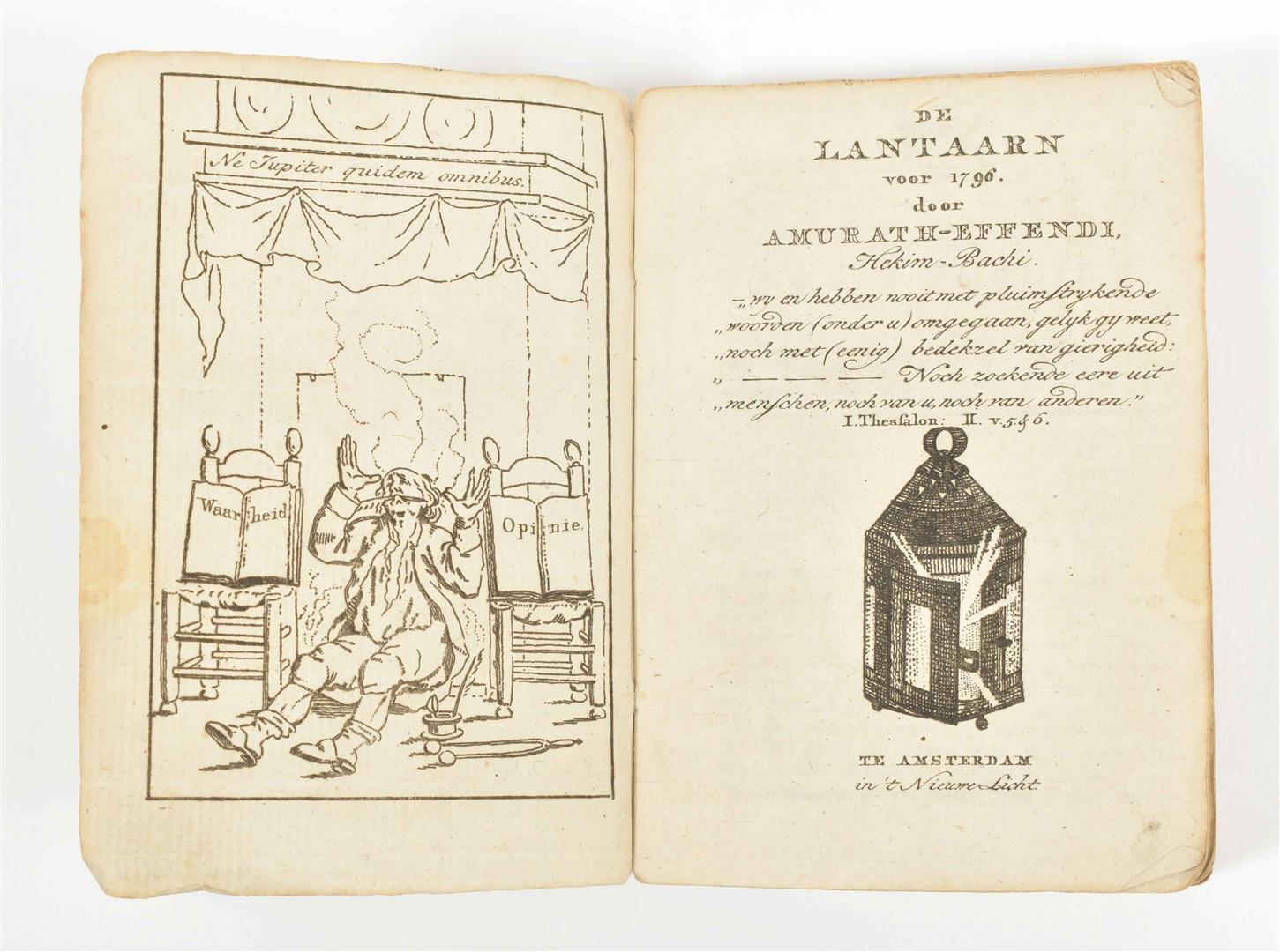 Amst., A. Borchers, (1781). (26),106,(2) p. Engr. title-p. vignette w. portrait of Catharine II by Wagenaar after G. Bogerts. Contemp. vellum. Sm. 8vo. Good condition. Rare work by the personal Dutch physician of Catharine II. Only 3 listed in WorldCat. Added: Idem, under pseud. Amurath-Effendi, Hekim-Bachi. De lantaarn voor 1796. Amst., In 't Nieuwe Licht, (1795). (10),206 p. Engr. title-p. w. vignette of a lantern, 9 etched plates. Contemp. ill. wr. 12mo.