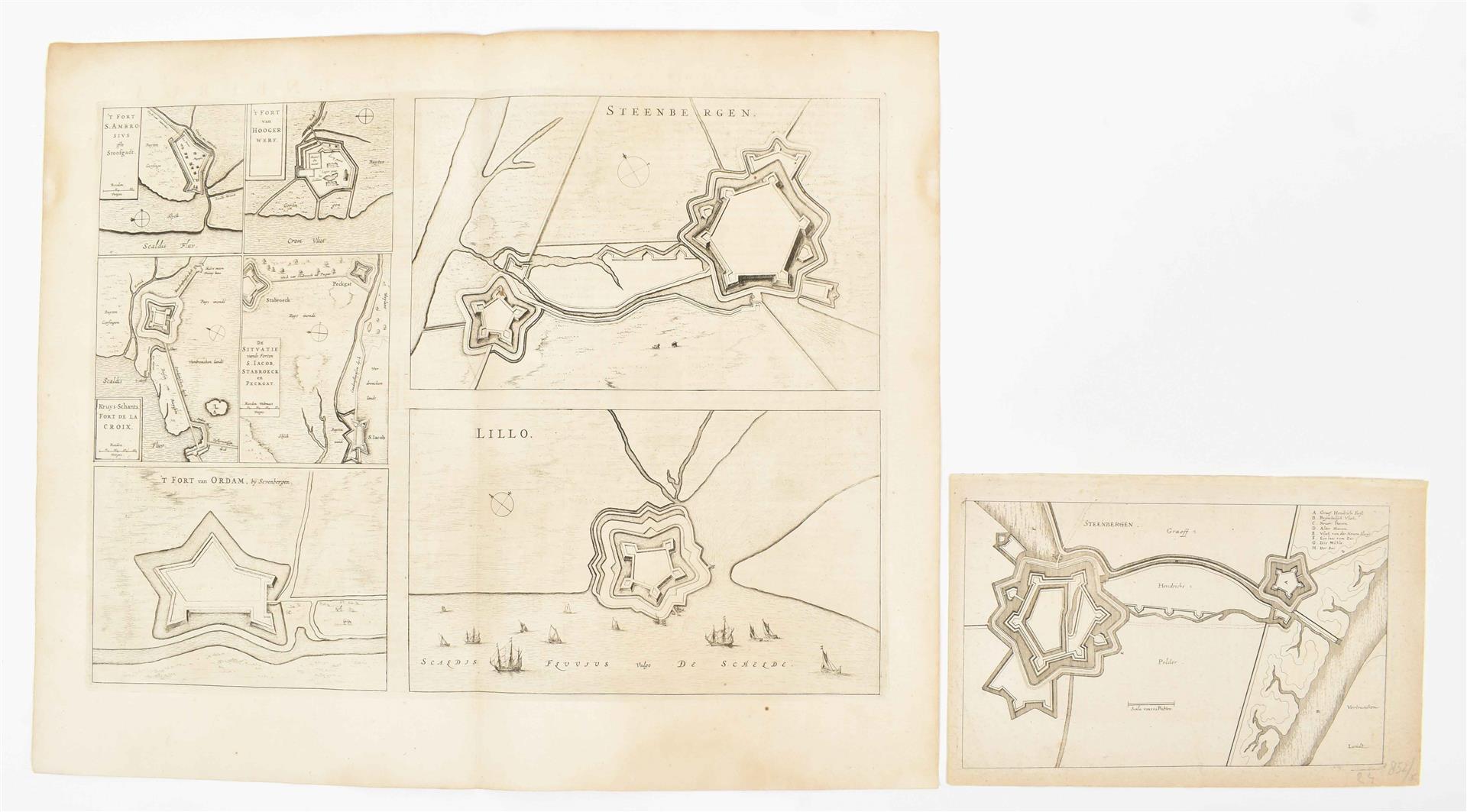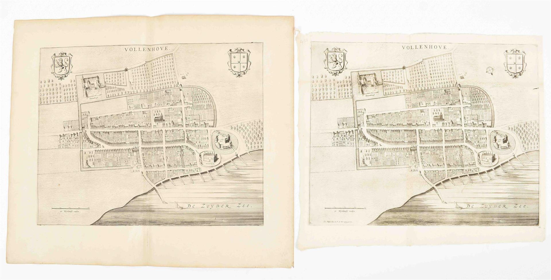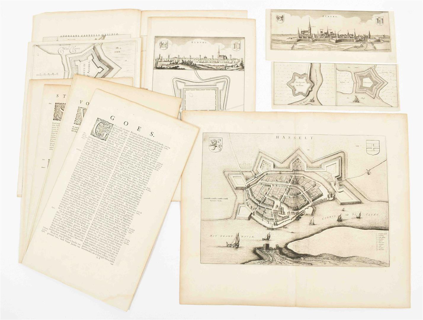 Double-p. engr. bird's-eye plan, 35 x 50 cm. From Blaeu's Townbook, Amst., 1649. (2) The same plan, w. address Amst., F. de Wit, ca. 1698. Fold. (3-4) The same combination as the 2 preceding plans, from the same works, showing a double-p. plan of Vollenhove. (5) "Tolen". Double-p. engr. bird's-eye plan, 41.5 x 50 cm. From Blaeu's Townbook, Amst., 1649. -and 3 more double lvs. from the Townbook by Blaeu (plans of Goes, Steenbergen, St. Andries/ De Voorn, etc.) and 1 single leaf (Elburg) from the work. Also incl. lvs. from other works w. plans of Goes (3x), St. Andries and De Voorn/ Schenkenschans (3x), Steenbergen, Tholen, and profiles of Tolen and Elburg.