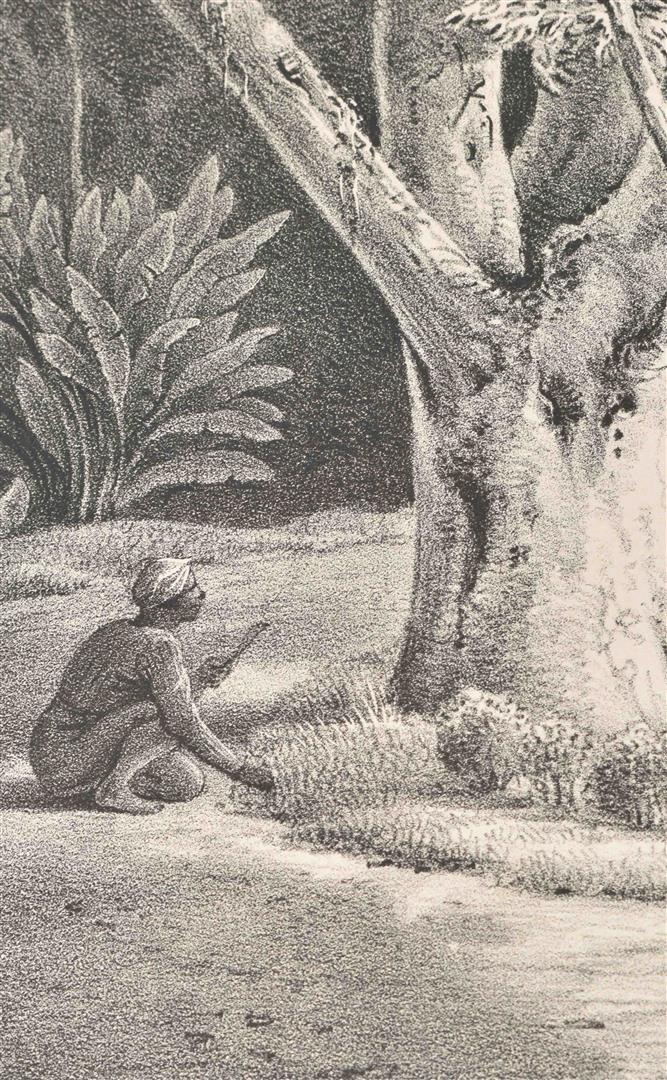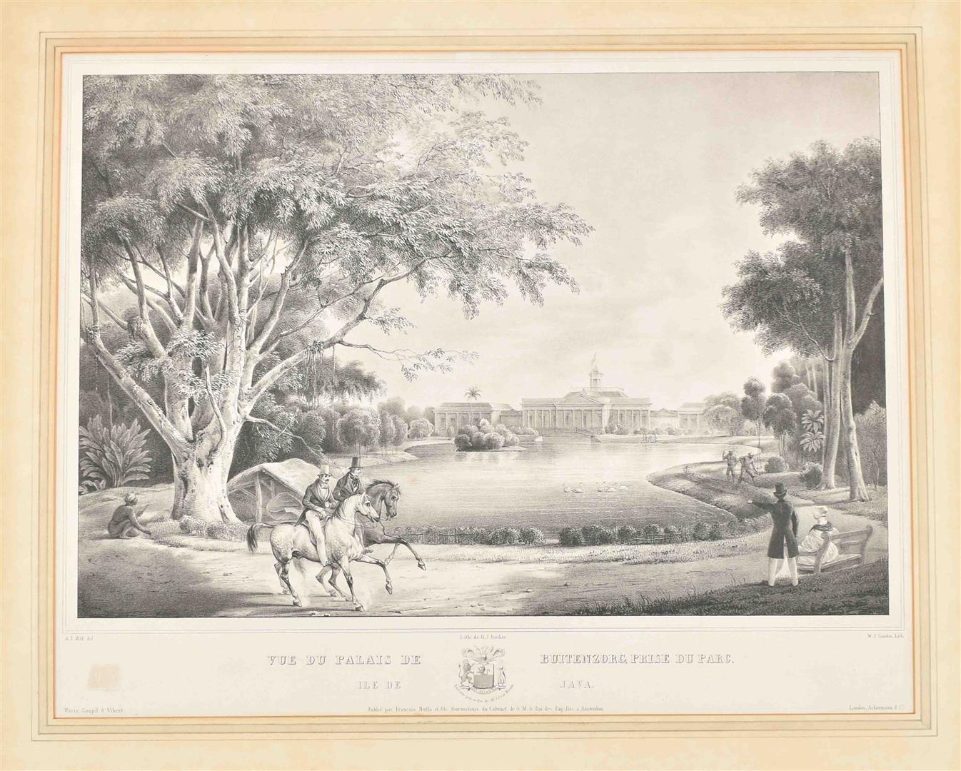 A few foxed spots, otherwise fine. With the blindstamp of Buffa and Sons in lower left corner. Fine and rare, large view. Description of the Rijksmuseum: "Het paleis in de Plantentuin te Buitenzorg (West-Java) met op de voorgrond twee mannen te paard en recreërende mensen. Prent maakt deel uit van een album met een serie van zes lithografieën van gezichten te Java en een titelprent." The title of that album: Vues de Java, dessinées d'après nature et lithographiées sous la direction de monsieur J.J. van Braam.