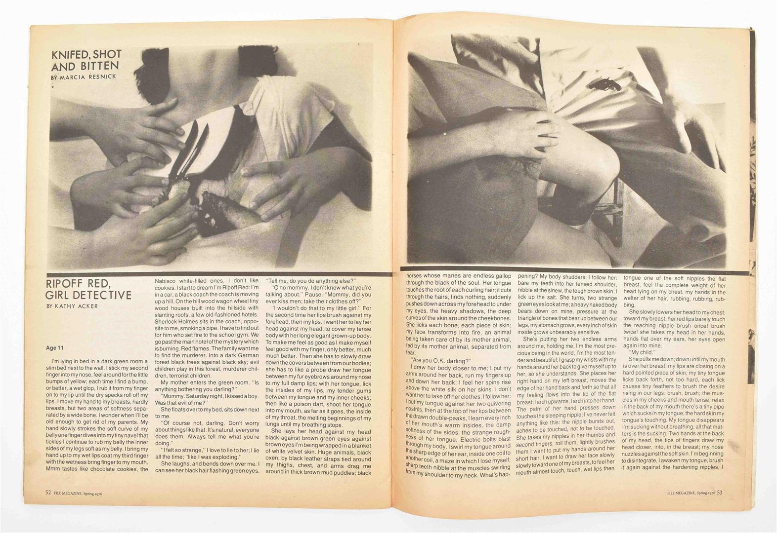 (2) File Megazine Vol 3, No.2, Spring 1976: New York City Edition. Toronto, Art-Official, 1976. Softcover, 36 x 27.5 cm, 64 pp. Contributions by General Idea, Les Levine, Marcel Just, Marcia Resnick, Kathy Acker, Jim de Sana and others. Pronounced wear on covers, interior with small stamps of Rotterdamse Kunststichting, else fine. (total 2)