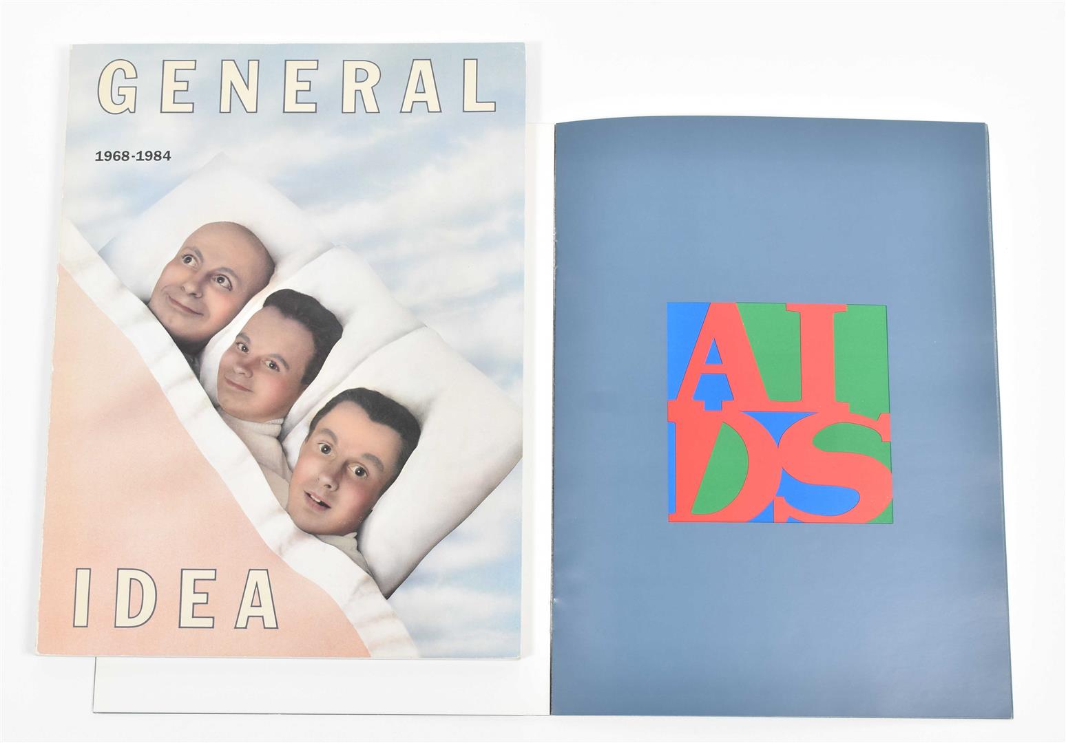 (2) General Idea: The AIDS Project. Toronto, Gershon Iskowitz Foundation, 1989. Softcover, 27.5 x 20.5 cm, 28 pp. ills. in b/w and colour, essay by Allan Schwartzman. Published in celebration of the 1988 Gershorn Iskowitz Foundation Prize given to General Idea for their AIDS projects. Embossed Ex Libris on first page, profound rubbing on cover, interior mint. Scarce. (total 2)