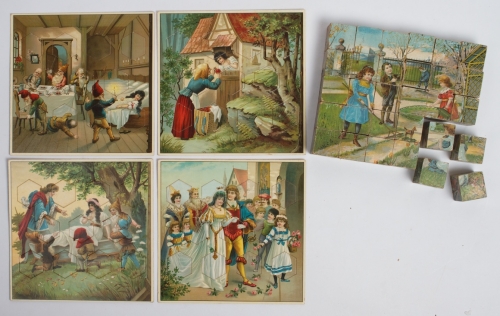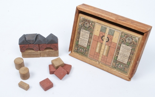 Ca. 1900 - 1920. Anker Steenbouwdoos 15x20 cm. + Spreekwoorden-Lotto. Een gezelschapsspel voor groot en klein; 6 lithogr. plates. Box damaged along extremities. Otherwise in good condition. + Block puzzle; 30 blocks, lithogr. on all sides - and 3 others, partly incomplete.