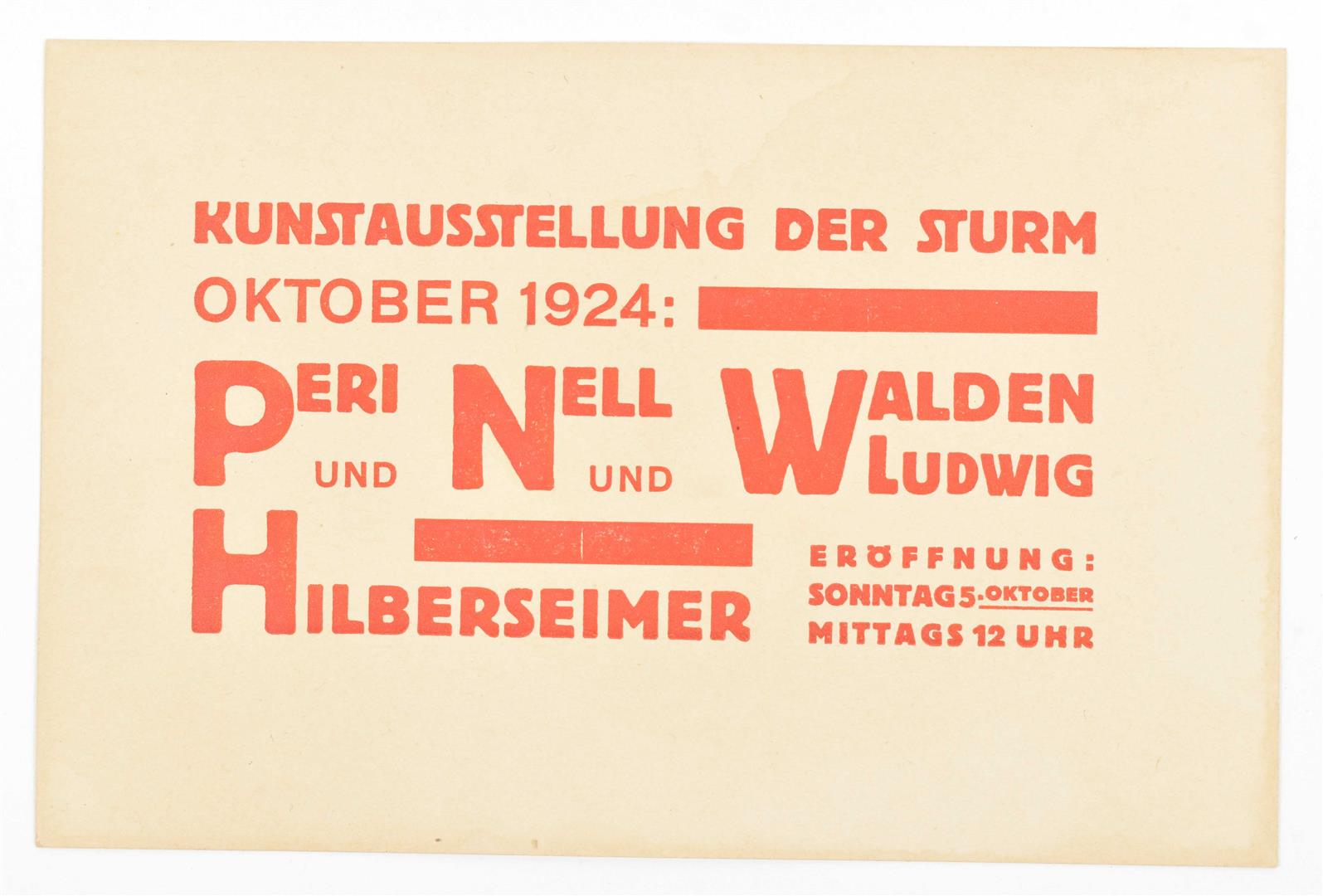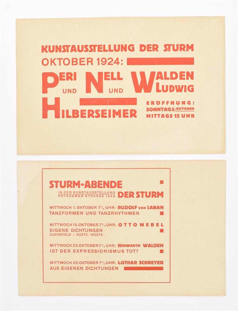 (1) "Kunstausstellung der Sturm Oktober 1924: Peri und Nell Walden und Ludwig Hilbersheimer. Eröffnung: Sonntag Oktober Mittags 12 Uhr. " (2) "Sturm-Abende in der Kunstausstellung (...) der Sturm (...)". Two letterpress invitation cards printed in red, both 10.3 x 15.8 cm., n.pl., n.publ. (Berlin, Der Sturm), 1924.